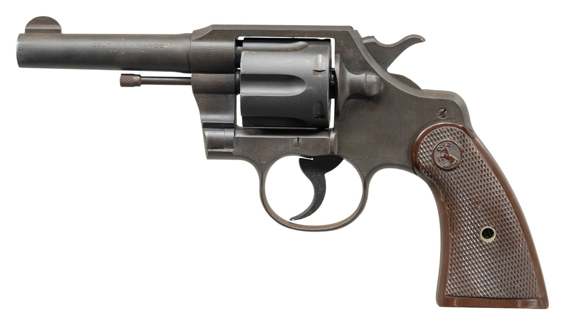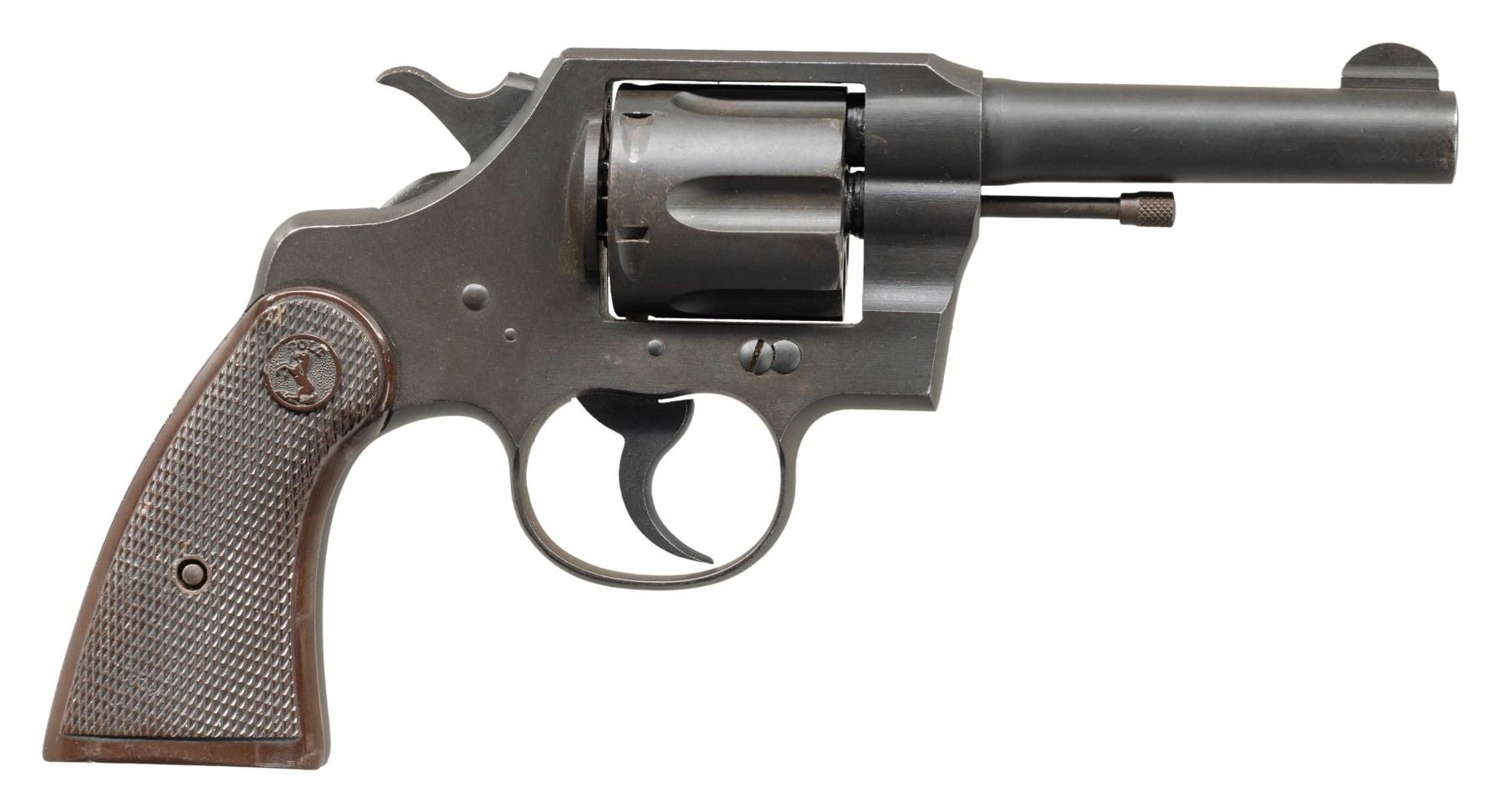 Cal. 38 Special. S# 6902. Bbl. 4". Commando double action revolver mfg. by Colt for the U.S. military circa. 1942-1943. Left side of the bbl. is marked with the model and cal. designations, with Colt's mfg. and patent information marked across the top. Left side of the frame is marked with a U.S. flaming ordnance bomb above the cyl. latch. Metal components exhibit a parkerized finish overall. Frame is mounted with 2-piece Colt checkered brown synthetic grips. Half-moon blade front sight with frame notched rear sight. All serialized parts are matching and include the frame and cyl. crane. CONDITION: metal components retain the majority of their arsenal parkerized finish, showing some light to mild wear and thinning on either side of the bbl., with scattered spots/patches of light to mild surface oxidation present overall. Near mirror bore, exhibiting some spots of what appears to be either hardened grease or light pitting, while retaining well defined rifling throughout. Proper manual mechanics. Grips show some light smoothing, as well as some superficial handling marks, but otherwise remain sound. (25-5795/MLW). CURIO. $800-1,200.