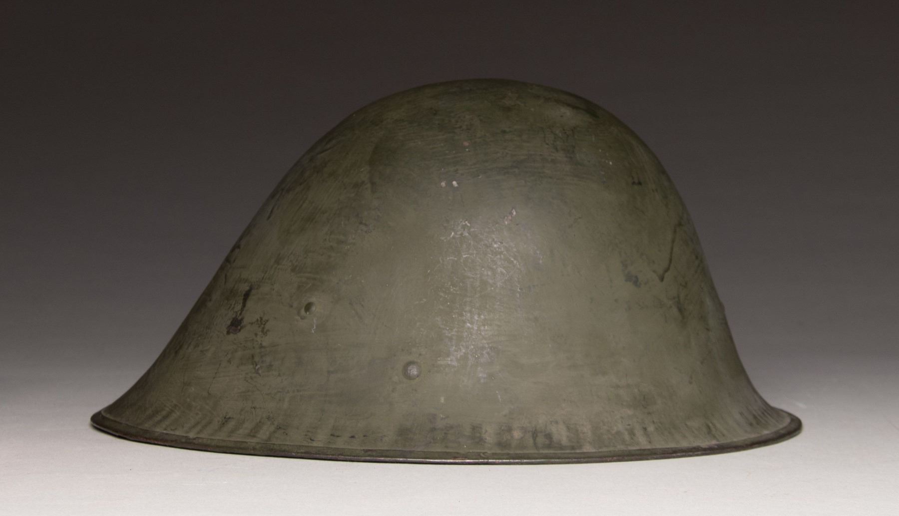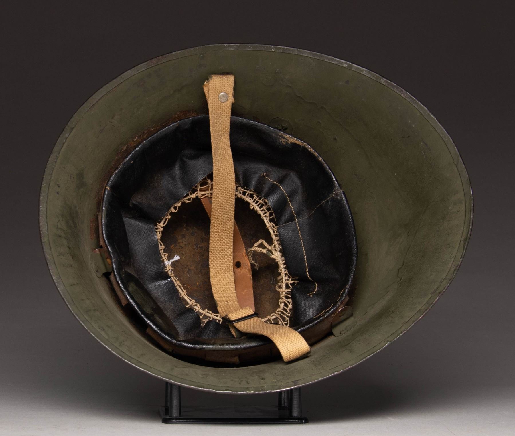HELMET. US Model 1918 "Liberty Bell" helmet designed by US Army Major James E. McNary as a replacement for the Model 1917. Between 1,000 & 2,000 of these helmets were reported to have been made in France but they were disliked by American troops & rejected. This particular helmet features a scarce M1917 Brodie style leather liner & canvas chinstrap. Green paint that maybe newer. CONDITION: paints shows scattered runs, scuffing, oxidation most heavily on inside of dome & age related wear. Strap shows newer with some staining. Liner shows scattered flaking & age related wear. (02-25145/MJC). NON-GUN. $1,000-2,000.