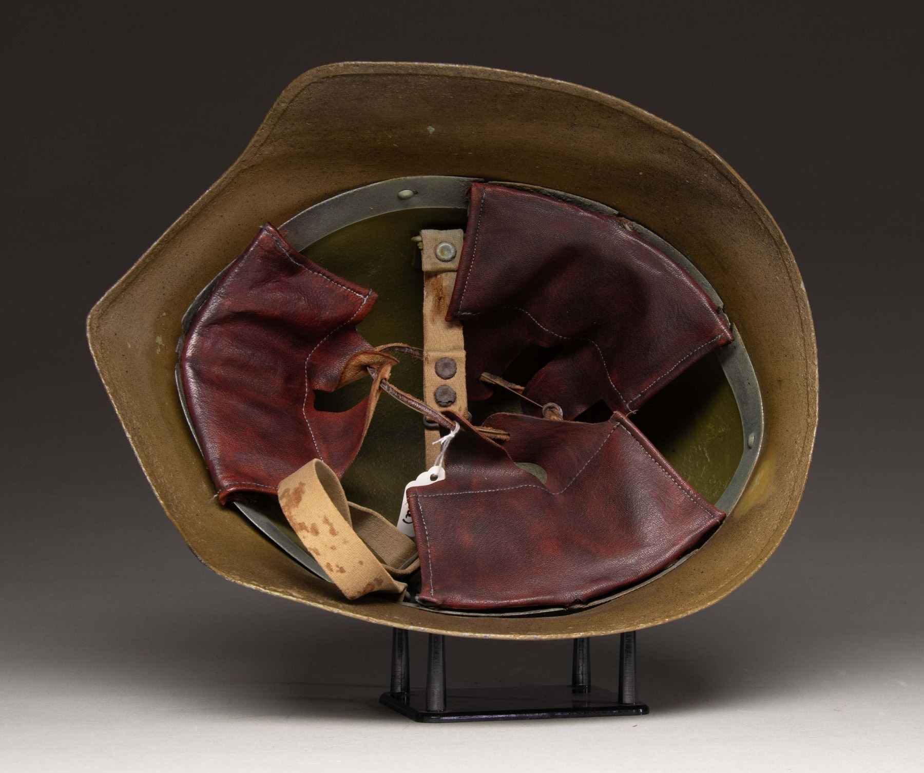 Scarce WW1 US "Deep Salade" helmet. Designed in 1917 with only 2000 units made by Ford in 1918. The helmet was based on 15th century helmets of Italy. The helmet offered better protection than French & British designs of the period but was rejected due to its similar appearance to German M16 helmets. Helmet features a nicely restored green sandy-textured paint. Leather pads inside are newer replacements. Liner & chinstrap present. Also present are what appear to be a separate original leather pad in worn condition; CONDITION: paint shows show light flaking & oxidation. Leather & canvas show scattered staining & age related wear. (02-25143/MJC). NON-GUN. $1,000-1,500.