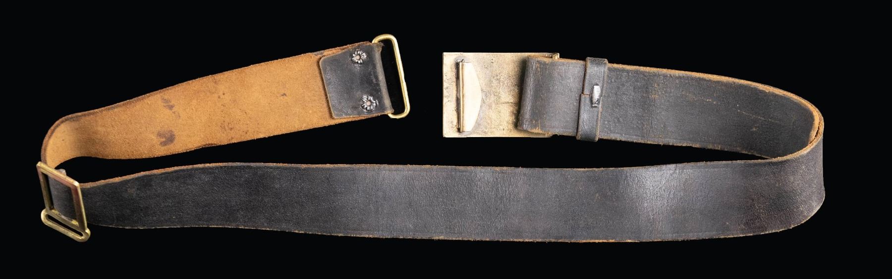 BELT & BUCKLE.This is a seldom seen belt and buckle from the Spanish-American War era with a 1 3/4" wide belt having a brass equipment clip. The buckle is 2 3/4" x 2" and features a stippled background with "USV" in an oval. CONDITION: light wear overall. (02-26083/BF). $400-600.