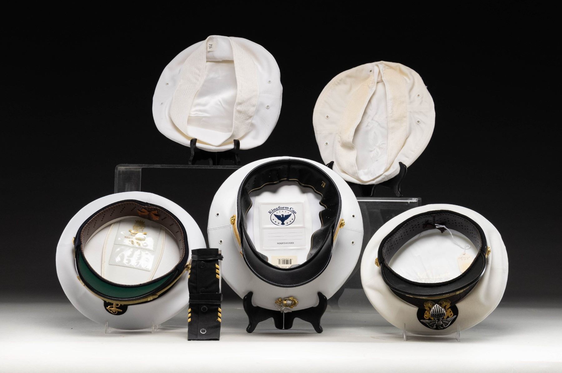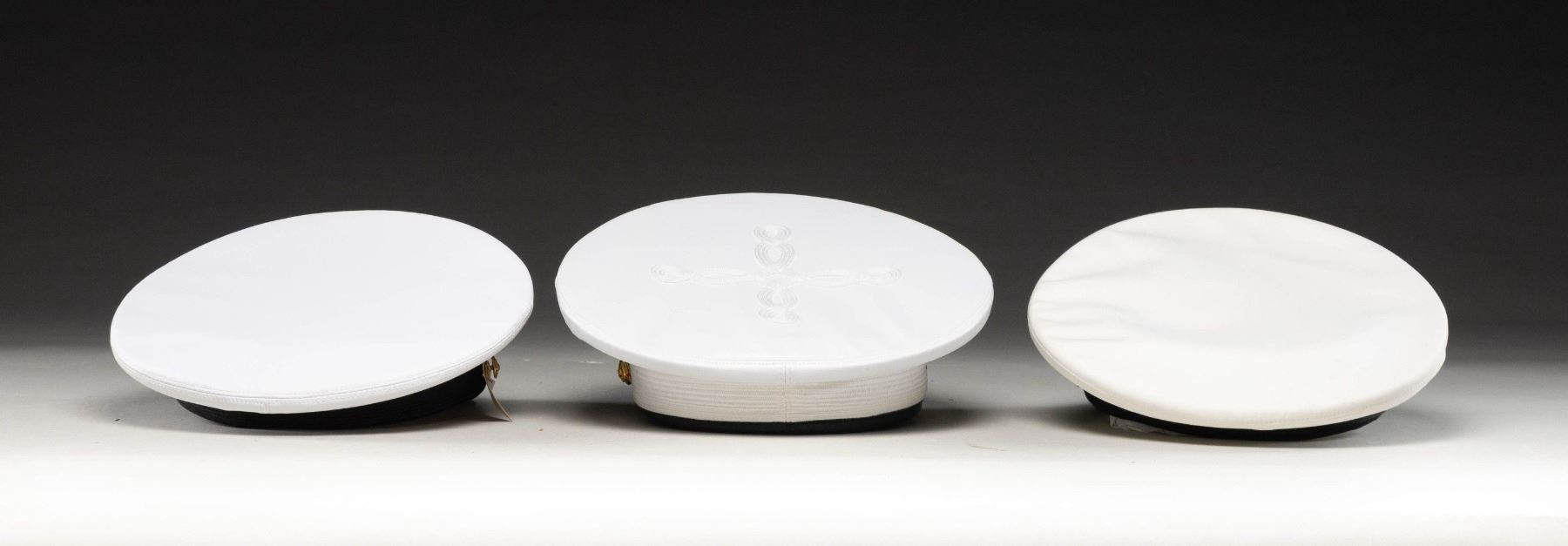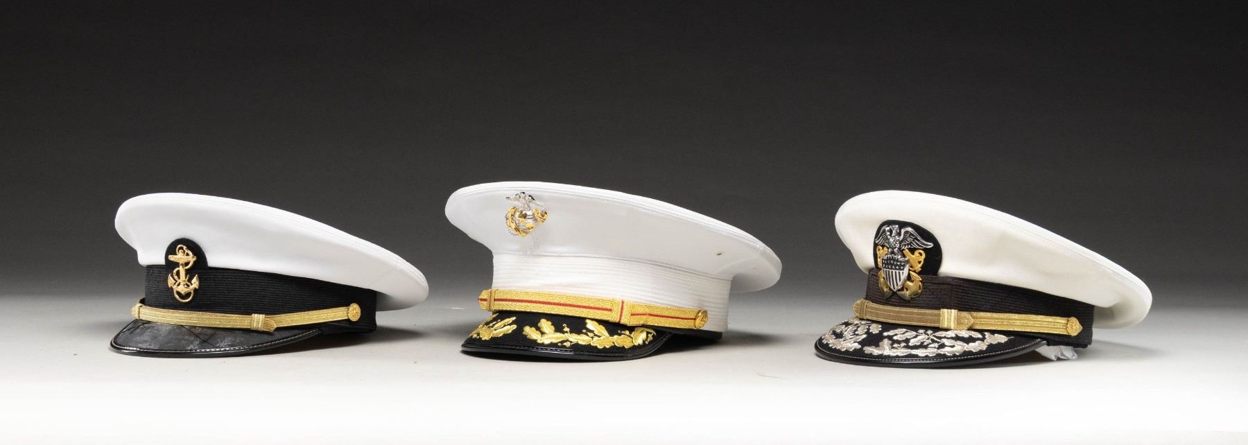 This lot includes 1 / USN white midshipman's visor cap from the US Naval Academy. 1 / USN officer's white visor cap with double rows of silver bullion "scrambled eggs" on the visor. 1/ USMC officer's white dress visor cap with a single row of gold bullion "scrambled eggs" on the visor. Hat it complete with 2 extra white tops. 1 / Pair if midshipman's shoulder slip over straps. 1 / Cap tally for a ship named "LONDON". CONDITION: all items show very light wear. (02-25766-1/BF). NON-GUN. $250-400.