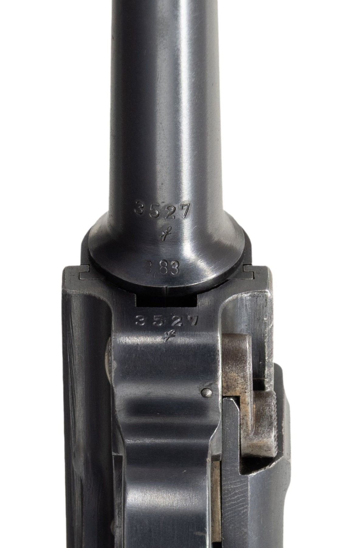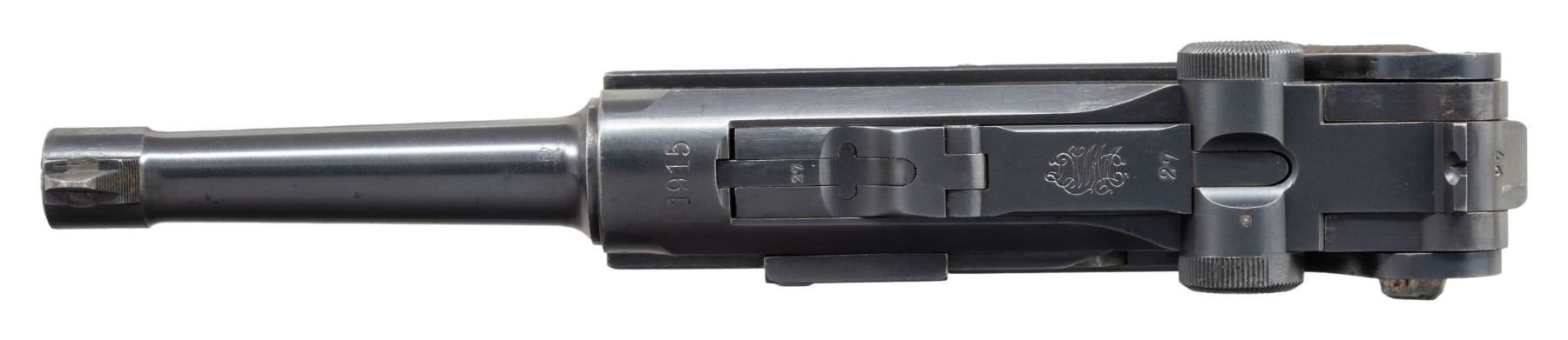 LUGER SEMI-AUTOMATIC PISTOL. Cal. 9x19mm. S# 3527f. Bbl. 3 15/16". P.08 Luger semi-automatic pistol mfg. by DWM under contact for the Imperial German military in 1915. The top of the bbl. extension is marked "1915" over the chamber, with DWM arsenal proofs marked on the right. Toggle is marked with the intertwined "DWM" monogram. Metal components exhibit a rust blue finish overall, with some small parts including the takedown lever, trigger, safety lever, and ejector exhibiting a straw finish. Frame is mounted with 2-piece checkered wood grips. Standard dovetailed blade front sight and fixed V-notch rear sight. All serialized parts are matching and include the frame, takedown lever, sideplate, trigger, safety lever & bar, hold-open latch, bbl., bbl. extension, trigger bar, breechblock, extractor, firing pin, toggles, as well as the grips. MAGS: 1 non-matching (S#: 3420c) 8-rd. mag. with wood plug. CONDITION: metal components retain the vast majority of their original arsenal blue finish, exhibiting some spots of light to mild edge wear, some scattered spots of light surface oxidation, as well as a couple of small spots of light pitting. Front grip strap shows an area of appropriate holster wear at the toe. Strawed parts retain large amounts of their original finish, showing areas of wear fading to gray patina, scattered spots of age related discoloration, and some spots of light pitting. Metal components retain some spots of old grease in protected areas. Near mirror bore, exhibiting some scattered small spots of light pitting, while retaining sharp and well defined rifling throughout. Proper manual mechanics. Grips show some light to mild smoothing, as well as some scattered superficial nicks and marks, but otherwise remain sound. Grip screws have faded to a mottled gray patina. A notably high condition example of DWM 1915 production P.08 Luger. (25-6197/MLW). CURIO. $1,200-1,800.