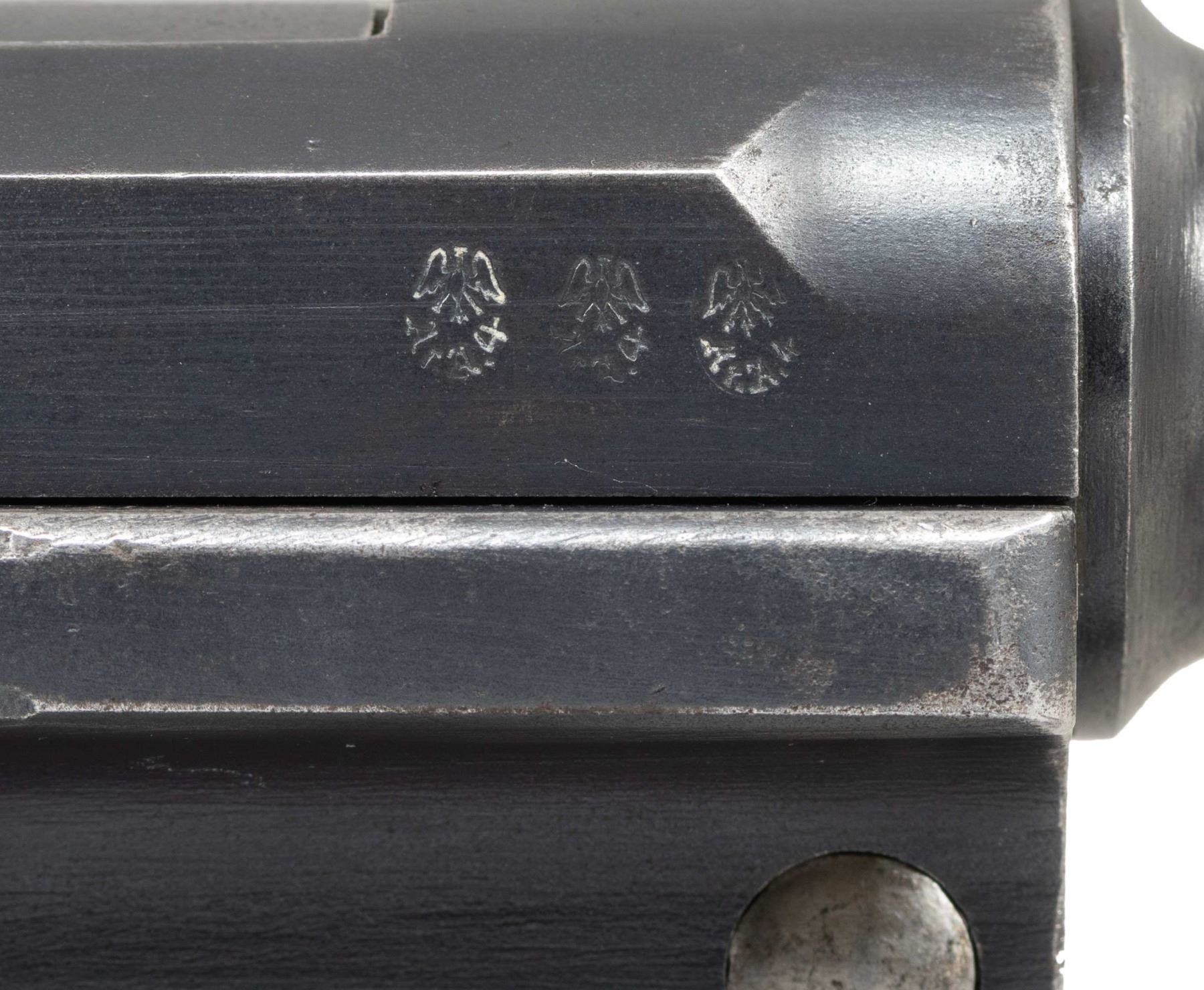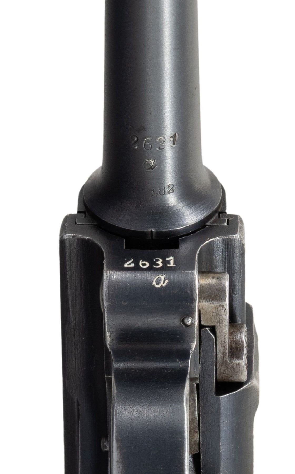 SEMI-AUTOMATIC PISTOL. Cal. 9x19mm. S# 2631a. Bbl. 3 15/16". P.08 Luger semi-automatic pistol mfg. by DWM during the Weimar era for police use, with this exact pistol being pictured on page 139 of "Weimar and Early Nazi Lugers" by Jan C. Still. The top of the bbl. extension is marked "1920", with 3 Weimar Eagle/WaA4 proofs marked on the right (single Eagle/WaA4 proof is also present on the top of the bbl., as well as on the left side of the breechblock). Toggle is marked with the intertwined "DWM" monogram. Metal components exhibit an arsenal reapplied rust blue finish overall, with some small parts exhibiting a straw finish. Frame is mounted with 2-piece checkered wood grips. Standard dovetailed blade front sight and fixed V-notch rear sight. Left side of bbl. extension is fitted with a Schiwy safety. Nearly all serialized parts are matching and include the frame, takedown lever, sideplate, trigger, safety lever & bar, hold-open latch, bbl., bbl. extension, trigger bar, breechblock, extractor, as well as the toggles. Firing pin is mismatched. Grips are unnumbered. MAGS: 1 non-matching plated 8-rd. mag. stamped "2/ 2725" above a police Star/K proof on the aluminum plug. UNATTACHED ACCESSORIES: a scan of page 139 of "Weimar and Early Nazi Lugers" showcasing this pistol. CONDITION: metal components retain the majority of their period arsenal reapplied blue finish, exhibiting some spots/areas of wear and thinning fading to gray patina, some scattered spots of light surface oxidation, as well as some scattered spots/patches of light to mild pitting beneath the bluing (most notably on the top of the breechblock and right side of the bbl.). Strawed parts have mostly worn to a gray patina, showing scattered spots/patches of age related discoloration. Bore is relatively bright, exhibiting consistent light to mild pitting and a few small spots of dark pitting, while retaining good, albeit worn rifling throughout. Proper manual mechanics. Grips show consistent mild smoothing, as well as some scattered handling marks and impressions, but otherwise remain sound. A rare opportunity to acquire a P.08 police Luger pictured in one of Jan C. Still's benchmark reference books. (25-6073/MLW). CURIO. $1,500-2,000.