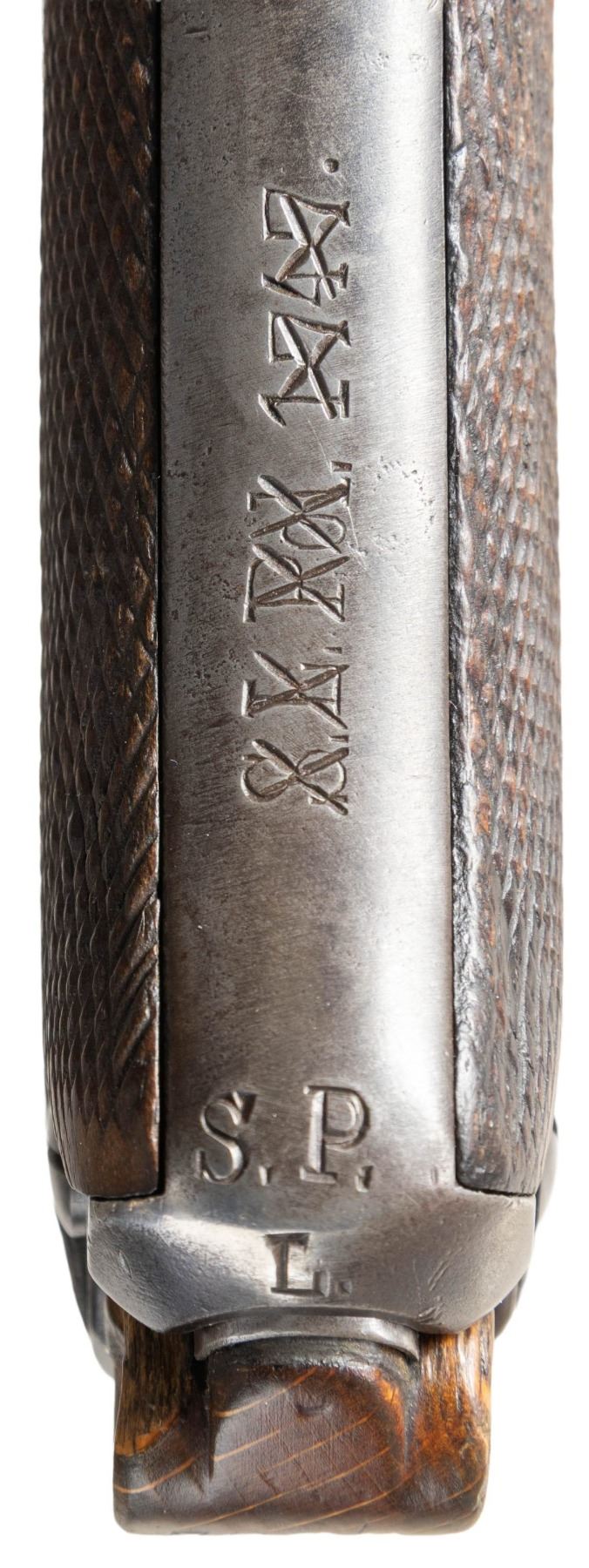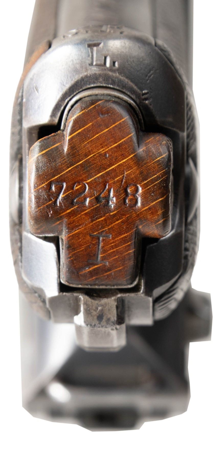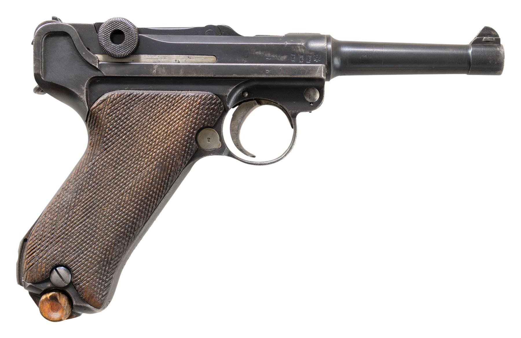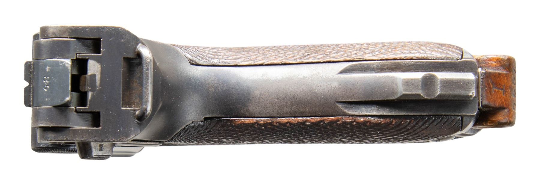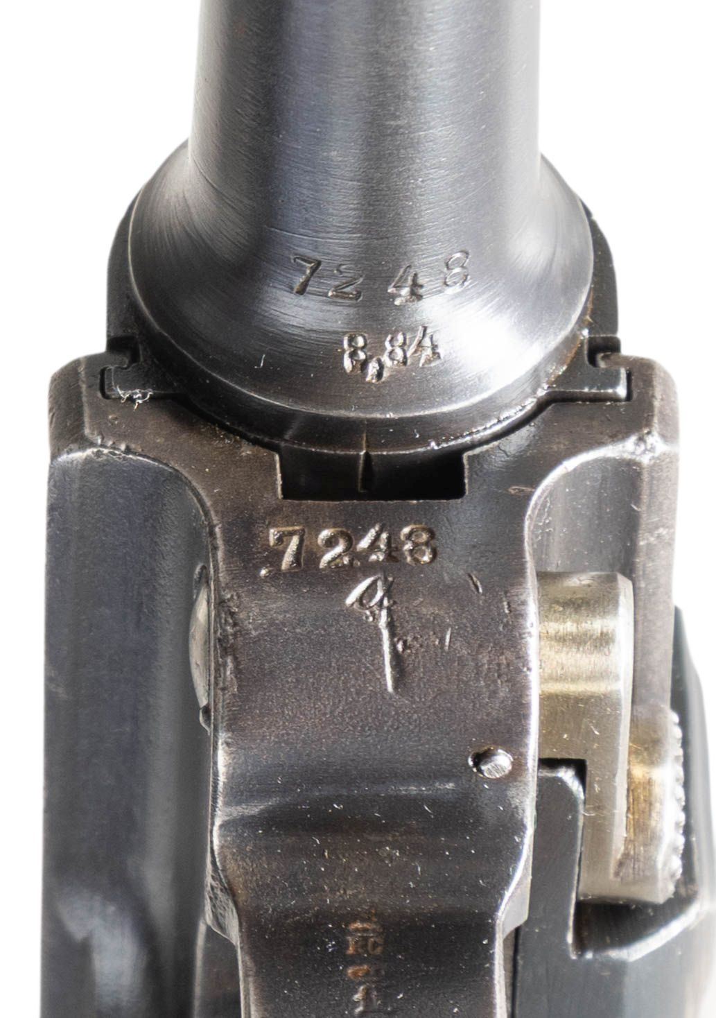SEMI-AUTOMATIC PISTOL. Cal. 9x19mm. S# 7248a. Bbl. 3 15/16". Originally mfg. as a standard configuration P.08 Luger by Erfurt in 1914, this example was subsequently retained under the Treaty of Versailles and utilized by the Weimar era police. The top of the bbl. extension is marked "1920/ 1914", with Erfurt arsenal proofs marked on the right. Toggle is marked with a crown over "ERFURT". Left side of the bbl. is marked with an Erfurt Crown/RC (Revision Commission) proof and an Imperial inspector proof (repeated on front of trigger guard bow), with a horizontal Crown/N marked on the right (repeated on right side of frame and bbl. extension). Front grip strap is marked with a X'd out "S.L.Pol. 1747." (Saxon State Security Police) police unit mark above a "S.P./ L." (Saxon State Police, Leipzig) unit mark. Metal components exhibit an apparent police arsenal reapplied rust blue finish overall, with some small parts exhibiting a straw finish. Frame is mounted with 2-piece checkered wood grips. Standard dovetailed blade front sight and fixed V-notch rear sight. Bbl. extension is fitted with a Schiwy police safety. All serialized parts are matching and include the frame, takedown lever, sideplate, trigger, safety lever & bar, hold-open latch, bbl., bbl. extension, trigger bar, breechblock, extractor, toggles, as well as the grips. Firing pin is unnumbered but Imperially proofed. MAGS: 1 matching 8-rd. police mag. with wood bottom marked "7248/ I". CONDITION: metal components retain the majority of their apparent police arsenal reapplied blue finish, exhibiting some areas of light to mild wear and thinning that are fading to a gray patina, scattered spots of light to mild pitting, as well as some spots/areas of light pitting beneath the bluing. Strawed parts retain good amounts of their original finish, showing areas of wear fading to gray patina, as well as some scattered spots of light pitting and age related discoloration. Bright bore, exhibiting consistent light pitting, while retaining good rifling throughout. Proper manual mechanics. Grips show areas of smoothing, as well as some scattered superficial marks and impressions from handling and storage, but otherwise remain sound. (25-6060/MLW). CURIO. $1,000-1,500.