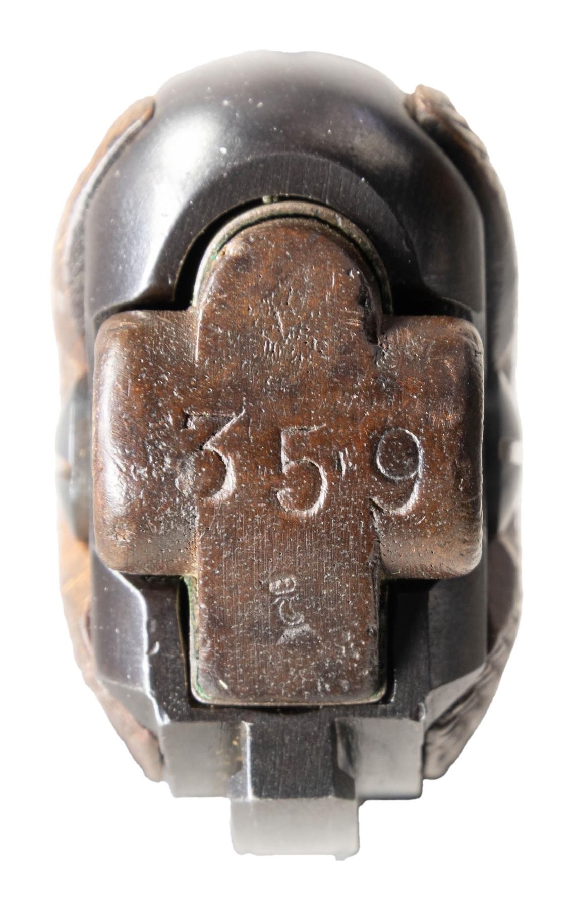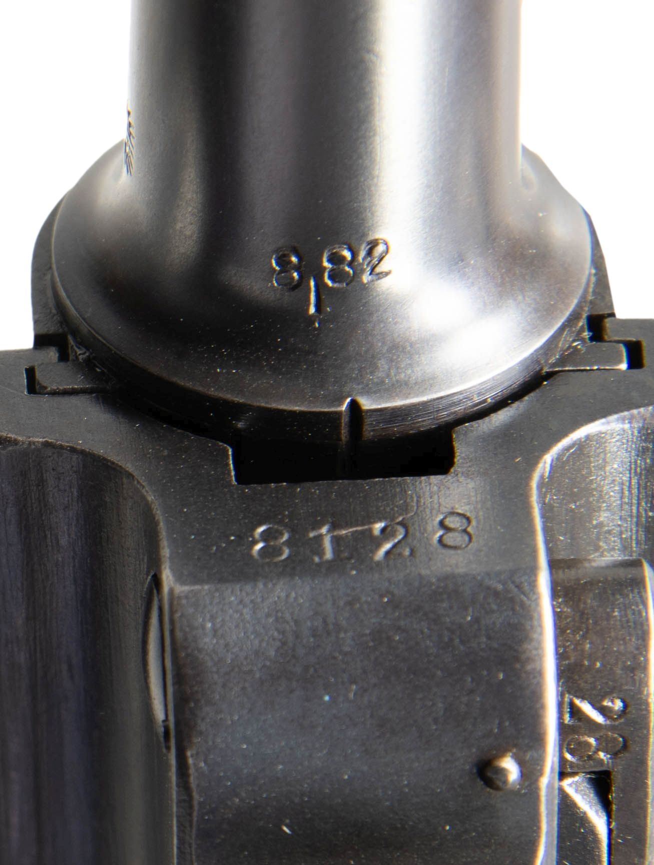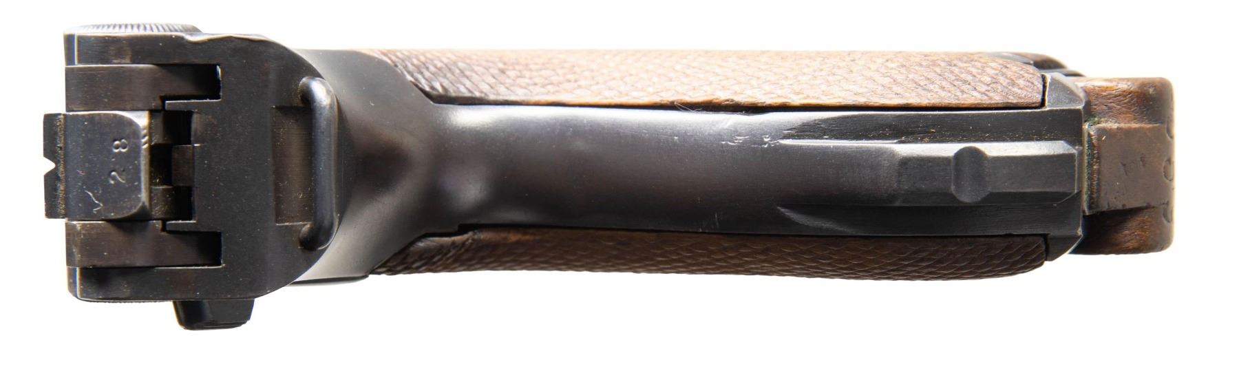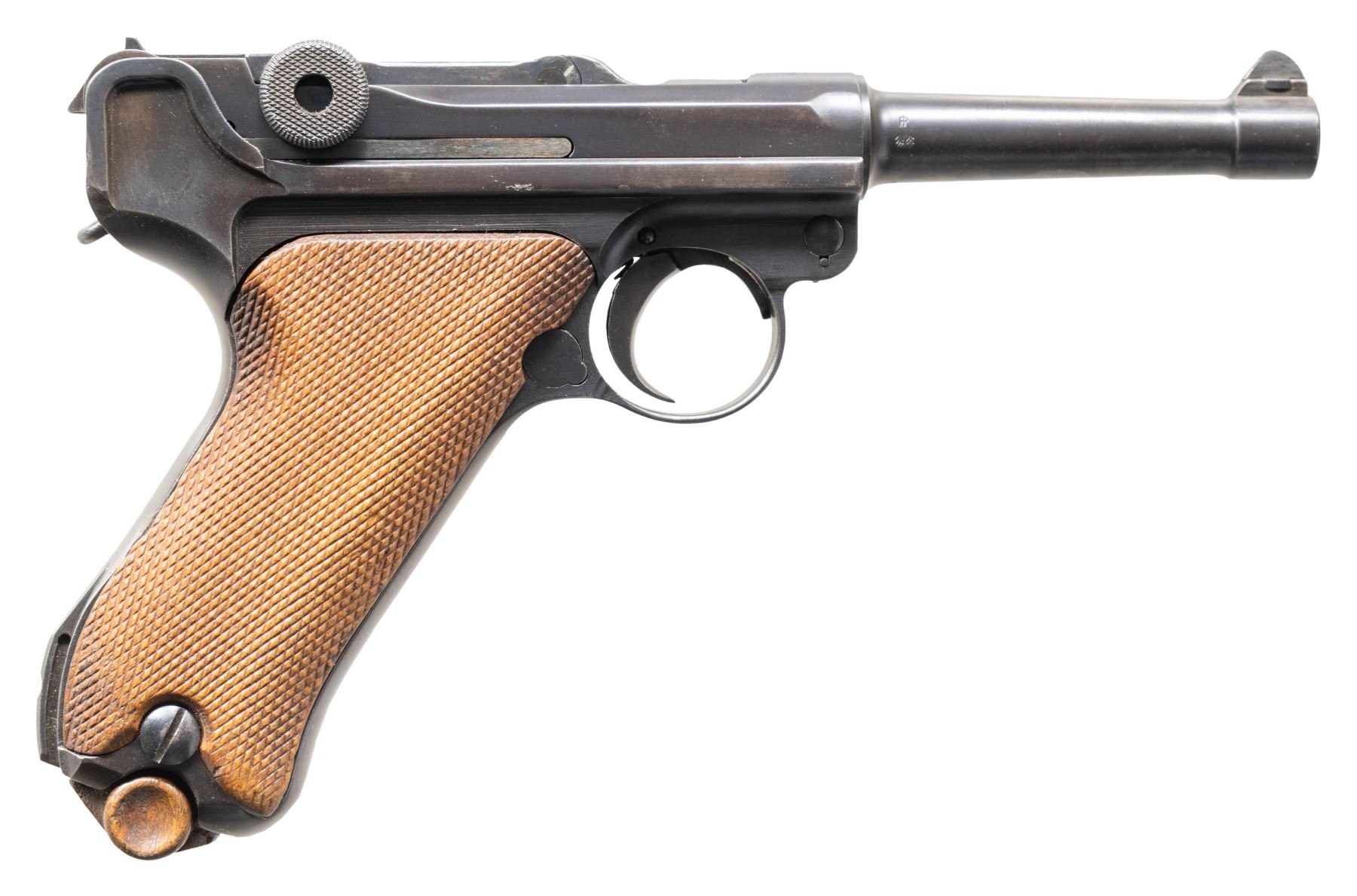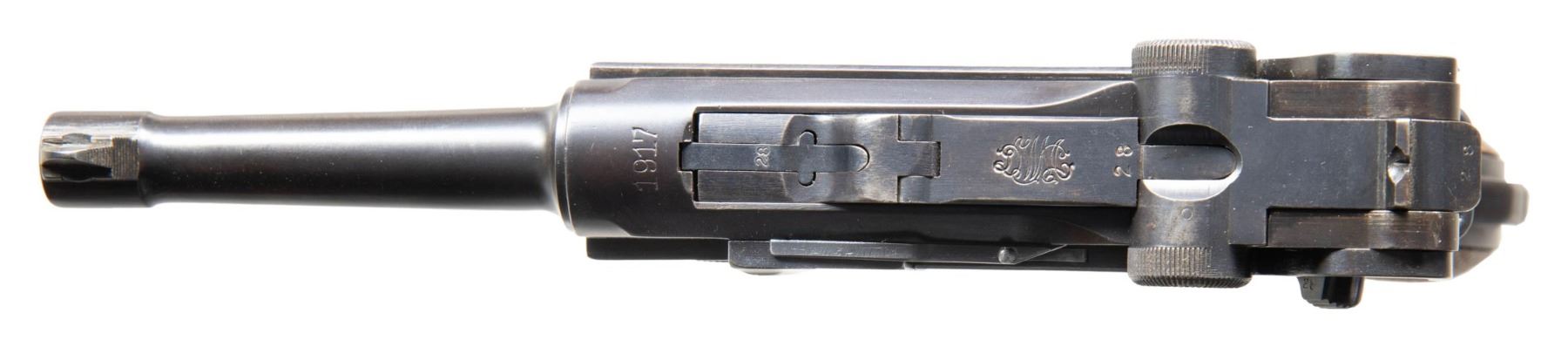 SEMI-AUTOMATIC PISTOL. Cal. 9x19mm. S# 8128. Bbl. 3 15/16". Originally mfg. as a P.04 Navy Luger in 1917, this example was subsequently reworked after the war into a P.08 configuration for police use. The top of the bbl. extension is marked "1917" over the chamber, with Imperial navy crown (also present on left side of breechblock) / Crown/M proofs, and the S# marked on the left. Right side of the bbl. is stamped with a "TP" above an eagle, indicating rework by the Berlin police armory. Left side of the frame is stamped "1917". Toggle is marked with the intertwined "DWM" monogram. Metal components exhibit a reapplied blue finish overall. Frame is mounted with 2-piece period replacement checkered wood grips. Standard dovetailed blade front sight and fixed V-notch rear sight. Left side of bbl. extension is fitted with a Schiwy safety. All serialized parts are matching (likely matched during police rework) and include the frame, takedown lever, sideplate, trigger, safety lever & bar, bbl. extension, trigger bar, breechblock, extractor, as well as the toggles. Remaining parts are unnumbered. MAGS: 1 plated 8-rd. mag. marked with an Imperial proof below "359" in large numerals on the wood plug. CONDITION: metal components retain the vast majority of their reapplied blue finish, exhibiting some superficial handling marks, with scattered spots of light pitting present beneath the bluing. Very bright bore, exhibiting scattered spots of light pitting, while retaining well defined rifling throughout. Proper manual mechanics. Grips show smoothing and some superficial handling marks, but otherwise remain sound. (25-6062/MLW). CURIO. $1,000-1,500.