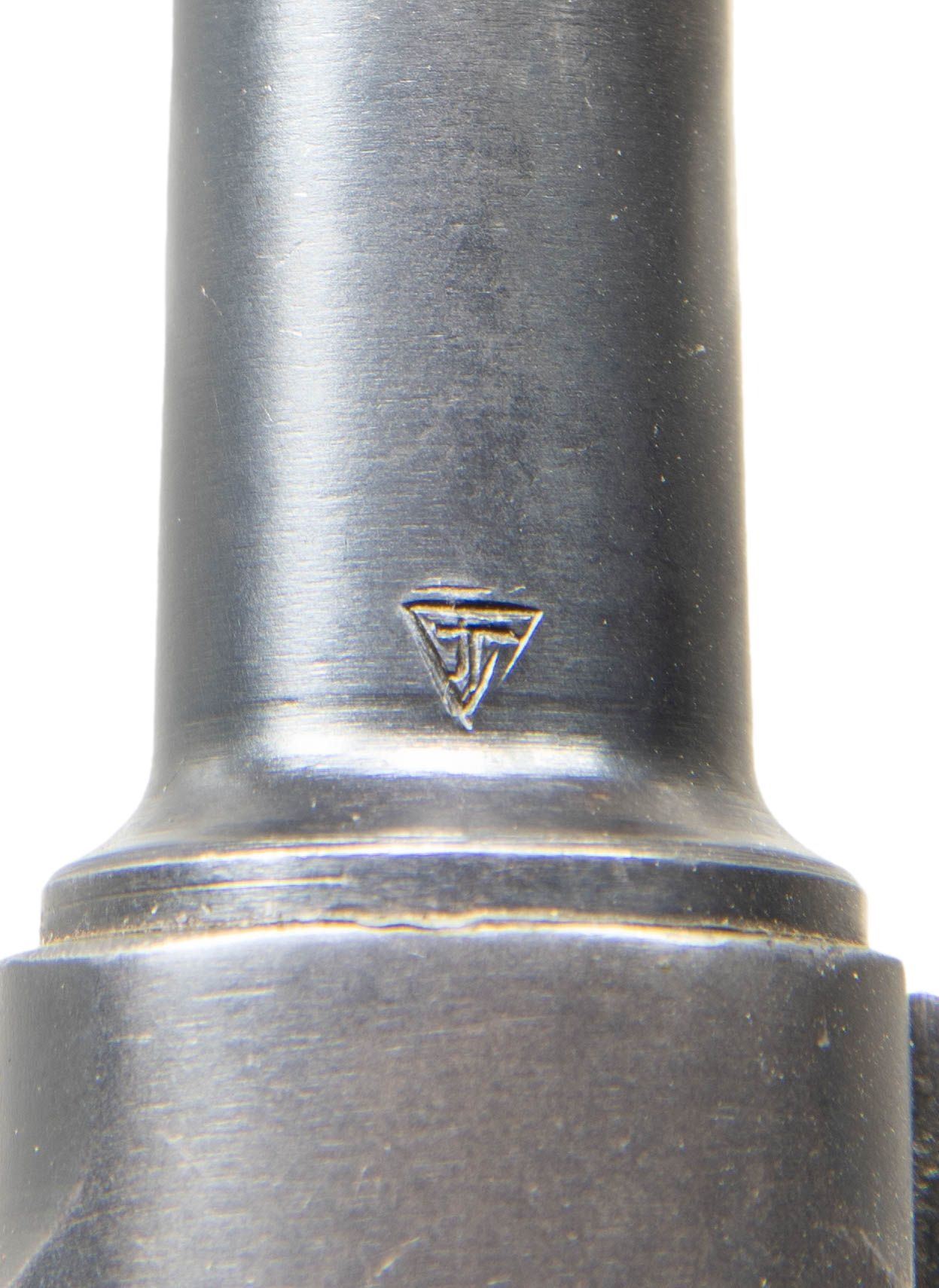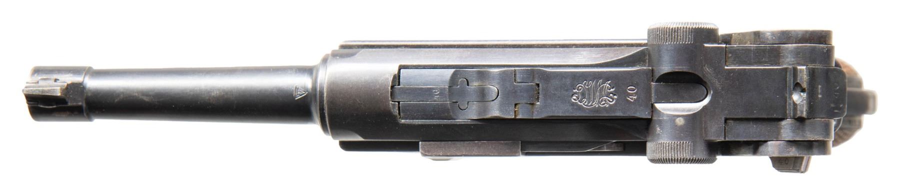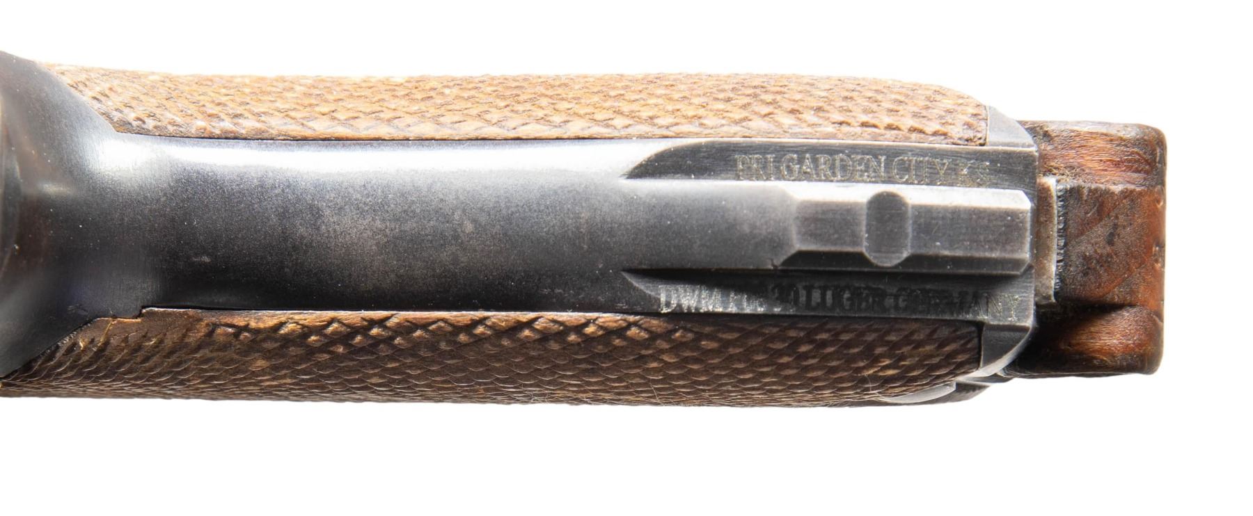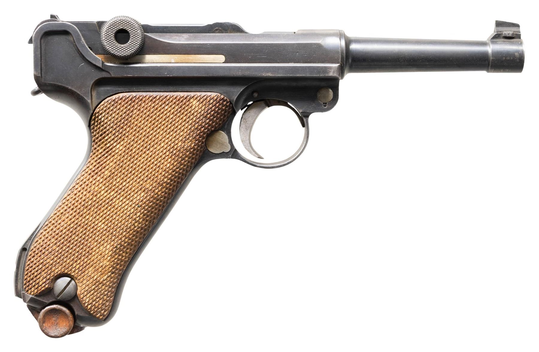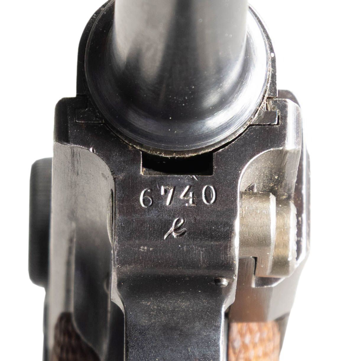 Cal. 30 Luger. S# 6740e. Bbl. 3 15/16". As the result of praise from Finnish volunteers that served in the German army during WWI and dissatisfaction found with the domestically designed Ahlberg pistol, the Finnish Ministry of Defense approached DWM to purchase a number of P.08 Luger pistols. Due to the Treaty of Versailles, DWM could only supply Finland with 7.65x21mm Lugers (1920 Commercial Lugers), ultimately leading to the Finnish army acquiring approx. 8,000 of said Lugers, designated as the "M/23", with a small number of Lugers being converted to 9x19mm and being designated as the "M/08". This example, an M/23 Luger is marked with 3 partially visible Imperial German DWM arsenal proofs on the right side of the bbl. extension. Toggle is marked with the intertwined "DWM" monogram. Rear grip strap is marked with a "PRI GARDEN CITY KS/ DWM P08 30 LUGER GERMANY" import mark around the stock lug. The bbl. is a Finnish replacement, marked with the VKT logo towards the breech. Major metal components exhibit a rust blue finish overall, with some small parts exhibiting a straw finish. Frame is mounted with 2-piece checkered wood grips. Lahti pattern dovetailed blade front sight with rear sight modified to a U-notch configuration. Nearly all serialized parts are matching and include the frame, trigger, safety lever & bar, hold-open latch, bbl. extension, trigger bar, breechblock, extractor, firing pin, toggles, as well as the grips. Sideplate is mismatched. Takedown lever is unnumbered. MAGS: 1 non-matching 8-rd. mag. numbered "2637" in large numerals on the wood plug and spine. CONDITION: metal components retain the vast majority of their apparent Finnish arsenal reapplied blue finish, exhibiting some light to mild edge wear, some superficial handling marks, as well as some scattered spots of light surface oxidation and pitting overall. Strawed parts retain fair to good amounts of their original finish, showing areas of wear fading to gray patina. Mirror bore, retaining well defined rifling throughout. Proper manual mechanics. Grips show smoothing and some superficial handling marks, but otherwise remain sound. (25-6054/MLW). CURIO. $1,000-1,500.