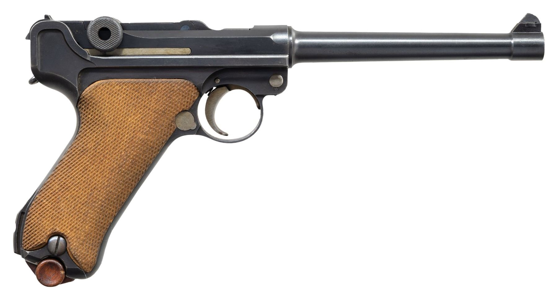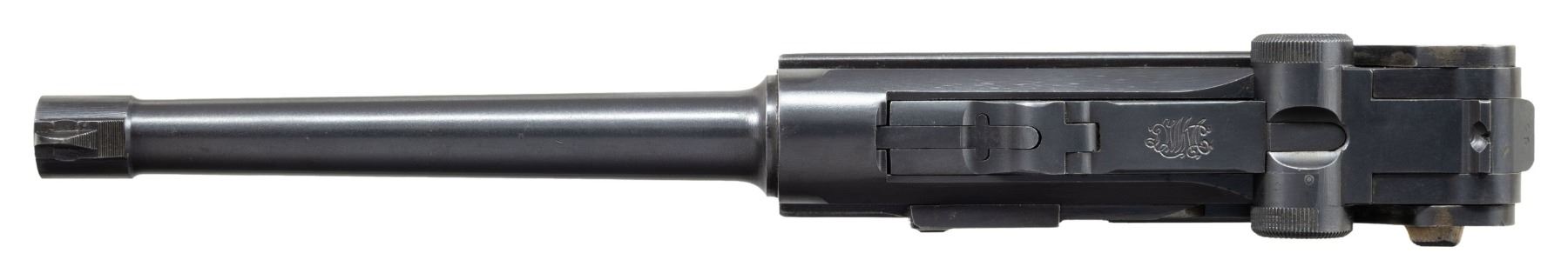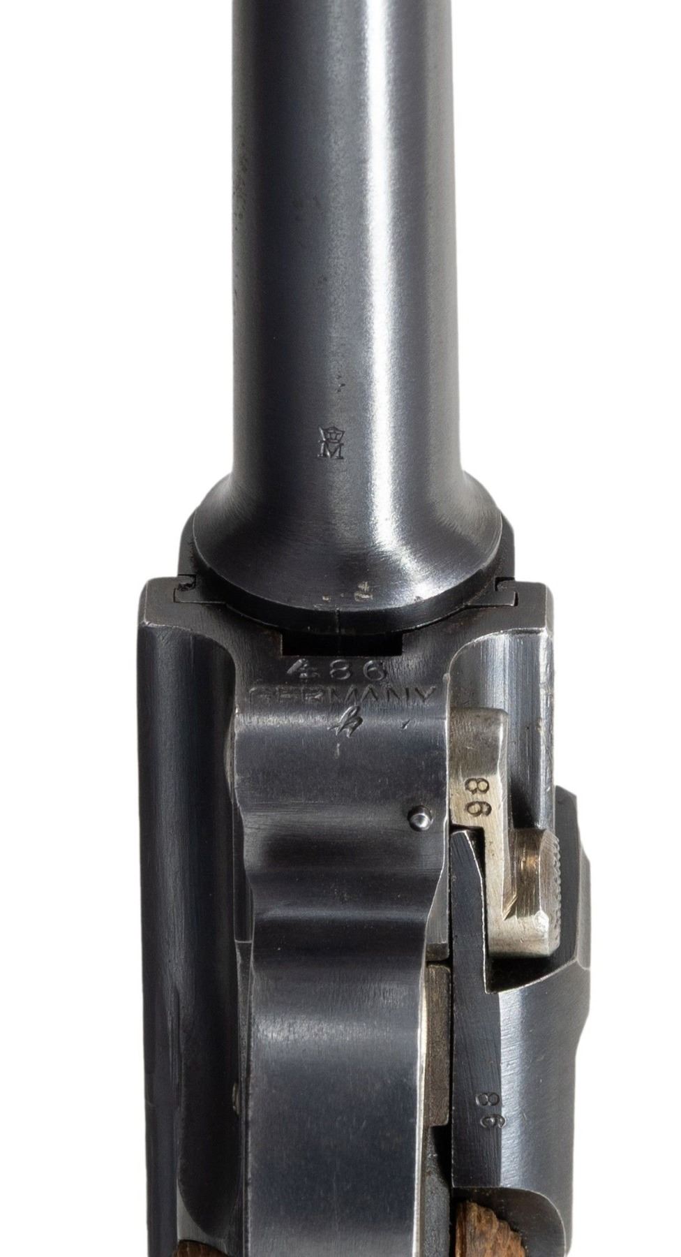 SEMI-AUTOMATIC PISTOL WITH NAVY BARREL. Cal. 9mm Luger. S# 486k. Bbl. 5 7/8". Model 1920 Commercial Luger mfg. by DWM from a variety of surplus and newly mfg. parts and components. Toggle is marked with the "DWM" monogram, with a horizontal Crown/N commercial nitro proof marked on the left. Metal components exhibit a rust blue finish overall, with some small parts including the takedown lever, trigger, safety lever, and ejector exhibiting a straw finish. Frame is mounted with 2-piece checkered wood grips. Standard dovetailed blade front sight on Navy Crown/M proofed bbl. and fixed V-notch rear sight. All serialized parts are matching in the commercial "hidden" fashion and include the frame, takedown lever, sideplate, trigger, hold-open latch, as well as the rear toggle link. MAGS: 1 unnumbered plated 8-rd. with unmarked wood plug. CONDITION: excellent, with metal components retaining the vast majority of their original factory blue finish, exhibiting some light edge wear, as well as a few scattered spots of light wear and thinning overall. Front grip strap exhibits a crack on the left side that is also visible on the interior. Strawed parts retain the majority of their original finish, showing some areas of wear and thinning fading to gray patina with scattered spots of age related discoloration. Trigger appears to have been cleaned and reheated at one time. Mirror bore, exhibiting a couple of small spots of light pitting, while retaining well defined rifling throughout. Proper manual mechanics. Grips show some spots of light smoothing, but otherwise remain very good overall. (25-6565/MLW). CURIO. $1,000-1,500.