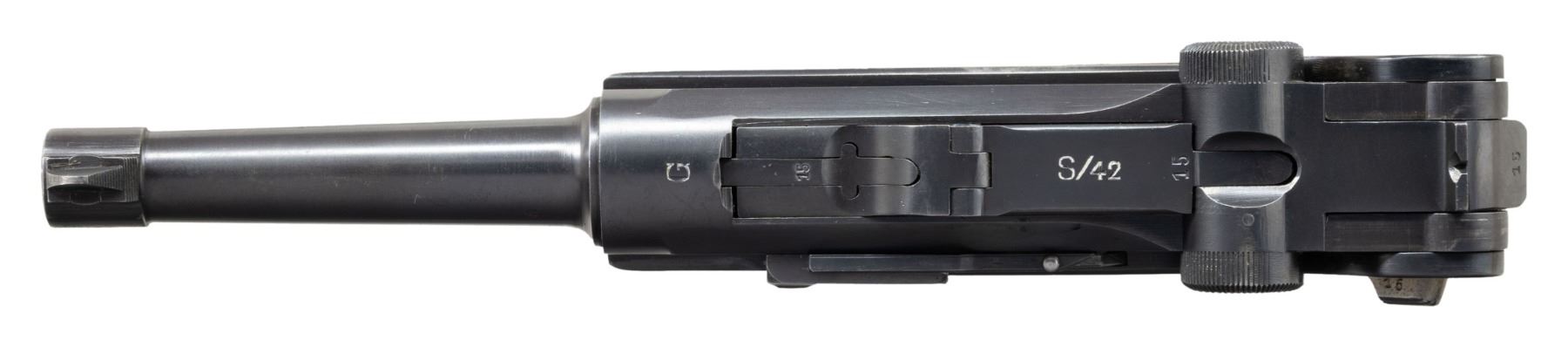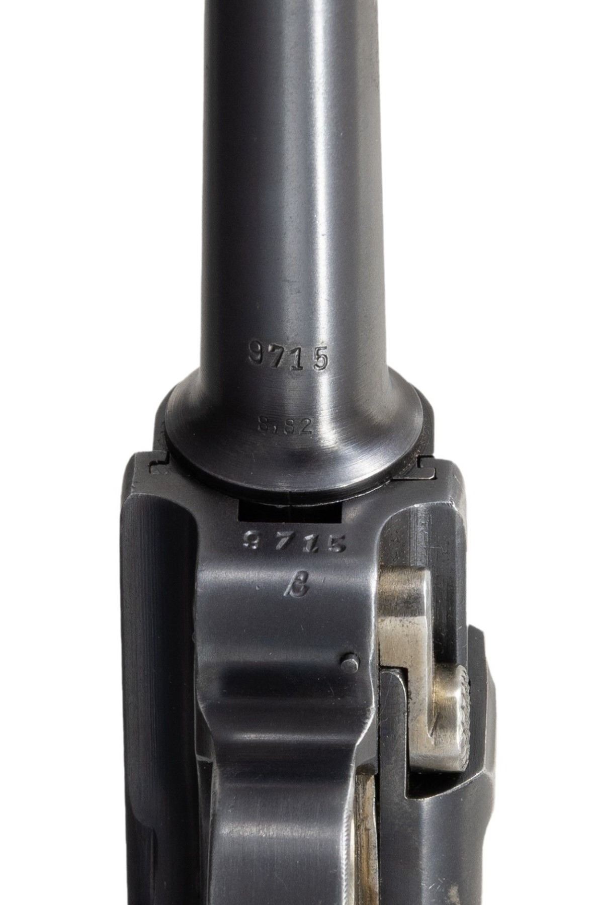 P.08 LUGER SEMI-AUTOMATIC PISTOL. Cal. 9mm Luger. S# 9715e. Bbl. 3 15/16". P.08 Luger semi-automatic pistol mfg. by Mauser in 1935 for police use. The top of the bbl. extension is marked with the "G" (1935) date code, with early Mauser military Eagle/63 proofs and a droop eagle firing proof (also marked on bbl. and breechblock) marked on the right. Toggle is marked with Mauser's "S/42" date code. Metal components exhibit a rust blue finish overall, save for on some small parts including the takedown lever, trigger, safety lever, and ejector, which exhibit a straw finish. Frame is mounted with 2-piece checkered wood grips. Standard dovetailed blade front sight and fixed V-notch rear sight. Bbl. extension is fitted with a Schiwy safety. Frame is cut for a Walther safety, which is absent. Nearly all serialized parts are matching and include the frame, takedown lever, sideplate, trigger, safety lever & bar, hold-open latch, bbl., bbl. extension, trigger bar, breechblock, extractor, firing pin, toggles, as well as the rear toggle pin. Grips do not match, but match themselves via "61". MAGS: 1 cleaned 8-rd. with aluminum plug that appears to have been renumbered to match. Plug is marked "2/ 9715", as well as with an apparent Star/K proof. CONDITION: metal components retain the majority of their original blue finish, exhibiting some areas of wear and thinning fading to gray patina, with a few spots of light pitting. Left side of the frame exhibits an area of unusual finish loss, with the right side exhibiting an area of finish loss and some light pitting. Right side of frame exhibits an area of marring around the takedown lever spring slot. Grip straps exhibit consistent light surface oxidation and pitting. Strawed parts retain fair to good amounts of their original finish, with worn areas fading to gray patina and showing scattered spots of age related discoloration. Mirror bore, exhibiting some spots of very light pitting, while retaining well defined rifling throughout. Proper manual mechanics. Grips show mild smoothing, as well as some scattered nicks and impressions from handling and storage, with the left panel exhibiting a chip at the usual area, at and to the right of the safety lever. A scarce example of a police issued "G" date P.08 Luger. (25-6569/MLW). CURIO. $1,200-1,800.