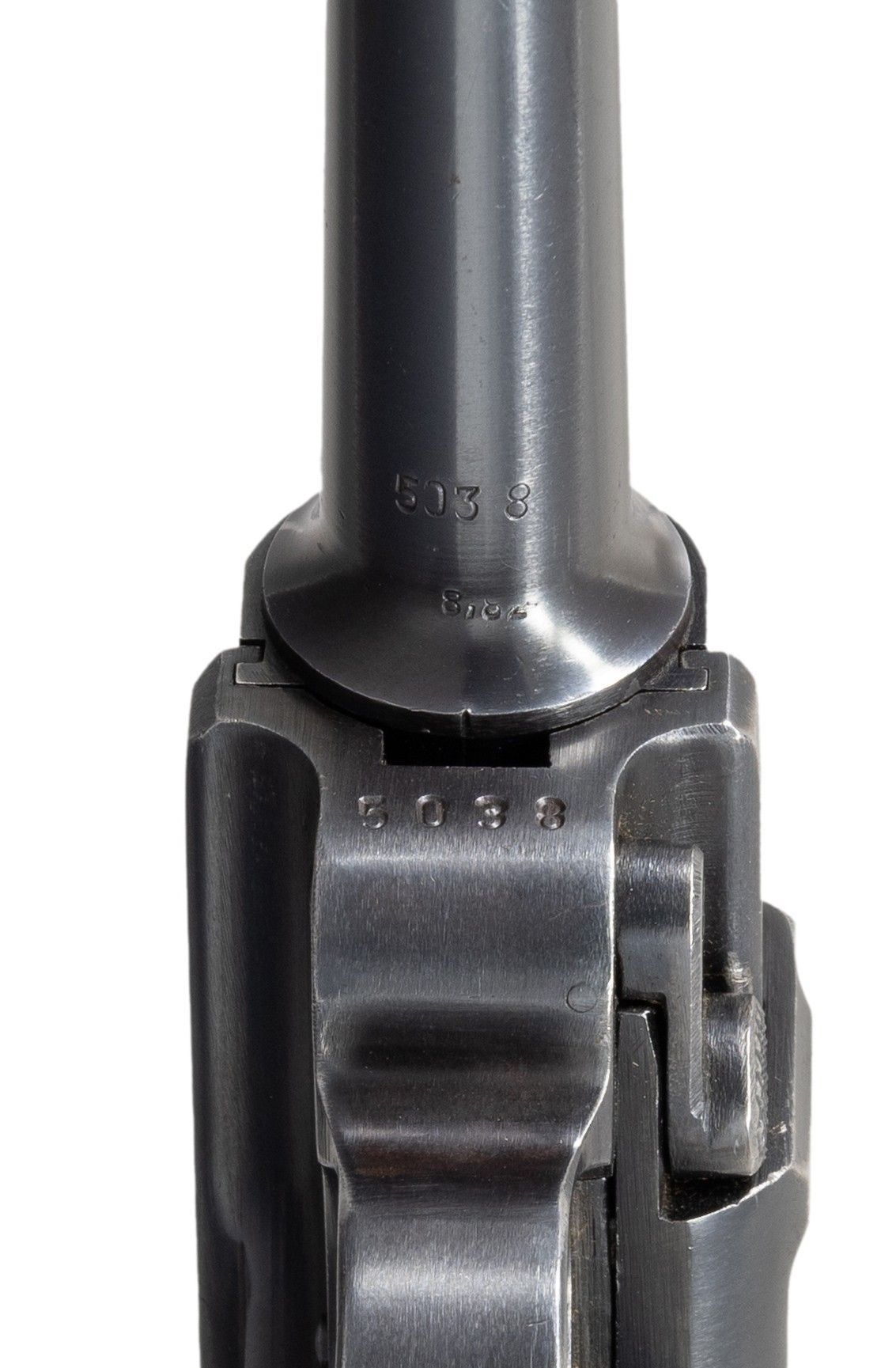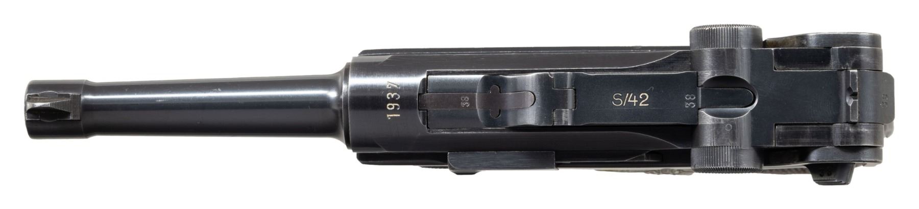 P.08 LUGER SEMI-AUTOMATIC PISTOL. Cal. 9mm Luger. S# 5038. Bbl. 3 15/16". P.08 Luger semi-automatic pistol mfg. by Mauser in 1937. Top of the bbl. extension is marked with the 4-digit year of mfg. "1937" over the chamber, with 2 early Mauser Eagle/63 proofs marked on the right, followed by a "droop" eagle firing proof (also present on bbl. and breechblock). Toggle is marked with Mauser's clandestine "S/42" mfg. code. Metal components exhibit a salt blue finish overall. Frame is mounted with 2-piece checkered wood grips, each fitted with an added alloy German party insignia cap pin. Standard dovetailed blade front sight and fixed V-notch rear sight. All serialized parts are matching and include the frame, takedown lever, sideplate, trigger, safety lever & bar, hold-open latch, bbl., bbl. extension, trigger bar, breechblock, extractor, firing pin, toggles, rear toggle pin, as well as the grips. MAGS: 1 blued "fxo" marked 8-rd. mag. with black synthetic plug. CONDITION: metal components retain the majority of their original arsenal salt blue finish, exhibiting some areas of light to mild wear and thinning (primarily on edges, with a few small patches on left side of bbl.), as well as some minor superficial handling marks overall. Grip straps exhibit light wear and thinning fading to gray patina. Bore is bright, exhibiting scattered spots and some streaks of light to mild pitting, while retaining well defined rifling throughout. Proper manual mechanics. Grips show light to mild smoothing, as well as some superficial nicks to the diamonds, but otherwise remain sound. (25-6561/MLW). CURIO. $1,200-2,000.