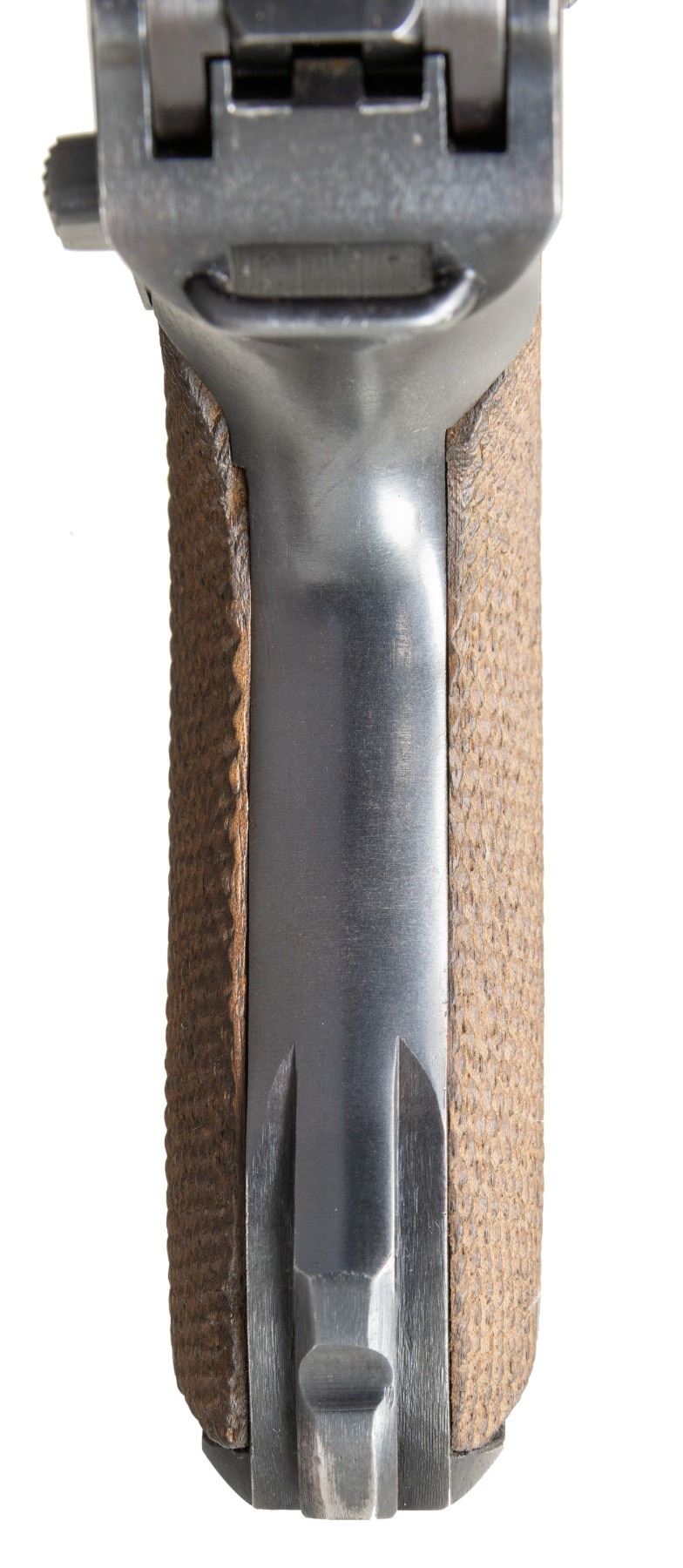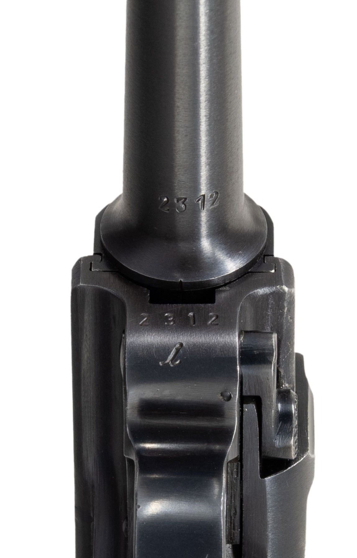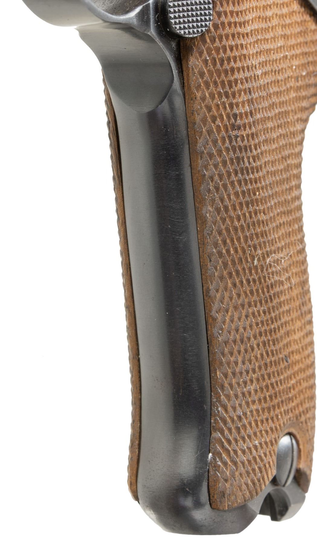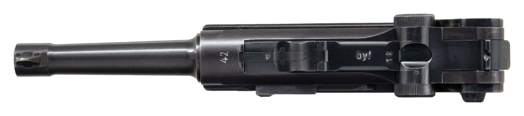 LUGER SEMI-AUTOMATIC PISTOL. Cal. 9mm Luger. S# 2312i. Bbl. 3 15/16". P.08 Luger semi-automatic pistol mfg. by Mauser in 1942. Top of the bbl. extension is marked with the 2-digit year of mfg. "42", with Mauser Eagle/135 proofs and an eagle firing proof marked on the right. Toggle is marked with Mauser's "byf" mfg. code. Metal components exhibit a salt blue finish overall. Frame is mounted with 2-piece checkered wood grips. Standard dovetailed blade front sight and fixed V-notch rear sight. All serialized parts are matching and include the frame, takedown lever, sideplate, trigger, safety lever & bar, hold-open latch, bbl., bbl. extension, trigger bar, breechblock, extractor, firing pin, toggles, as well as the rear toggle pin. Grips are unnumbered and unproofed. MAGS: 1 non-matching (S#: "7369/ m") blued 8-rd. with aluminum plug marked with an Eagle/83. CONDITION: metal components retain the vast majority of their original arsenal salt blue finish, exhibiting a few spots of light to mild edge wear fading to gray patina (primarily on edges of bbl., forward edges of frame, and on sideplate). Front grip strap exhibits an area of appropriate holster wear on the toe, with the rear grip strap exhibiting a couple of small spots of light wear and thinning. Excellent near mirror bore, exhibiting some light pitting, while retaining well defined rifling throughout. Proper manual mechanics. Grips show some light smoothing and a few superficial handling marks, but otherwise remain very good overall. A very attractive, high condition example of a 1942 production Mauser P.08 Luger. (25-6567/MLW). CURIO. $1,500-2,500.