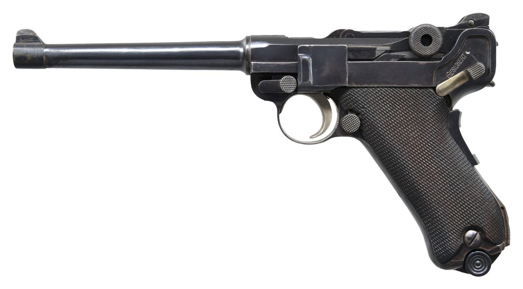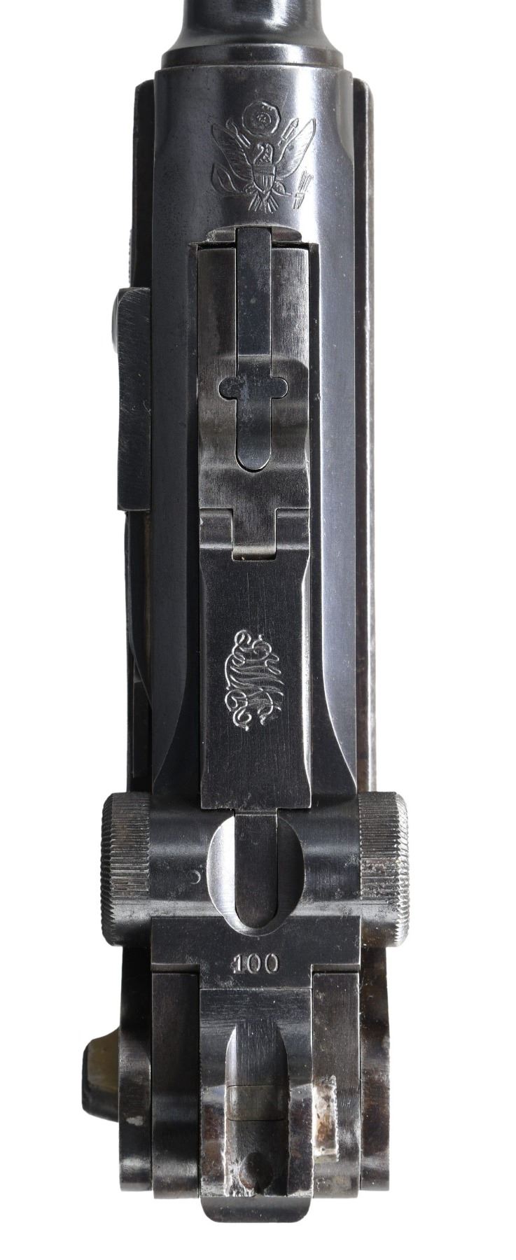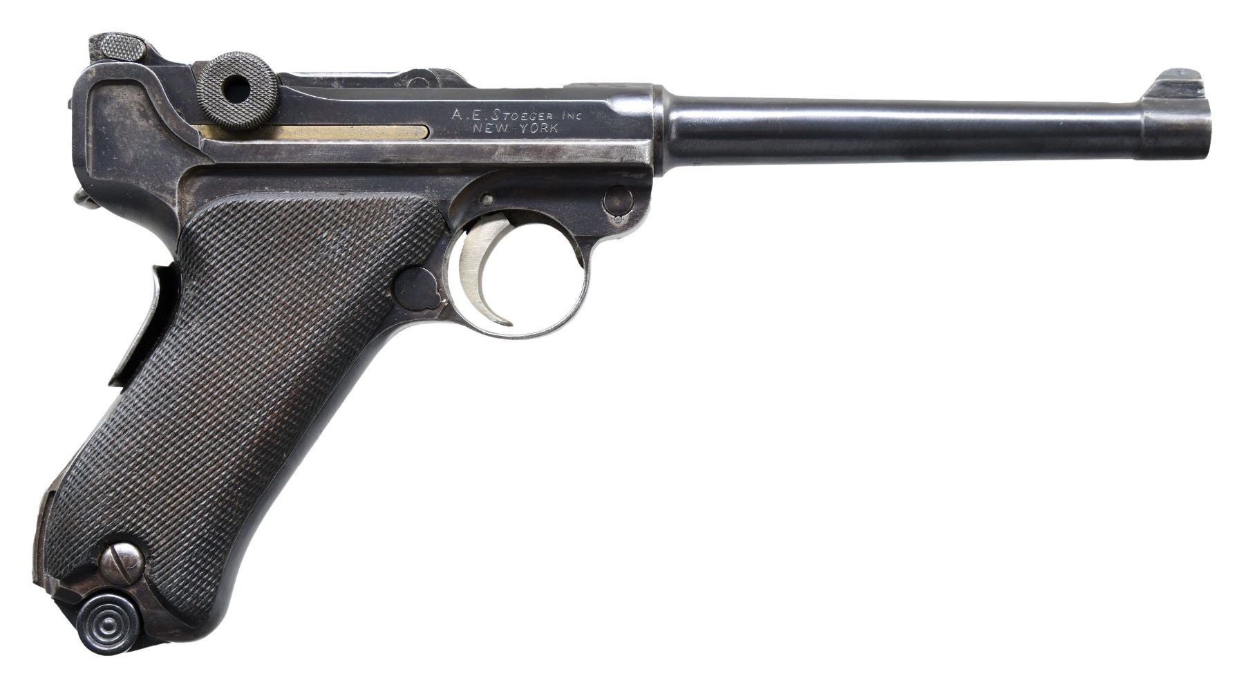 WITH SPURIOUS MARKINGS. Cal. 9x19mm Parabellum. S# 8577a. Bbl. 5 7/8". Model 1906 Navy Luger semi-automatic pistol mfg. by DWM. The top of the bbl. extension is engraved with a spurious Great Seal of the United States, with a spurious "A.E. STOEGER INC/ NEW YORK" engraved on the right. Toggle is marked with the intertwined DWM monogram, with an Imperial German naval crown proof marked on the left side of the breechblock. Metal components exhibit a reapplied blue finish overall, with some small parts exhibiting a reheated straw finish. Frame is mounted with replacement 2-piece checkered wood grips, and features a grip safety. Muzzle crown has been ground down, with the muzzle / front sight band appearing to have been recut. Matching numbers are present on the frame, takedown lever, trigger, grip safety, bbl., bbl. extension, breechblock, toggles, as well as the grips. Takedown lever, grip safety, and grips have been renumbered to match, with remaining parts being unnumbered. MAGS: 1 reblued 8-rd., with black synthetic concentric circle bottom. CONDITION: metal components retain the majority of their reapplied blue finish, exhibiting areas of wear and thinning that show through to gray and brown patinas, scattered superficial handling marks, and spots/areas of light to mild pitting beneath the bluing overall. Front grip strap exhibits several notable dings that show through to silvering. Dark bore, exhibiting heavy pitting, while retaining strong rifling throughout. Grips show some smoothing, as well as some scattered marks and minor impressions from handling and storage, but otherwise remain sturdy and serviceable. Left grip shows some chipping around the mag. release button, and a chip present in the top right corner of the panel, beside the safety lever. (25-1422/MLW). CURIO. $500-1,000.