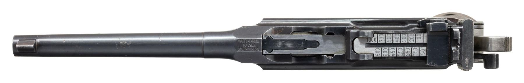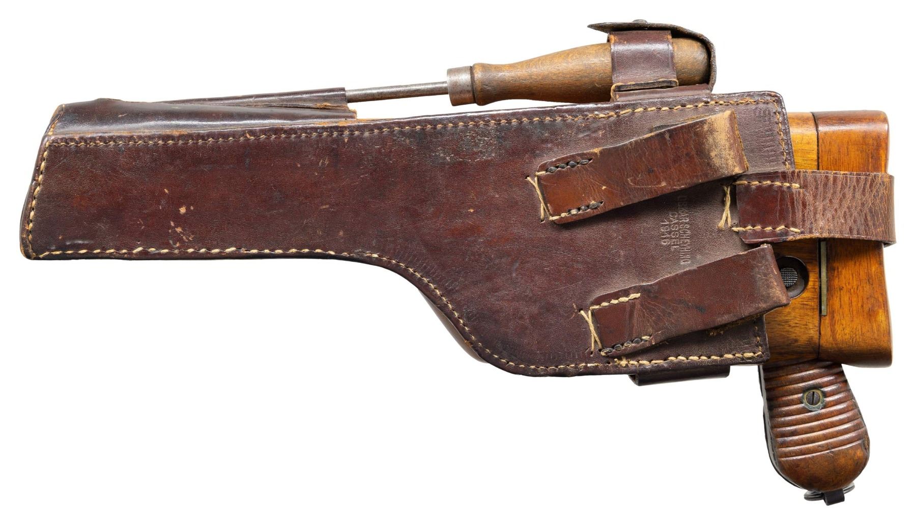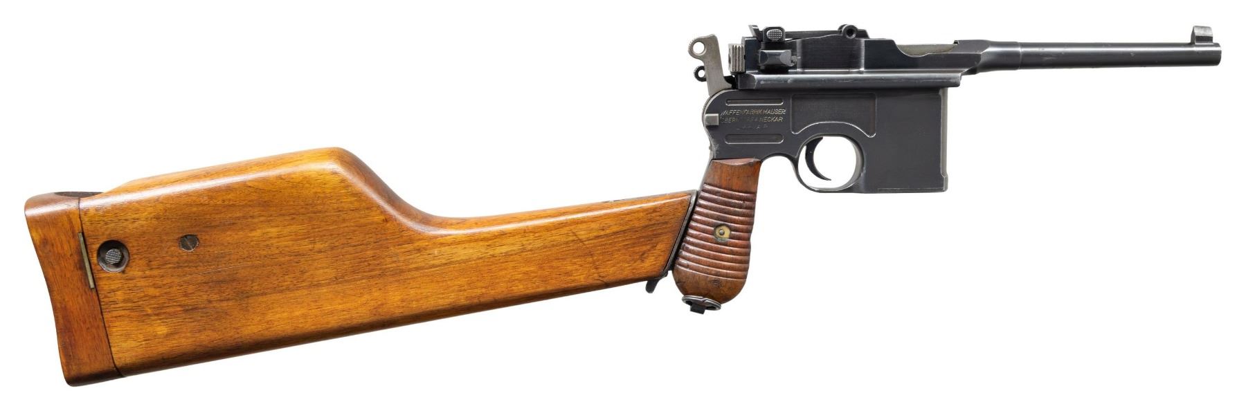PISTOL WITH STOCK & HARNESS. Cal. 7.63mm. S# 917017. Bbl. 5 1/2". C96 Model 1930 Commercial semi-automatic pistol mfg. by Mauser. Top flat of the faceted breech is marked with Mauser's 3-line address, with a double crowned "U" proof (repeated on top of bolt) marked on the left quarter flat. Left side of the frame is marked with the Mauser banner logo on the "island", with "WAFFENFABRIK MAUSER/ OBERNDORF A. NECKAR/ D.R.P.u.A.P." marked on the right. Metal components exhibit a salt blue finish with the bolt being polished in-the-white. Frame is mounted with 2-piece grooved wood grips, and features a lanyard ring on the butt. Standard C96 pattern fixed blade front sight and tangent V-notch rear sight graduated 50-1000. All serialized parts are matching and include the frame, sub-frame, floorplate, as well as the bbl./bbl. extension (top flat, rear of tangent sight). UNATTACHED ACCESSORIES: non-matching unmarked C96 wood stock/holster with WWI mfg. harness marked "OSKAR SCHEYHING/ CASSEL/ 1916" on the rear. Stock/holster has been sanded and refinished at one time, and features an apparent period added brown leather belt loop, retained via 6 pins/nails on the lower section. CONDITION: metal components retain the majority of their original factory salt blue finish, exhibiting some areas of wear and thinning fading to gray patina (primarily on edges), scattered superficial handling marks, as well as small some small scattered spots of light to mild pitting. Rear grip strap has been cleaned at one time. Bore is bright, exhibiting scattered spots of light to mild pitting and areas of mild to moderate pitting at the muzzle, while retaining well defined rifling throughout. Proper manual mechanics. Grips show scattered superficial marks and small impressions from handling and storage, with a large impression present on the left panel towards the bottom right edge. Stock shows scattered superficial handling marks, but otherwise remains sound, with metal hardware having faded to a gray patina. Leather harness remains malleable, exhibiting general overall wear, with some areas of age related cracking and crazing. Harness exhibits a small hole at the toe of the putzstock provision. (25-6566/MLW). CURIO. $1,500-2,250.