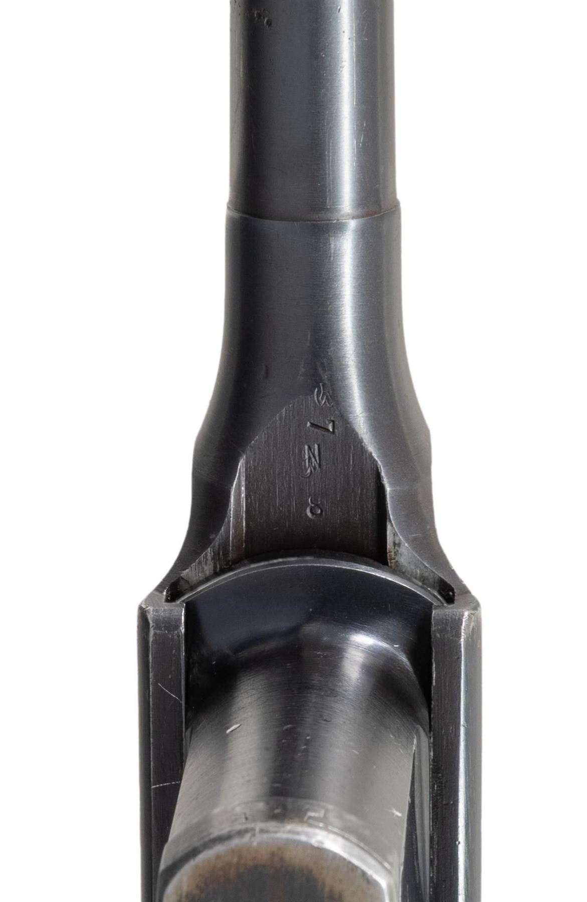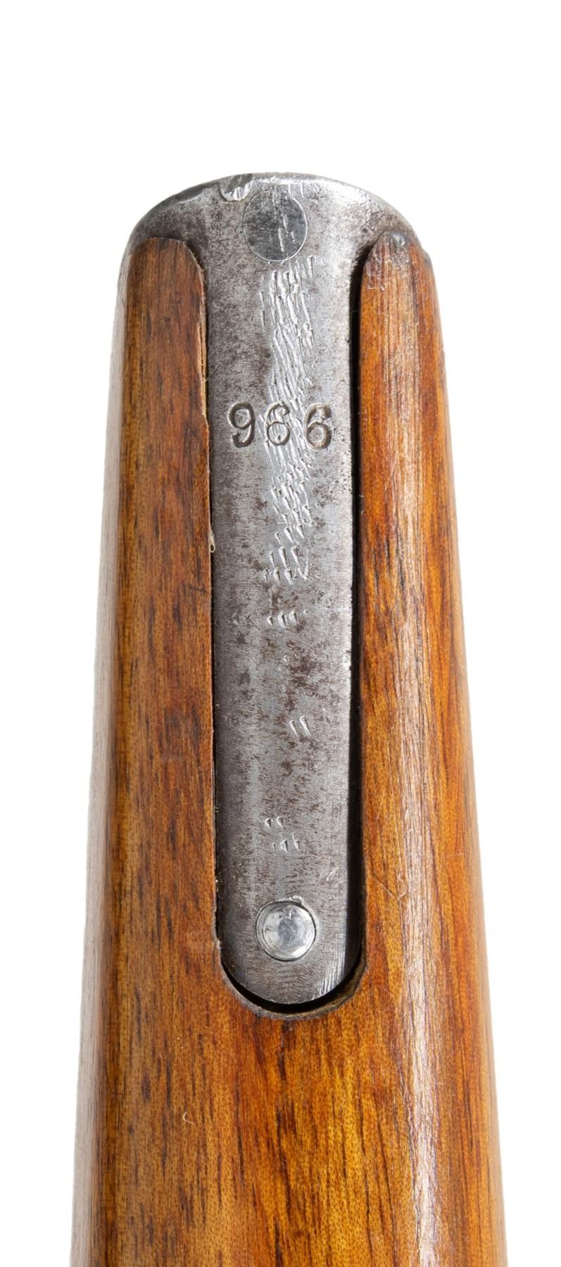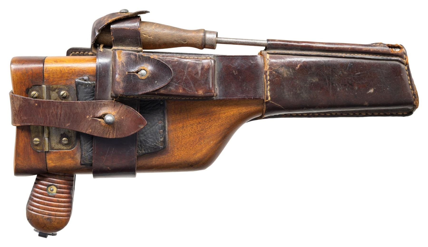 PISTOL WITH STOCK & HARNESS. Cal. 7.63mm. S# 917017. Bbl. 5 1/2". C96 Model 1930 Commercial semi-automatic pistol mfg. by Mauser. Top flat of the faceted breech is marked with Mauser's 3-line address, with a double crowned "U" proof (repeated on top of bolt) marked on the left quarter flat. Left side of the frame is marked with the Mauser banner logo on the "island", with "WAFFENFABRIK MAUSER/ OBERNDORF A. NECKAR/ D.R.P.u.A.P." marked on the right. Metal components exhibit a salt blue finish with the bolt being polished in-the-white. Frame is mounted with 2-piece grooved wood grips, and features a lanyard ring on the butt. Standard C96 pattern fixed blade front sight and tangent V-notch rear sight graduated 50-1000. All serialized parts are matching and include the frame, sub-frame, floorplate, as well as the bbl./bbl. extension (top flat, rear of tangent sight). UNATTACHED ACCESSORIES: non-matching unmarked C96 wood stock/holster with WWI mfg. harness marked "OSKAR SCHEYHING/ CASSEL/ 1916" on the rear. Stock/holster has been sanded and refinished at one time, and features an apparent period added brown leather belt loop, retained via 6 pins/nails on the lower section. CONDITION: metal components retain the majority of their original factory salt blue finish, exhibiting some areas of wear and thinning fading to gray patina (primarily on edges), scattered superficial handling marks, as well as small some small scattered spots of light to mild pitting. Rear grip strap has been cleaned at one time. Bore is bright, exhibiting scattered spots of light to mild pitting and areas of mild to moderate pitting at the muzzle, while retaining well defined rifling throughout. Proper manual mechanics. Grips show scattered superficial marks and small impressions from handling and storage, with a large impression present on the left panel towards the bottom right edge. Stock shows scattered superficial handling marks, but otherwise remains sound, with metal hardware having faded to a gray patina. Leather harness remains malleable, exhibiting general overall wear, with some areas of age related cracking and crazing. Harness exhibits a small hole at the toe of the putzstock provision. (25-6566/MLW). CURIO. $1,500-2,250.
