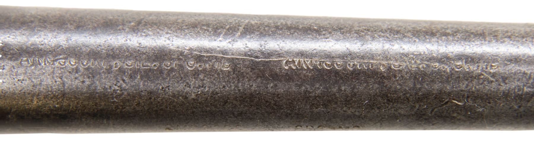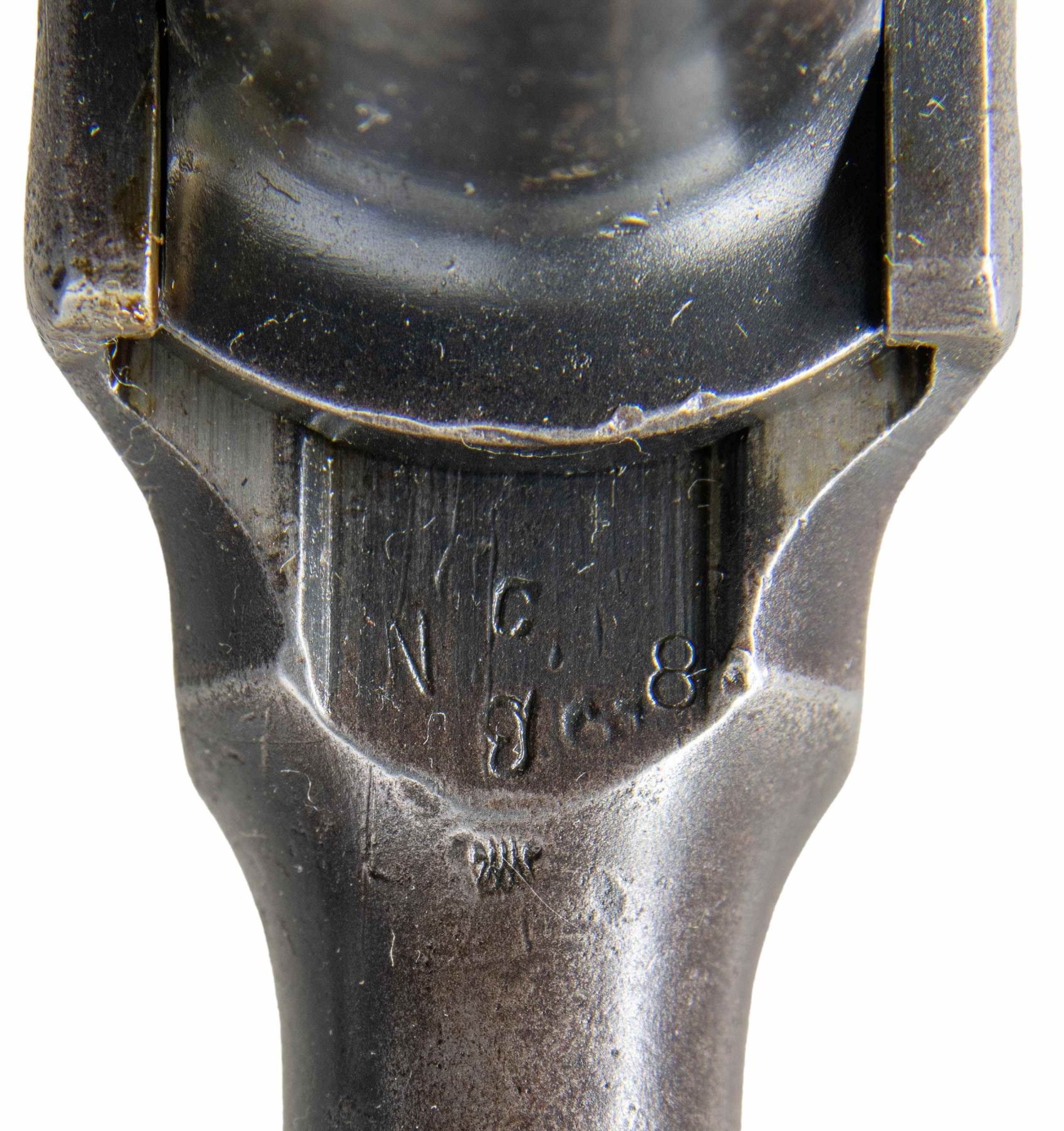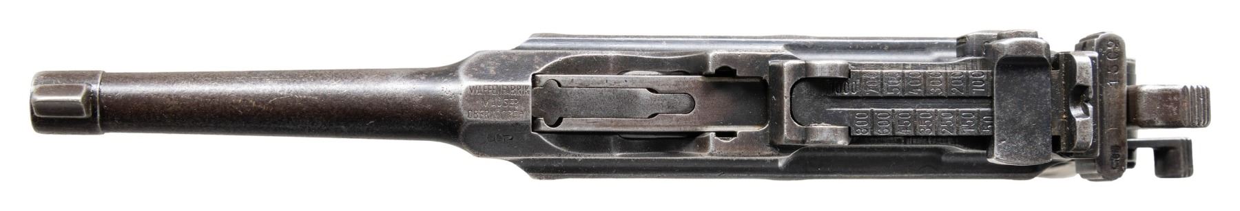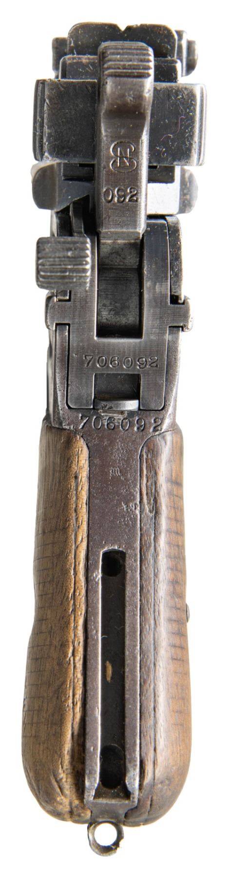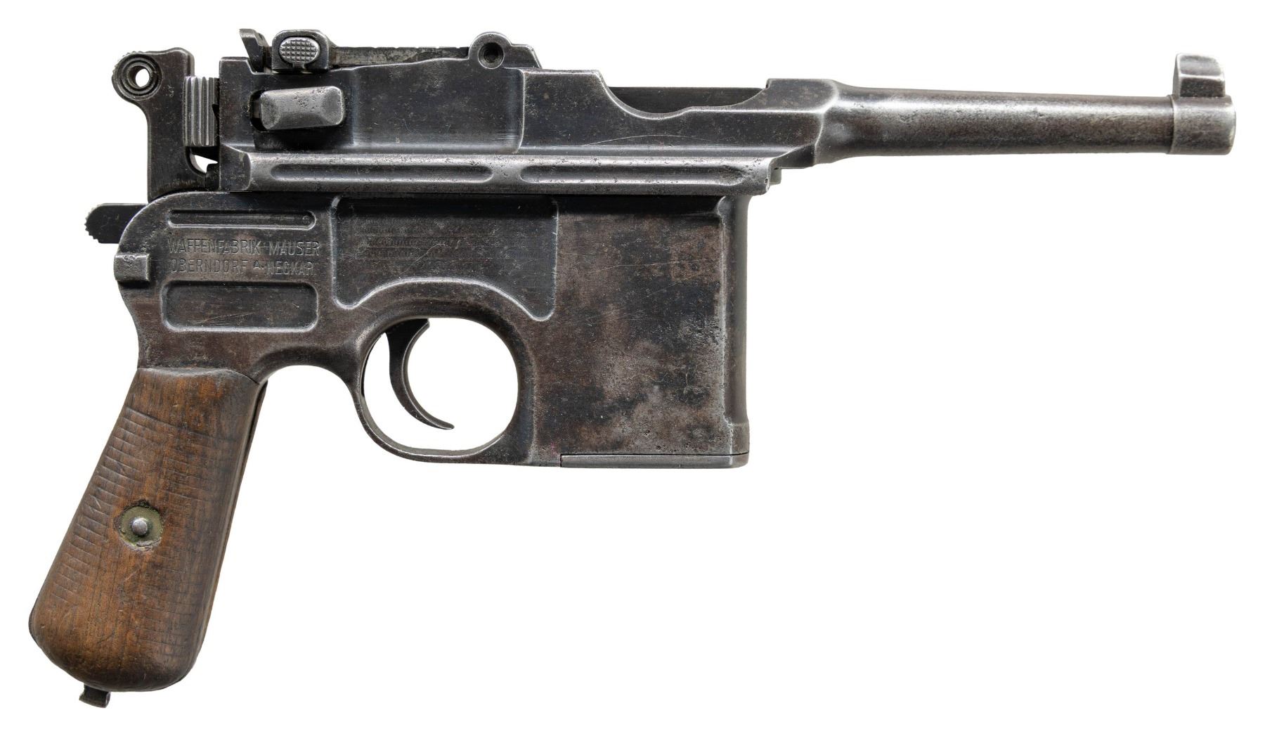 Cal. 7.63mm. S# 706092. Bbl. 3 7/8". C96 Bolo semi-automatic pistol mfg. by Mauser. Standard markings on chamber, with S# marked on left side. Left side of frame is marked with the Mauser banner logo, with Mauser's 2-line address on the right. Left side and underside of bbl. exhibit an illegible import mark. Metal components exhibit a reapplied blue finish overall. Frame is mounted with 2-piece grooved wood grips. Fixed blade front sight, with tangent V-notch rear sight graduated 50-1000. Matching numbers are present on the frame, sub-frame, hammer, and bbl./bbl. extension. CONDITION: metal components retain fair amounts of their reapplied blue finish, showing areas of wear and thinning, as well as scattered spots and areas with varying degrees of pitting overall. Bore exhibits consistent moderate pitting, with no discernible rifling. Grips show heavy smoothing, as well as scattered marks and impressions from handling and storage. Left grip exhibits chipping at the bottom right corner. (25-4357/MLW). CURIO. $300-500.