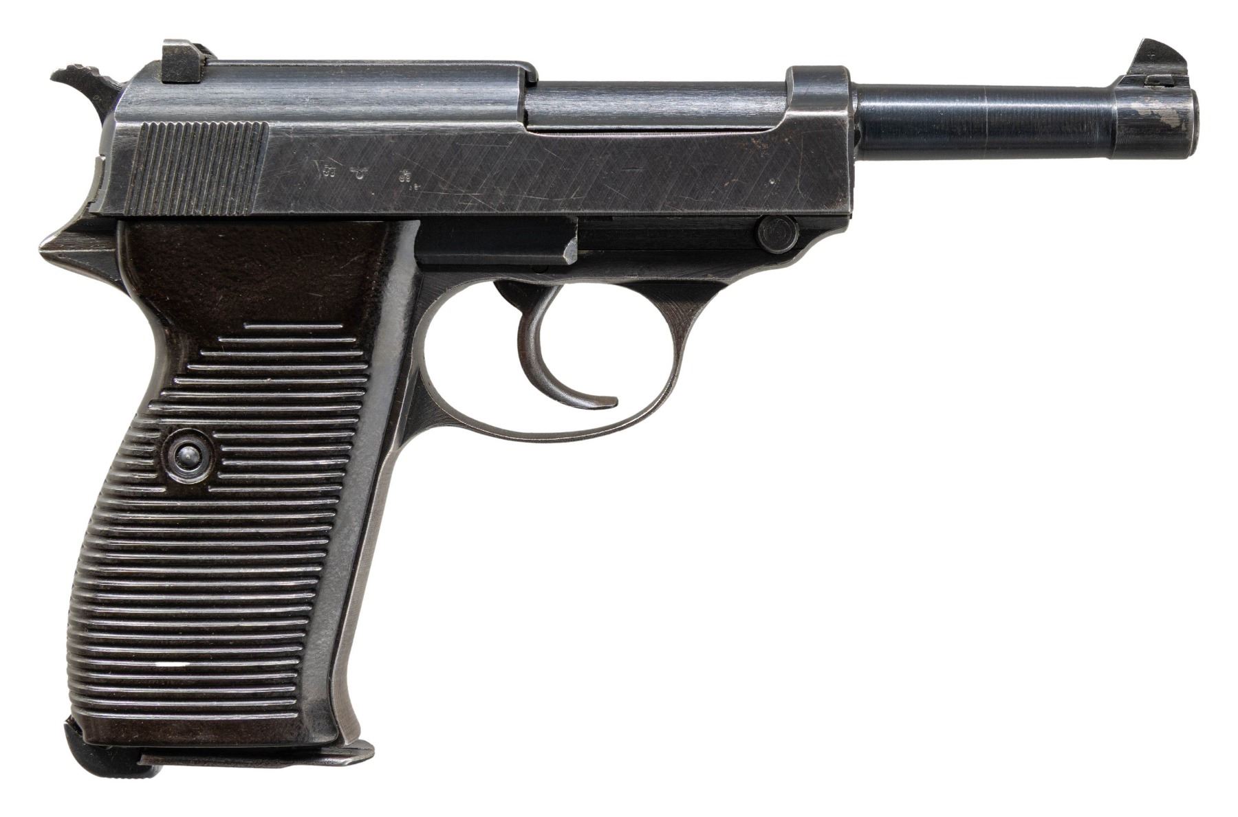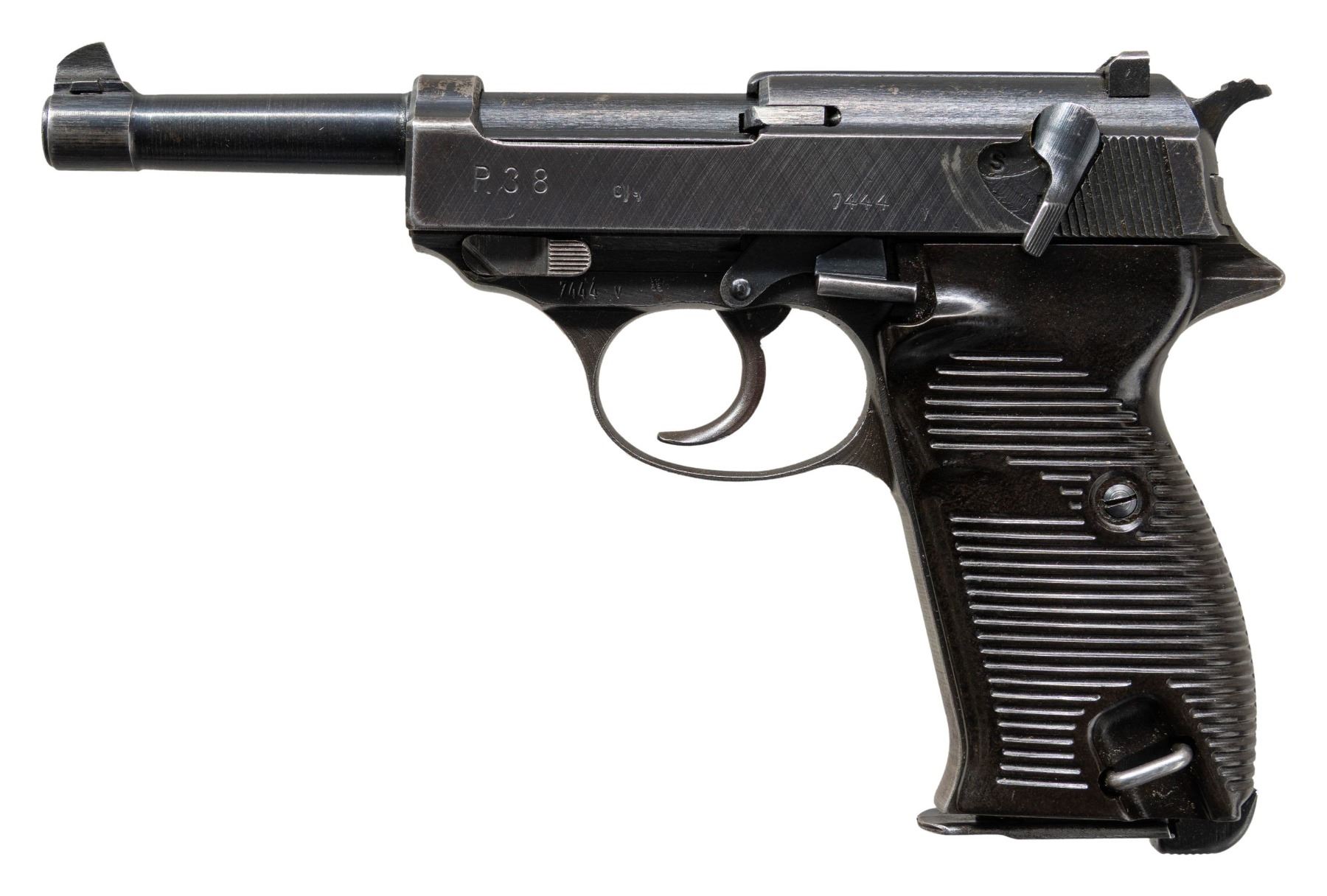 Cal. 9x19mm. S# 7444v. Bbl. 4 7/8". P.38 semi-automatic pistol mfg. during World War II by Spreewerke. Left side of the slide is marked "P.38", followed by Spreewerke's "cyq" mfg. code, and the S#, with Spreewerke Eagle/88 proofs and an eagle firing proof marked on the right. Metal components exhibit a salt blue finish overall. Frame is mounted with 2-piece grooved dark brown pressed resin grips. Standard dovetailed blade front sight with U-notch rear sight. All serialized parts are matching and include the frame, slide, bbl., and locking block. MAGS: 1 blued 8-rd. with 7 transverse indicator holes, stamped with an Eagle/WaA706 above "jvd" on the spine. CONDITION: metal components retain the majority of their original arsenal salt blue finish, showing mild edge wear, some superficial handling marks, and (mostly) small scattered spots of finish loss overall. Front grip strap and underside of trigger guard exhibit a mottled gray patina. Very bright bore, exhibiting some light pitting, while retaining well defined rifling throughout. Grips show a few scattered superficial marks from handling and storage, with the left panel exhibiting a small crack at the rear, stemming from the frame spur. (25-4415/MLW). CURIO. $800-1,200.