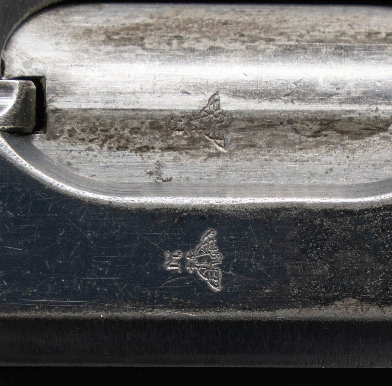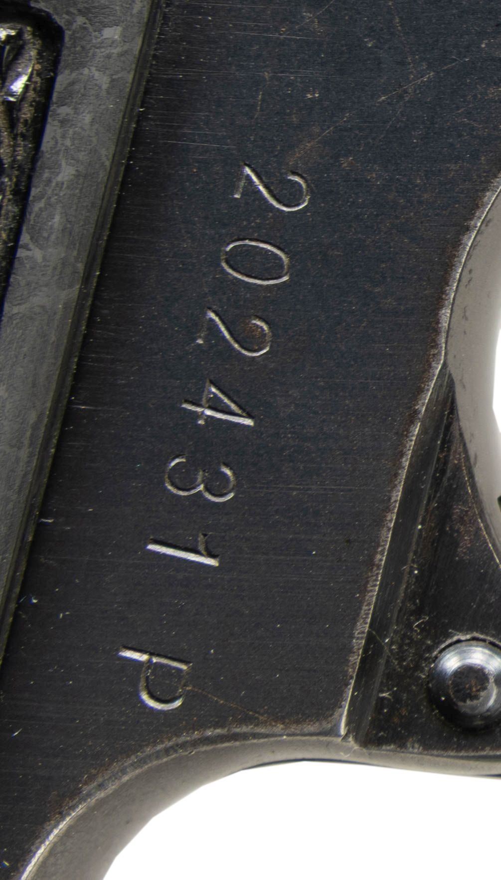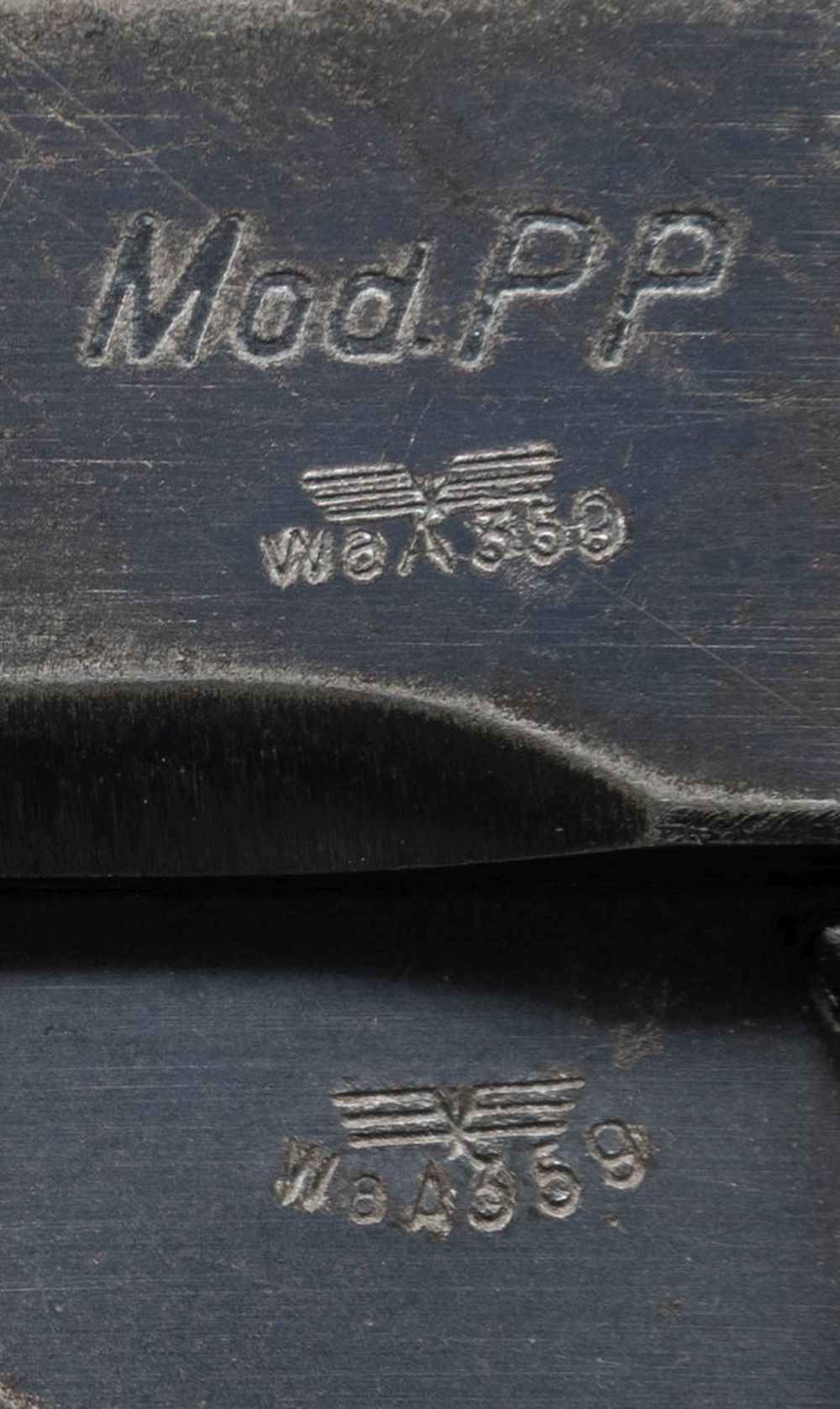 SEMI-AUTOMATIC PISTOL WITH HEEL MAGAZINE RELEASE. Cal. 9mm Kurz (.380 ACP). S# 202431P. Bbl. 3 13/16". 1 of only approx. 1,500 9mm Kurz Model PP semi-automatic pistols mfg. by Walther for the German Army during World War II. According to "Walther Vol. III 1908-1980" by James L. Rankin these pistols were all serialized within a 5,000 S# block, with "Axis Pistols" by Jan C. Still estimating that approx. 1,500 were produced for the German Army from 1940-1945. The left side of the slide is marked with the Walther banner logo, followed by "Waffenfabrik Walther, Zella-Mehlis (Thur.)/ Walther's Patent Cal 9 m/m", as well as "Mod. PP" above an Eagle/WaA359 proof, which is repeated on the left side of the frame. Right side of the frame (on chamber), slide, and bbl. exhibit an Eagle/N commercial nitro proof. Metal components exhibit a blue finish overall, save for on the chamber area of the frame, which is polished in-the-white. Frame is mounted with 2-piece Walther banner checkered black synthetic grips, and features a heel mag. release. Slide features a grooved matte rib, with an integral blade front sight and dovetailed U-notch rear sight. Slide matches the frame via "431", which is etched on the interior, parallel to the ejection port. MAGS: 1 7-rd. marked with the Walther banner logo above "Cal. 9 m/m" on the left side. CONDITION: metal components retain large amounts of their original factory finish, exhibiting areas of wear and thinning overall that show through to gray patina, with some scattered spots of light surface oxidation and pitting. Bore exhibits consistent mild pitting, while retaining strong rifling throughout. Proper manual mechanics, including the safety / decocking lever. Grips show mild smoothing and scattered superficial marks from handling and storage, but otherwise remain sturdy and serviceable. A scarce example of a German WWII issued Walther PP chambered in 9mm Kurz. (25-4253/MLW). CURIO. $1,000-1,500.