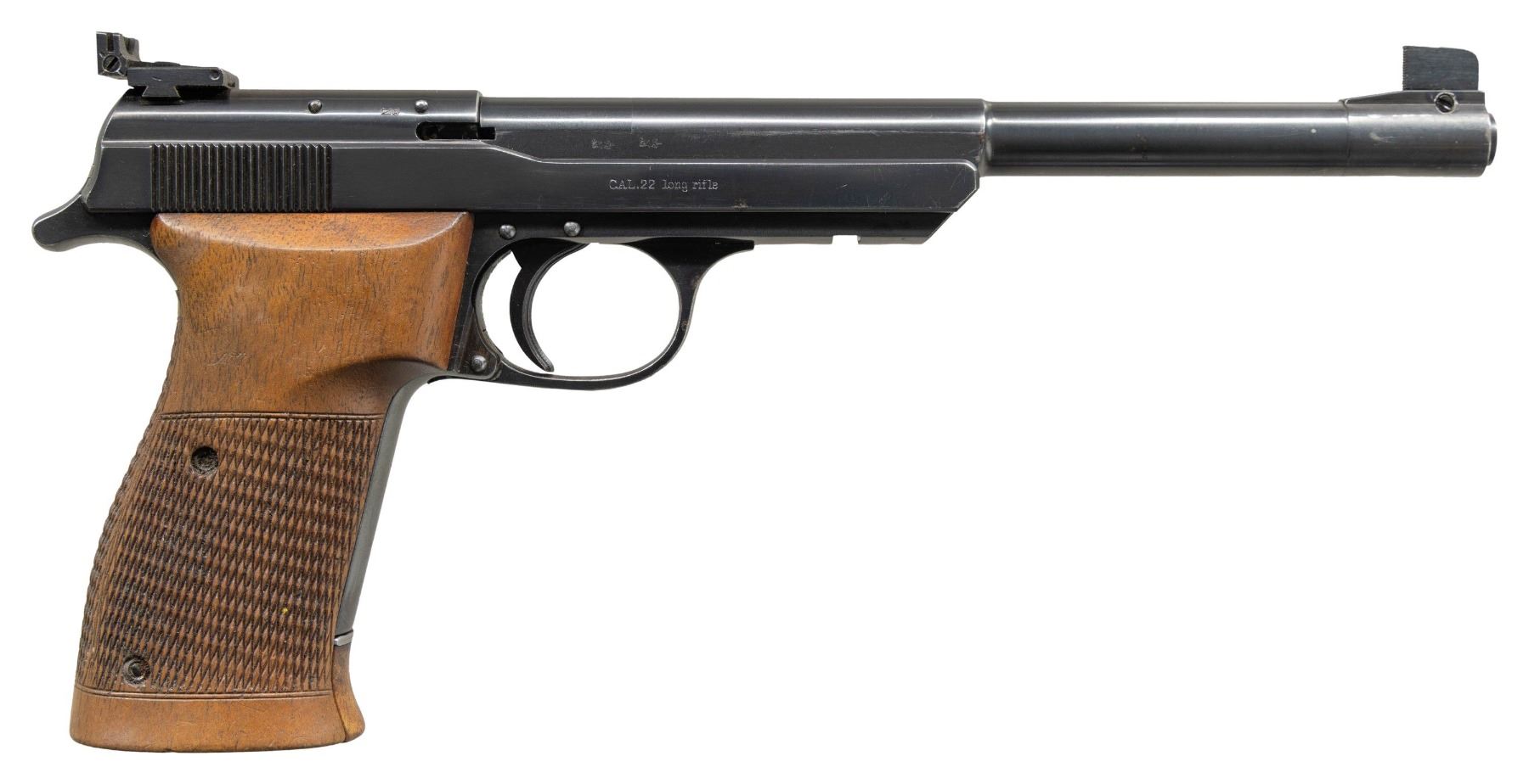 Cal. 22 LR. S# 6978. Bbl. 7 7/16". Model 1936 Olympia semi-automatic pistol mfg. by Walther. Left side of the slide is marked with the Walther banner logo, followed by Walther's mfg. information, and "Olympia-Pistole", with "CAL. 22 Long rifle" marked on the right. Right side of the slide, breech, and bbl. are marked with a Crown/N commercial nitro proof. Metal components exhibit a blue finish overall. Frame is mounted with 2-piece checkered wood grips, with the left panel featuring a thumbrest. High profile ramped blade front sight, with the slide featuring a flat grooved rib and a Micro adj. square notch rear sight. Underside of frame is drilled for a counterweight attachment. All serialized parts are matching and include the frame, slide, grips (interior), and wood mag. extension (left). Extractor is absent. MAGS: 1 8-rd. with aforementioned wood grip extension. CONDITION: metal components retain the majority of their original factory blue finish, exhibiting light to mild edge wear and some spots of light surface oxidation, with some patches of finish loss present on the bbl. Mirror bore, retaining well defined rifling throughout. Proper manual mechanics. Grips show some superficial handling marks, but otherwise presents nicely. (25-4252/MLW). CURIO. $800-1,200.