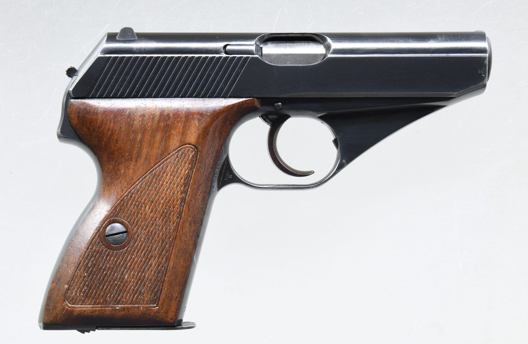HSC SEMI-AUTOMATIC PISTOL. Cal. 7.65mm. S# 711841. Bbl. 3 1/4". 1st Variation Model HSc semi-automatic pistol mfg. by Mauser for German police issue, as detailed on page 223 of "Axis Pistols" by Jan C. Still. Left side of the slide is marked with the Mauser banner logo, followed by "Mauser-Werke A.G. Oberndrof a.N./ Mod. HSc Kal. 7,65mm". Left side of the rear trigger guard web is marked with a German Eagle/L police proof. Right side of the frame, slide, and bbl. exhibit an Eagle/N commercial nitro proof. Metal components exhibit a high polish salt blue finish overall, save for on the bbl., which is polished in-the-white. Frame is mounted with 2-piece flat checkered wood grips and features a slot for a lanyard stud on the heel/butt. Slide features a matte grooved sight channel, with an integral blade front sight and dovetailed U-notch rear sight. All serialized parts are matching and include the frame, slide, and bbl. MAGS: 1 8-rd. mag., with 7 transverse indicator holes. CONDITION: metal components retain the vast majority of their original high polish salt blue finish, showing some light to mild edge wear, a few small scattered spots of light pitting, as well as a few small spots of wear showing through to gray patina. Bore is bright, exhibiting mild to moderate pitting along the lands, while retaining well defined rifling throughout. Proper manual mechanics. Grips show scattered marks and a few impressions from handling and storage, but otherwise remain sturdy and serviceable. (25-4257/MLW). CURIO. $600-900.