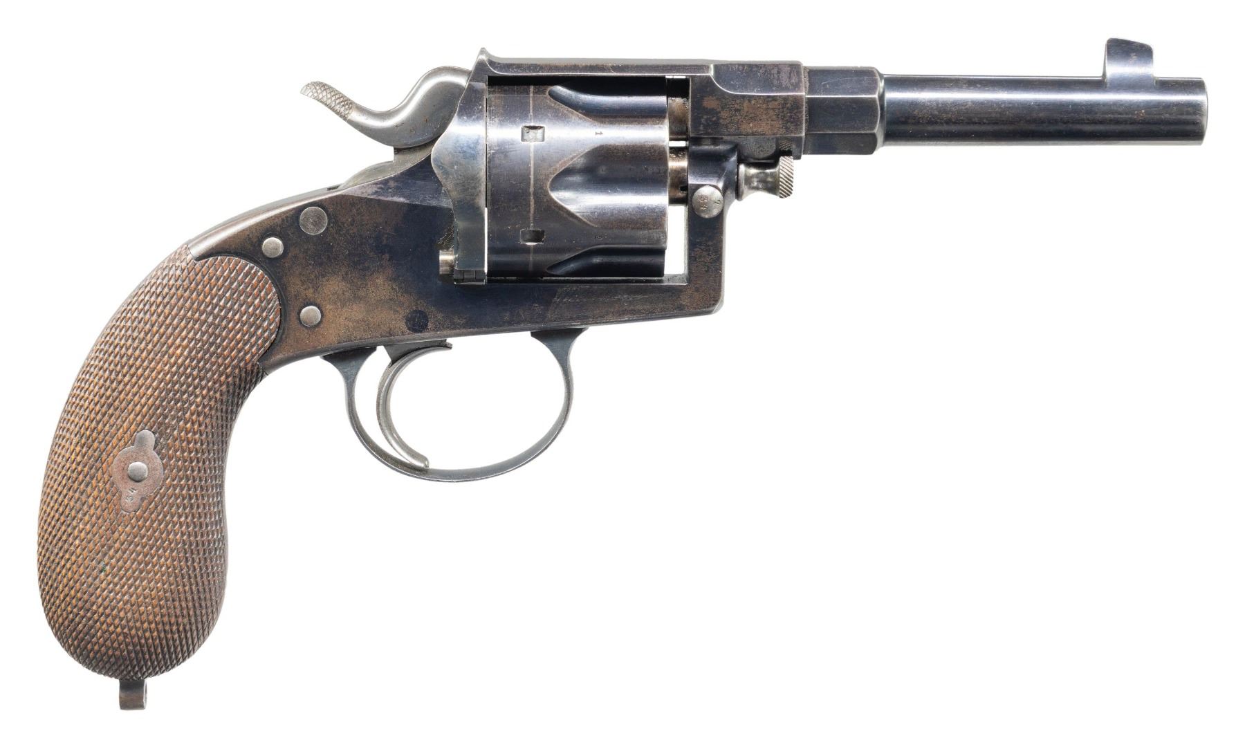 REICHSREVOLVER WITH ORIGINAL HOLSTER. Cal. 10.6x25mmR. S# 134s. Bbl. 4 5/8". Model 1883 Reichsrevolver mfg. by V.C. Schilling & C.G. Haenel. Left side of the faceted breech section of the bbl. is marked with a Bavarian "GF" acceptance proof (repeated on rear face of cyl.) preceding the S#. The left frame sideplate is marked with the S#, followed by "V.C.S. * C.G.H./ SUHL" within an oval. Butt of frame is stamped with an imperial crowned fraktur proof on either side of the lanyard stud. Metal components exhibit a polished blue finish overall, save for on the hammer, trigger, and cyl. base pin, which are polished in-the-white. Safety lever exhibits a nitre blue finish. Frame is mounted with 2-piece checkered wood grips. Interior of left grip panel exhibits a hand written "BOB MUELLER/ 9 FEB 1994" in pencil. Integral blade front sight and frame V-notch rear sight. All serialized parts are matching and include the frame, frame sideplate, bbl., cyl., cyl. base pin, cyl. base pin latch pin, loading gate assembly, frame screws, trigger guard, safety lever, safety lever screw, internal parts (trigger, cyl. stop, hand assembly, trigger, mainspring), grips, as well as the grip screw escutcheons. UNATTACHED ACCESSORIES: unmarked period brown leather holster, featuring a 6-cell cartridge pouch on the front of the body, containing 1 rd. of ammunition. Cartridge pouch is unusual, featuring a leather ball stud for the closure pouch. CONDITION: metal components retain large amounts of their period arsenal blue finish, exhibiting areas of wear and thinning that are fading to gray patina, as well as some scattered spots of light surface oxidation overall. Grip straps have faded to a dark brown patina. In-the-white parts show scattered spots of age related discoloration. Mirror bore, exhibiting a couple of small spots of light pitting, while retaining well defined rifling throughout. Proper manual mechanics. Grips are very good, showing some light smoothing overall. Holster remains malleable, exhibiting varying degrees of age related cracking and crazing overall. PROVENANCE: From the Buckstix Collection. (01-28599/MLW). ANTIQUE. $1,500-2,500.