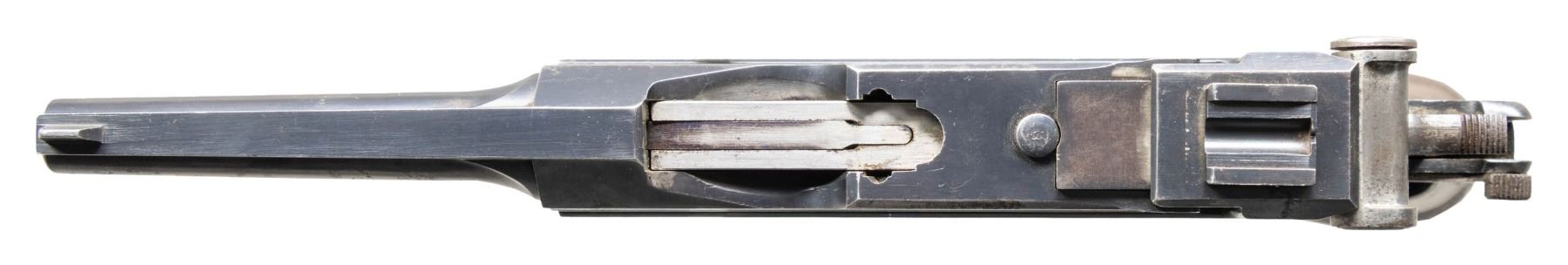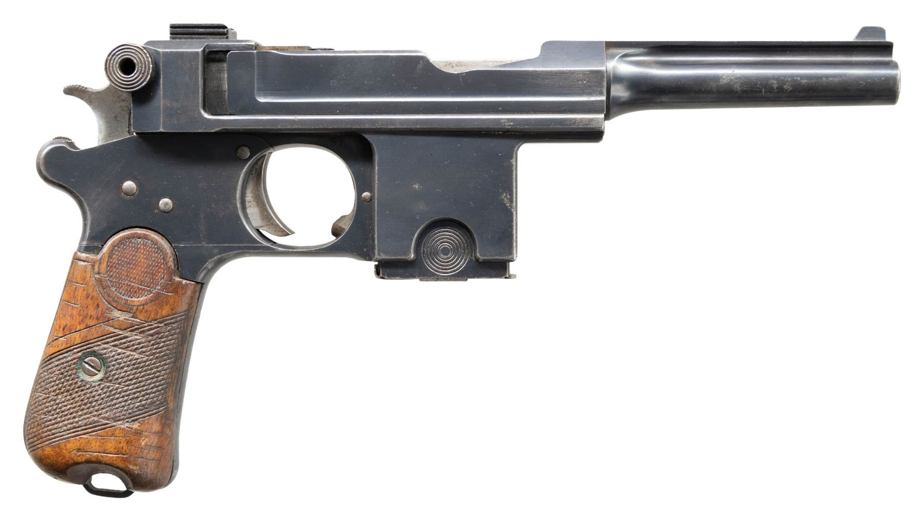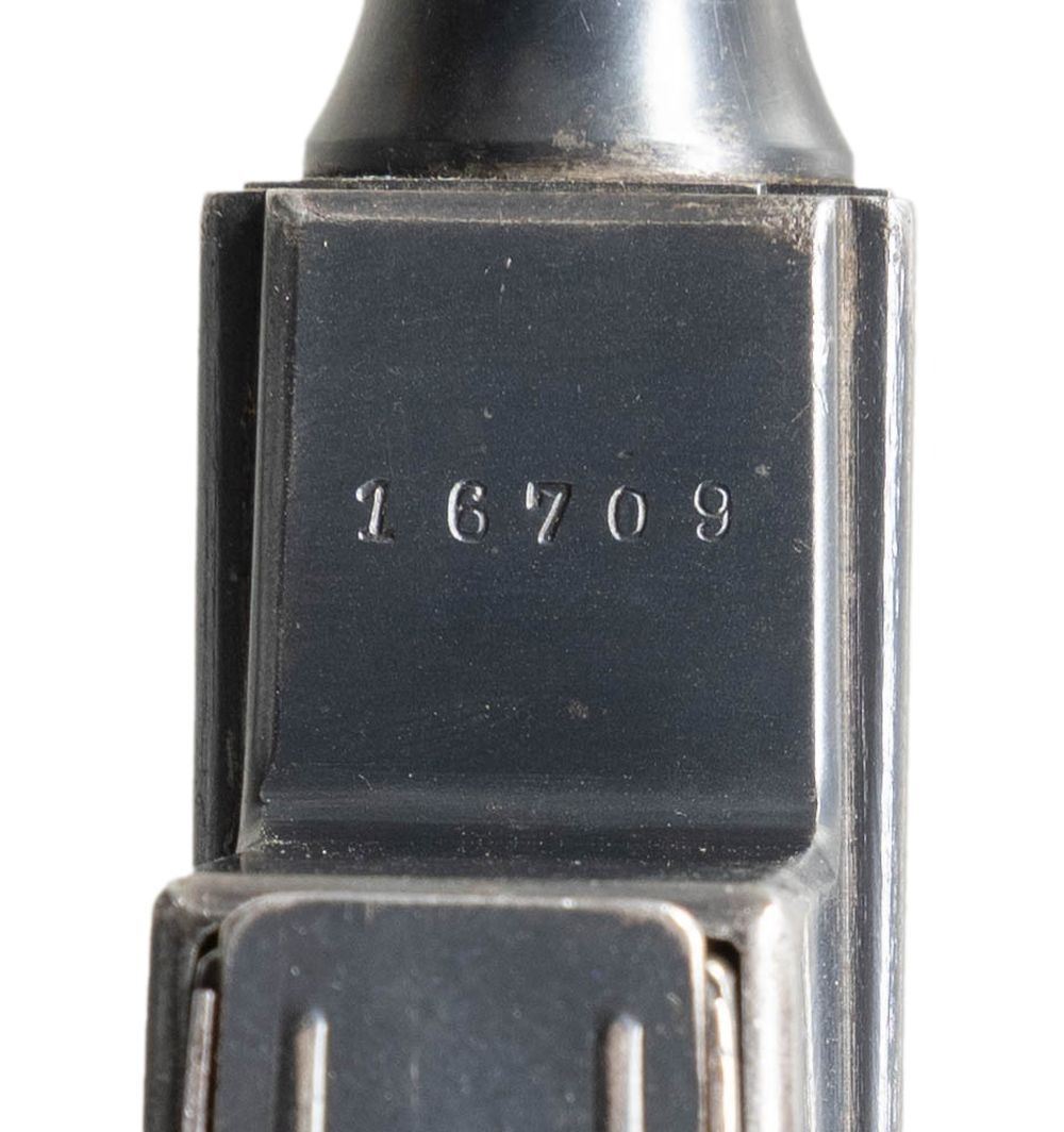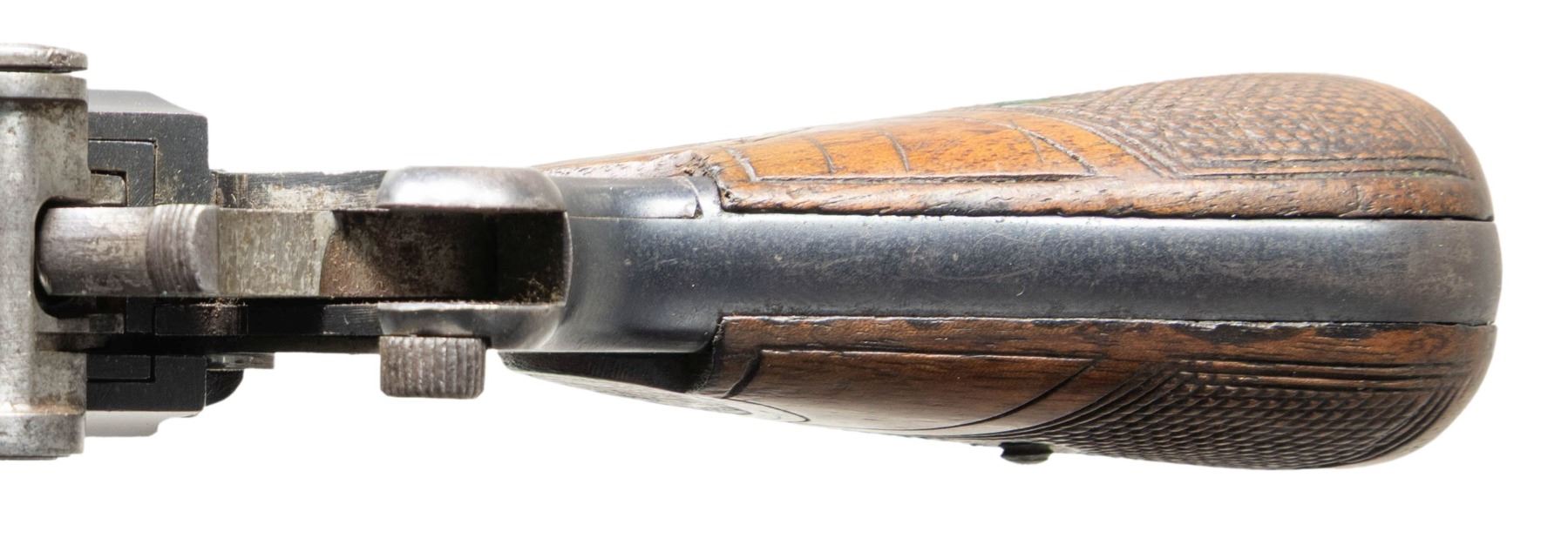 1910 SEMI-AUTOMATIC PISTOL. Cal. 9mm Bergmann. S# 16709. Bbl. 4". Model 1910 semi-automatic pistol mfg. by Anciens Etablissements Pieper while under German occupation during World War I. Left side of the bbl. extension is marked "BREVETTE./ S.G.D.G.", followed by "ANCIENS ETABLISSEMENTS PIEPER./ HERSTAL-LIEGEW./ BERGMANN'S PATENT.". Frame, bbl., and bbl. extension are devoid of any Belgian commercial proofs, as is standard for German occupation examples. Metal components exhibit a rust blue finish overall, with some small parts being strawed. Bolt assembly is properly polished in-the-white. Frame is mounted with 2-piece checkered wood grips. Solid rib with integral blade front sight and V-notch rear sight on bolt spring retainer. All serialized parts are matching and include the frame, and bbl. extension, as is standard for German occupation examples. MAGS: 1 6-rd. CONDITION: metal components retain large amounts of their original arsenal blue finish, showing some areas of wear and thinning fading to gray patina, some scattered superficial handling marks, as well as scattered spots/small patches of mild pitting overall. Left side of the bbl. exhibits mild to moderate pitting, as well as wear and striations from prior cleaning. Strawed parts have faded to a gray patina, exhibiting scattered spots/patches of light to mild pitting and age related discoloration. Extractor retains traces of nitre bluing. Bore exhibits consistent dark mild pitting, while retaining well defined rifling throughout. Proper manual mechanics. Left grip is good, showing light to mild smoothing, with scattered superficial handling marks and impressions. Right grip show mild to moderate smoothing, scattered superficial marks and impressions, as well as what appears to be numerous intentionally cut lines overall. PROVENANCE: The Esteemed Norm Greenberg Collection. (25-4168/MLW). CURIO. $2,000-3,000.