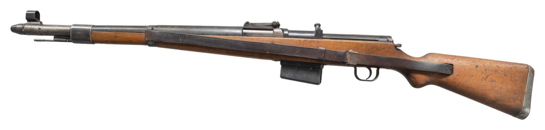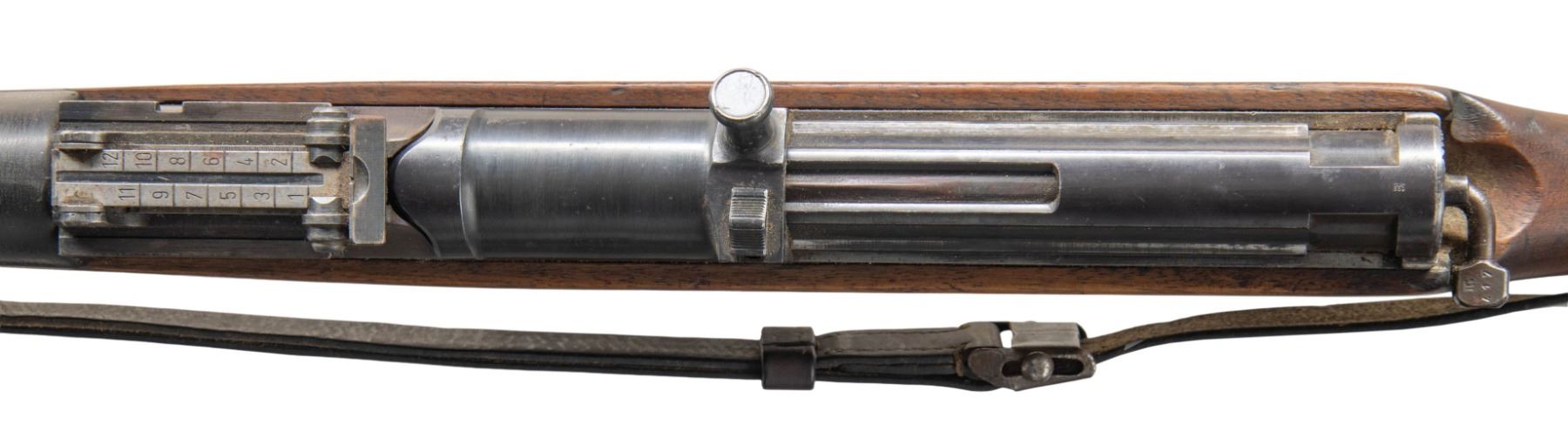 Cal. 8x57 (8mm Mauser). S# 6417. Bbl. 22 1/2". Standard G41 sights with front sight hood. Rear sight base has ZF41 scope rails. Mag is unnumbered but other visible numbers are matching with stock number being faint. Left side of receiver has "G.41 (W) 6417 ac" marking denoting 1943 Walther mfr. Blued finish. Walnut stock with black composite handguard. Left side sling provisions with worn leather sling. Left side of butt has two faint eagle "359" inspection stamps. Cleaning rod present. CONDITION: sanded stock set shows some staining, scattered dings, scratches & handling marks. Metal retains 50% blue with mag having reblue appearance with finished over pitting, scattered edge wear, fading to gray, oxidation more heavy on buttplate, handling marks & dings. Action is sluggish but functional when hand cycled. Very good bright bore with some minor pitting towards muzzle. (25-6169/MJC). CURIO. $4,000-6,000.