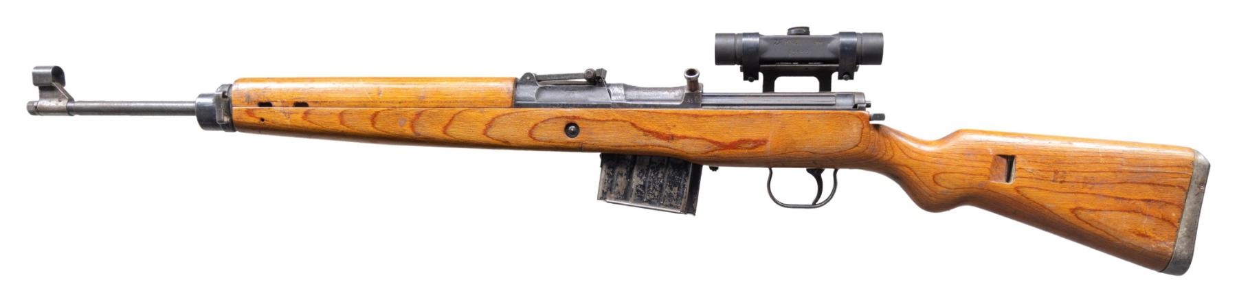 Cal. 8mm Mauser. S# 7671a. Bbl. 22" threaded. Standard G43 sights. Rifle is also equipped with a dow coded ZF4 scope on a post-war Czech mount. Scope has post reticle & green tinted optics. All visible parts are mismatched with parts having mixed inspection stamps. Dust cover missing. AC44 coded early Walther G43. Metal has a mix of bluing && phosphate finishes. Gustloff made laminated stock set. No cleaning rod present. MAGS: 1-10 rd. marked "gcb" & "K43". CONDITION: refinished stock has added varnish with thin crack behind trigger guard, a couple long thin cracks on handguard, scattered dings, handing marks & staining. Metal shows scattered strong arsenal blue traces, fading to gray, oxidation, edge wear & some light pitting bbl. Action functions properly when scope mount is off but mount needs adjustment for proper bolt function. Bore shows some light pitting & frosting but strong rifling. (25-5057/MJC). CURIO. $1,500-2,250.