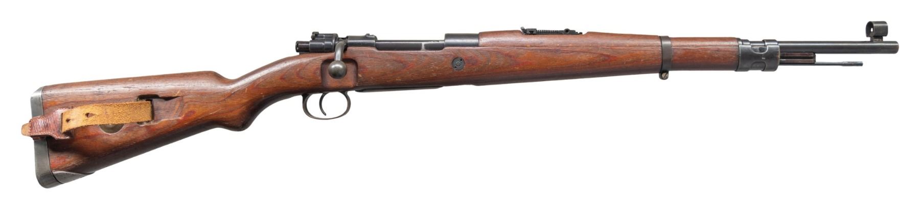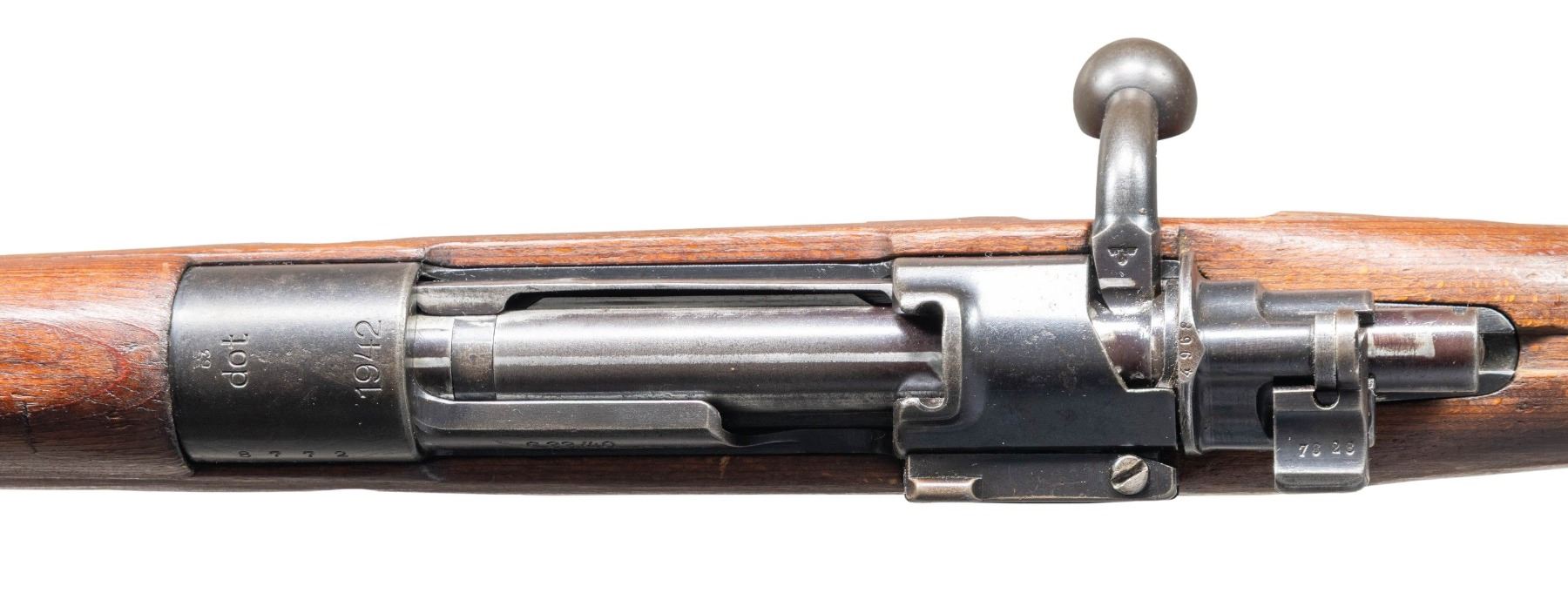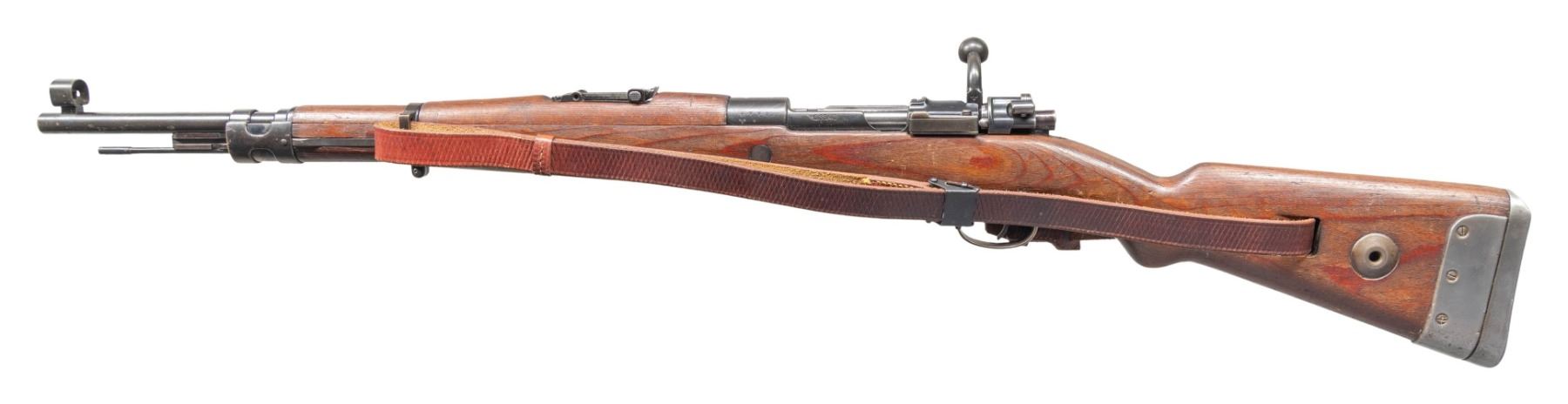 Cal. 8x57 (8mm Mauser). S# 8772a. Bbl. 19". Blade front sight with added white paint & hood. Tangent rear sight graduated to 1000m. Bolt body is of the correct type but mismatched & rear half of bolt appears to be from a K98k. Stock number is illegible. receiver ring has "dot 1942" markings denoting 1942 mfr. by Waffen Werke Brunn I. Reblued finish. Laminated stock set with left side sling provisions & repro sling. Cleaning rod present that appears to be a replacement. CONDITION: stock set appears sanded with added finish, some dings & handling marks. Metal retains 70% of a dark reblue that shows scattered edge wear, areas turning brown, some oxidation & handling marks. Action functions properly when hand cycled. Bore shows some scattered frosting & pitting but strong rifling. (25-4769/MJC). CURIO. $1,000-1,500.
