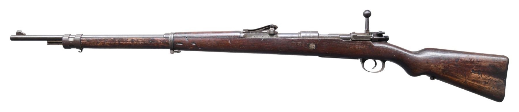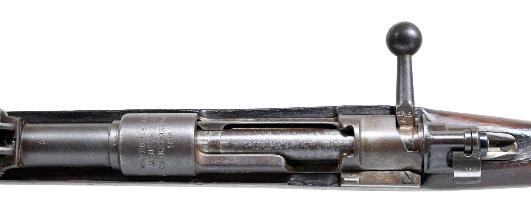 BOLT ACTION RIFLE. Cal. 8mm Mauser. S# 1908v. Bbl. 29 1/2". Gewehr 98 bolt action rifle mfg. by Mauser in 1916 for the Imperial German military. The top of the receiver is marked "WAFFENFABRIK/ MAUSER A.G./ OBERNDORF/ 1916", with imperial Mauser arsenal proofs marked on the right. Top of the bbl. is marked with an "S", indicating use with Spitzer ammunition. 1-piece plain wood pistol grip stock, with plain wood handguard. Right side of stock is marked with imperial proofs on the butt. Interior of stock is carved with what appears to read "William U'Olier". Stock and handguard have been sanded and revarnished at one time. Buttplate is marked "5/ W" above an indiscernible imperial proof, with "L" marked to the right of the lower buttplate screw. Dovetailed blade front sight (rear sight of ramp checkered), with "roller coaster" rear sight, graduated 4-20. Matching numbers are present on the receiver, bolt stop housing, sear, bbl., blade front sight, rear sight assembly, trigger guard, floorplate, follower, buttstock, handguard, bayonet lug, and buttplate. Bolt assembly, bbl. bands, and receiver screws are mismatched. Receiver retention screws are absent. CONDITION: metal components retain traces of their original arsenal blue finish (in protected areas), with the balance exhibiting a dark gray patina, with light to mild pitting present overall. Very bright bore, exhibiting scattered spots of light to mild pitting, while retaining well defined rifling throughout. Wood furniture shows scattered marks and impressions from handling and storage, but otherwise remain sturdy and serviceable. Stock exhibits some scattered spots of adhesive on the butt from a previously applied tape. (25-1375/MLW). CURIO. $600-1,000.