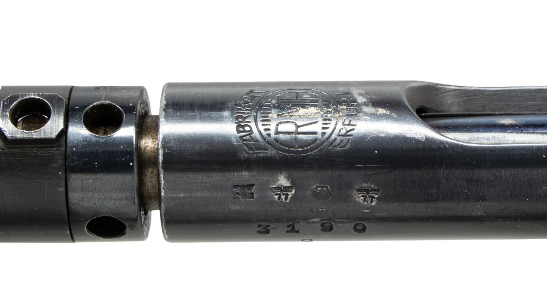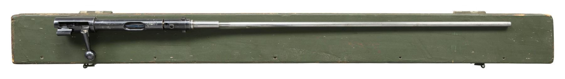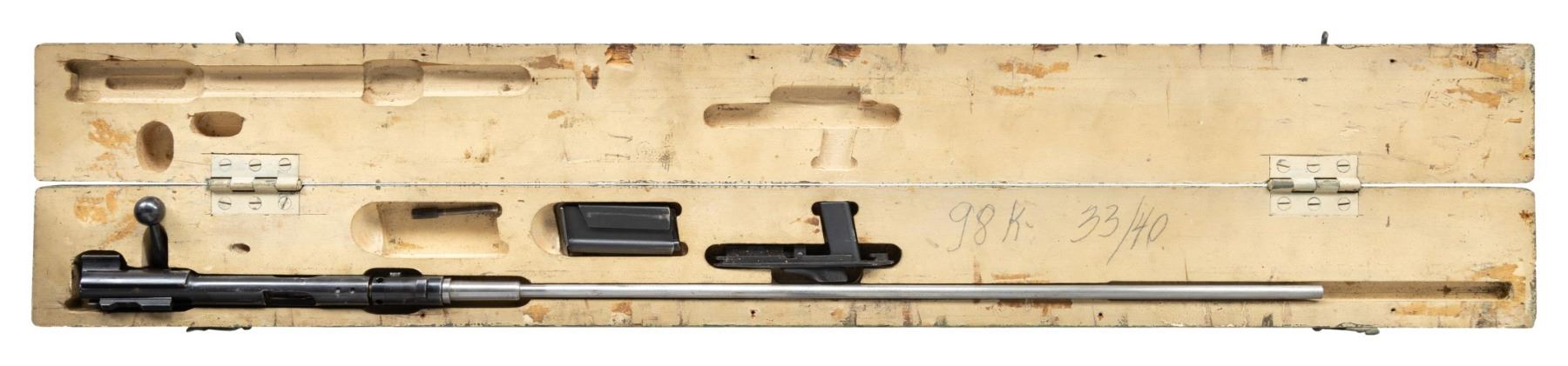 Cal. 22 LR. S# 3190c. Bbl. 22". All visible matching numbers. 1937 dated Erma conversion kit for the K98k Mauser. Blued finish. MAGS: 1-5 rd. UNATTACHED ACCESSORIES: green transit case with "33/40" & "98K" stenciled on inside. CONDITION: metal retains 90% original blue with some edge wear, staining & light oxidation. Bright near excellent bore. (25-6163/MJC). CURIO. $1,000-1,500.