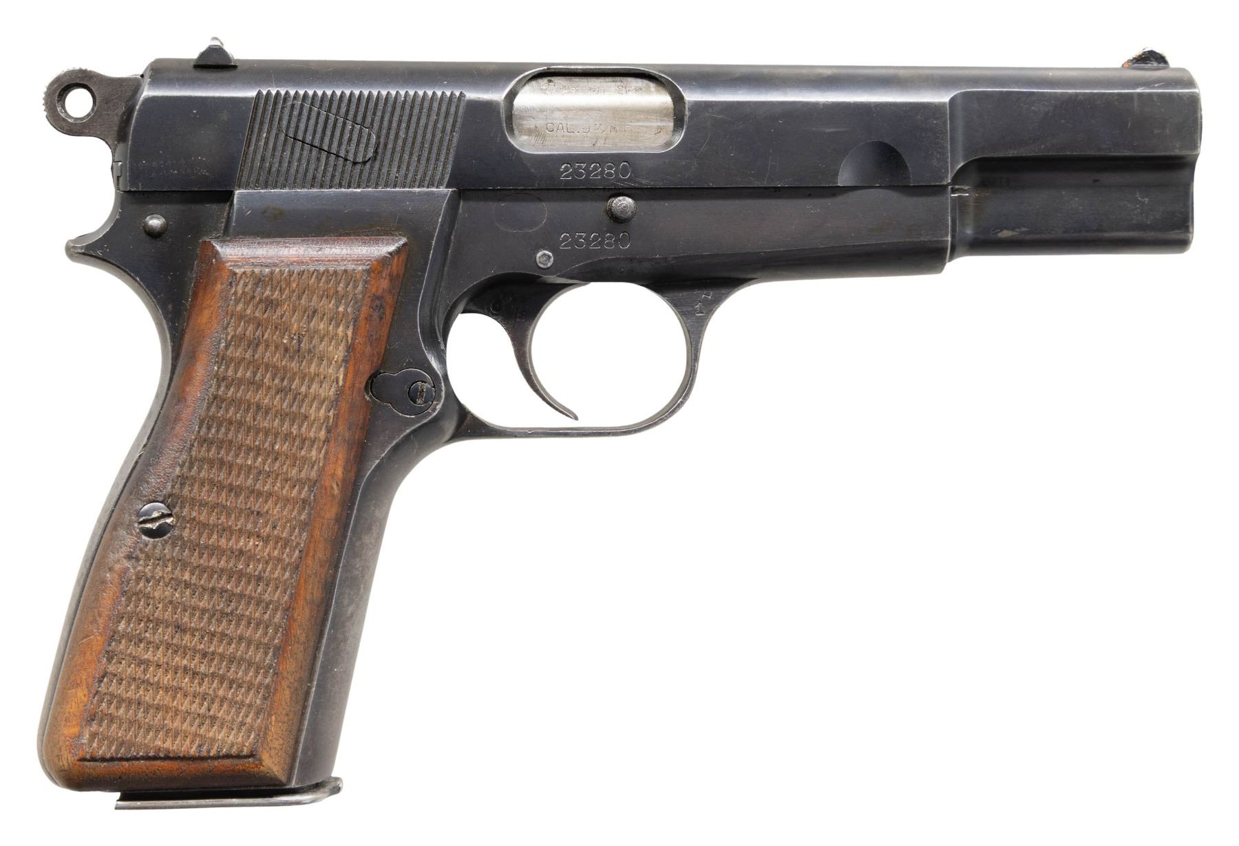 POWER SEMI-AUTOMATIC PISTOL. Cal. 9mm Luger. S# 23280. Bbl. 4 5/8". High Power semi-automatic pistol mfg. by Fabrique Nationale, seemingly under contract for Denmark. While there are no proofs or markings, nor has any research turned up any documentation suggesting that there was a Danish police contract, it is believe that the Danish police acquired a small number of High Power pistols, with the only notable feature of this High Power having been sent to Denmark being the characteristic serrated blade front sight. The left side of the slide is marked "FABRIQUE NATIONALE D'ARMES DE GUERRE/ HERSTAL BELGIQUE/ BROWNING'S PATENT DEPOSE". Left side of the frame, slide, and right side of the bbl. exhibit Belgian commercial proofs. Metal components exhibit a blue finish overall, save for on the bbl., which is polished in-the-white. Frame is mounted with 2-piece checkered wood grips. Danish pattern serrated blade front sight with dovetailed U-notch rear sight. All serialized parts are matching and include the frame, slide, and bbl. MAGS: 1 blued 13-rd. mag. with black enamel finished button type floorplate. UNATTACHED ACCESSORIES: unmarked Danish brown leather holster. CONDITION: metal components retain large amounts to the majority of their original factory blue finish, showing spots of light to mild wear and edge wear, scattered superficial handling marks, as well as scattered spots of light surface oxidation overall. Grip straps have mostly faded to a gray patina. Very bright bore, exhibiting some light pitting, while retaining well defined rifling throughout. Proper manual mechanics, save for the mag. safety, which does not function. Grips show light general wear, with some scattered superficial marks and impressions, but otherwise remain sound. Holster remains malleable, exhibiting scattered handling marks and spots of light to mild crazing. Right corner of closure flap's stitching is torn. PROVENANCE: The Estate Collection of Charles Wagner. (25-428/MLW). CURIO. $1,500-2,500.