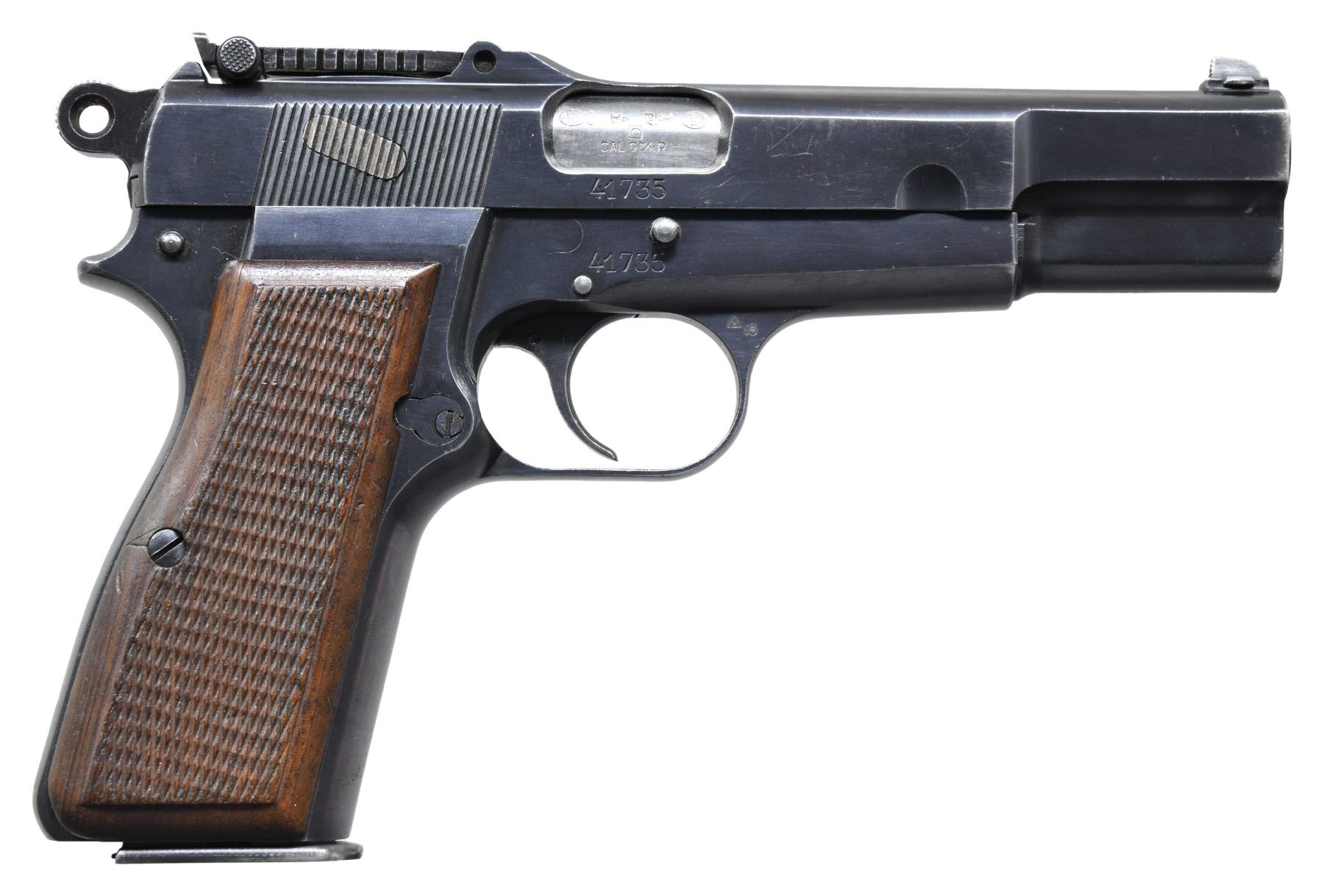 HIGH POWER SEMI-AUTOMATIC PISTOL. Cal. 9mm Luger. S# 41735. Bbl. 4 5/8". High Power semi-automatic pistol mfg. by Fabrique Nationale under contract for the Belgian army, circa. 1939 to 1940. The left side of the slide is marked "FABRIQUE NATIONALE D'ARMES DE GUERRE/ HERSTAL BELGIQUE/ BROWNING'S PATENT DEPOSE", above Belgian military and commercial proof marks. Left side of the frame also exhibits Belgian military and commercial proofs, with a Crown/GC on the frame and a Crown/AC proof marked on the forward trigger guard web. Metal components exhibit a blue finish overall, save for on the bbl., which is polished in-the-white. Slotted frame is mounted with 2-piece checkered wood grips, which feature red anti-moisture barrier paint on the interior of the panels. Thumbprint slide features a dovetailed blade front sight, with a tangent V-notch rear sight, graduated 50-500. All serialized parts are matching and include the frame, slide, and bbl. MAGS: 1 phosphate 13-rd. mag. with blued split tail floorplate, marked with Belgian proofs on the spine. CONDITION: metal components retain the majority of their original factory blue finish, exhibiting some areas of wear and thinning that show through to gray patina (primarily on edges), with scattered superficial handling marks present overall. Grip straps exhibit some scattered spots of light surface oxidation. Very bright bore, exhibiting light pitting, while retaining strong rifling throughout. Grips show mild smoothing, as well as a few marks and minor impressions from handling and storage, but otherwise remain sturdy and serviceable. PROVENANCE: The Estate Collection of Charles Wagner. (25-422/MLW). CURIO. $1,750-2,250.