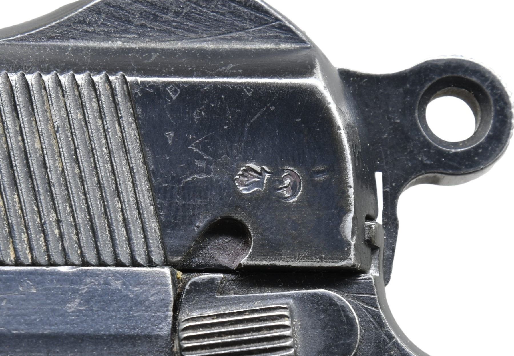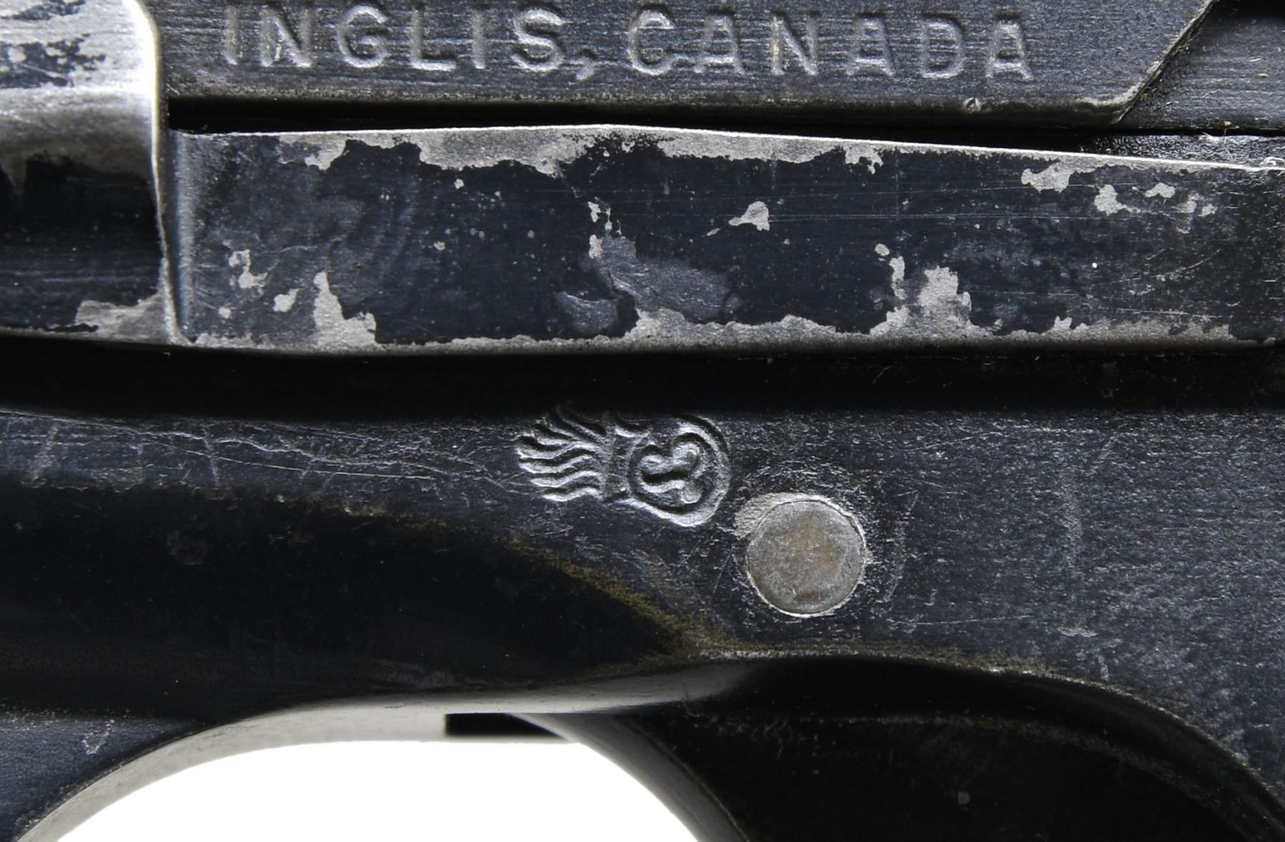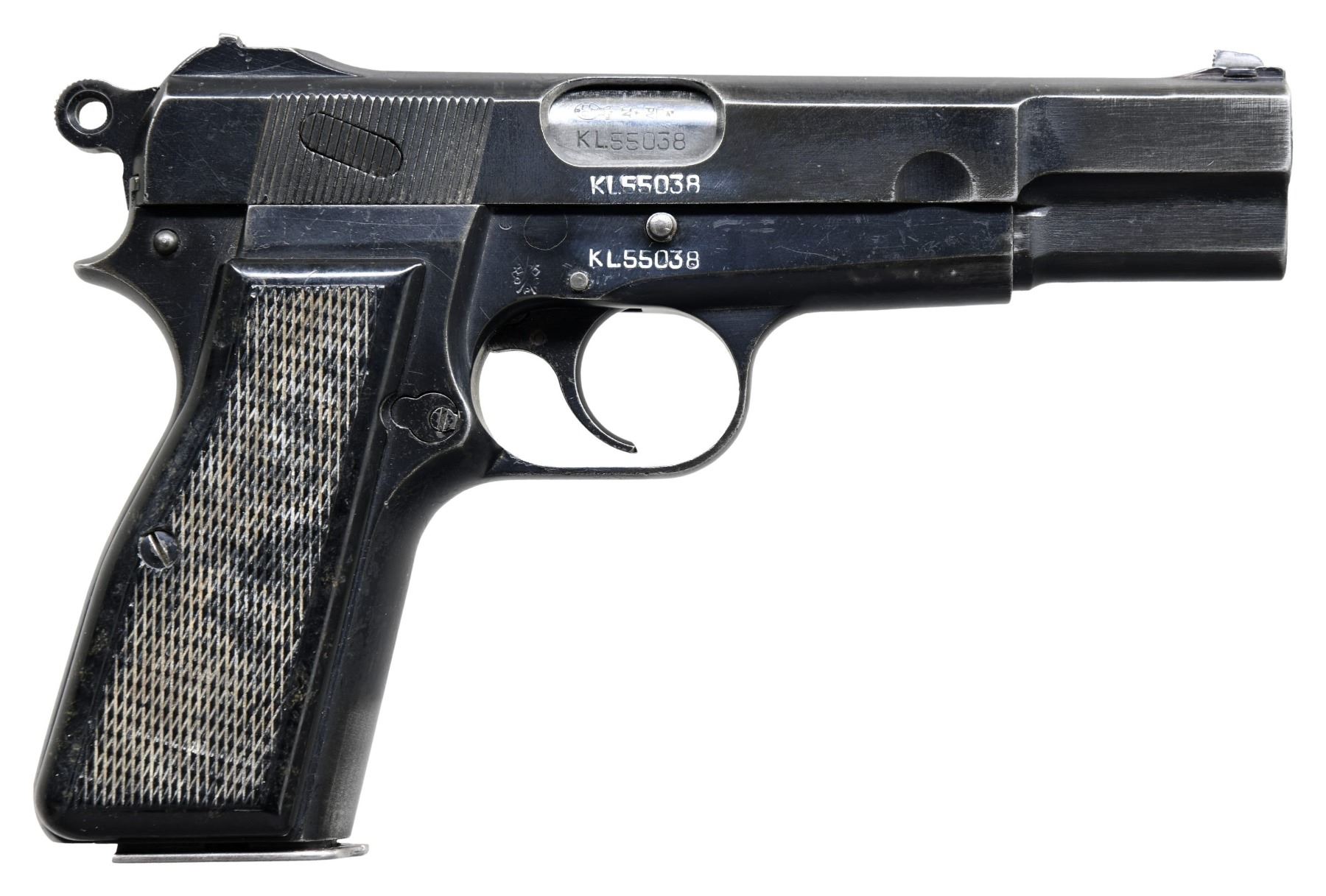 HIGH POWER SEMI-AUTOMATIC PISTOL. Cal. 9mm Luger. S# KL55038. Bbl. 4 5/8". No.2 MK.I* semi-automatic pistol mfg. in Canada by Inglis under contract for the Netherlands, and subsequently rebuilt by Fabrique Nationale. By 1950s, the Dutch required many replacement parts and components for their MK.I* pistols. Due to Inglis ceasing mfg. of the MK.I* series of High Power pistols and Canadian Forces unwillingness to part with the remaining parts they had on hand, the Dutch turned to FN. FN subsequently reworked a number of Dutch MK.I* pistols, at a minimum replacing the bbl. and other worn parts, while also reproofing each pistol. The left side of the slide is marked "MK I*" above "BROWNING-F.N. 9MM. H.P." and "INGLIS, CANADA". Left side of the frame and slide exhibit a Belgian "L" within a flaming ordnance bomb proof (indicating non-Belgian mfg.). Right side of the frame exhibits Canadian proofs. Frame and slide have been renumbered in the 1960s in correspondence with the Dutch's new numbering scheme. Metal components exhibit a black enamel type finish overall, save for on the bbl., which exhibits a phosphate finish. Frame is mounted with 2-piece checkered black synthetic grips, and features a lanyard stud and ring on the left side. Thumbprint slide features a dovetailed blade front sight, with a fixed square notch rear sight. All serialized parts are matching in the "stacked" fashion, and include the frame, slide, and bbl. MAGS: 1 matte black 13-rd. mag., with blued button type floorplate. UNATTACHED ACCESSORIES: notes from Charles Wagner detailing this variation, as well as an invoice from William O. Drollinger (William O. Drollinger is described as a noted American High Power Collector in Blake Stevens' book, "The Browning High Power Automatic Pistol") dated October 9th of 2000, listing this pistol by S#. CONDITION: metal components retain the majority of their arsenal black enamel type finish, exhibiting some areas of wear and thinning that show through to gray and brown patinas, some scattered superficial handling marks, as well as spots of flaking overall. Near mirror bore, exhibiting light pitting, while retaining well defined rifling throughout. Grips show scattered marks and impressions from handling and storage, but otherwise remain sturdy and serviceable. A rare example of an FN rebuilt Dutch contract Inglis No.2 MK.I* High Power pistol. PROVENANCE: The Estate Collection of Charles Wagner. (25-430/MLW). CURIO. $1,500-2,000.