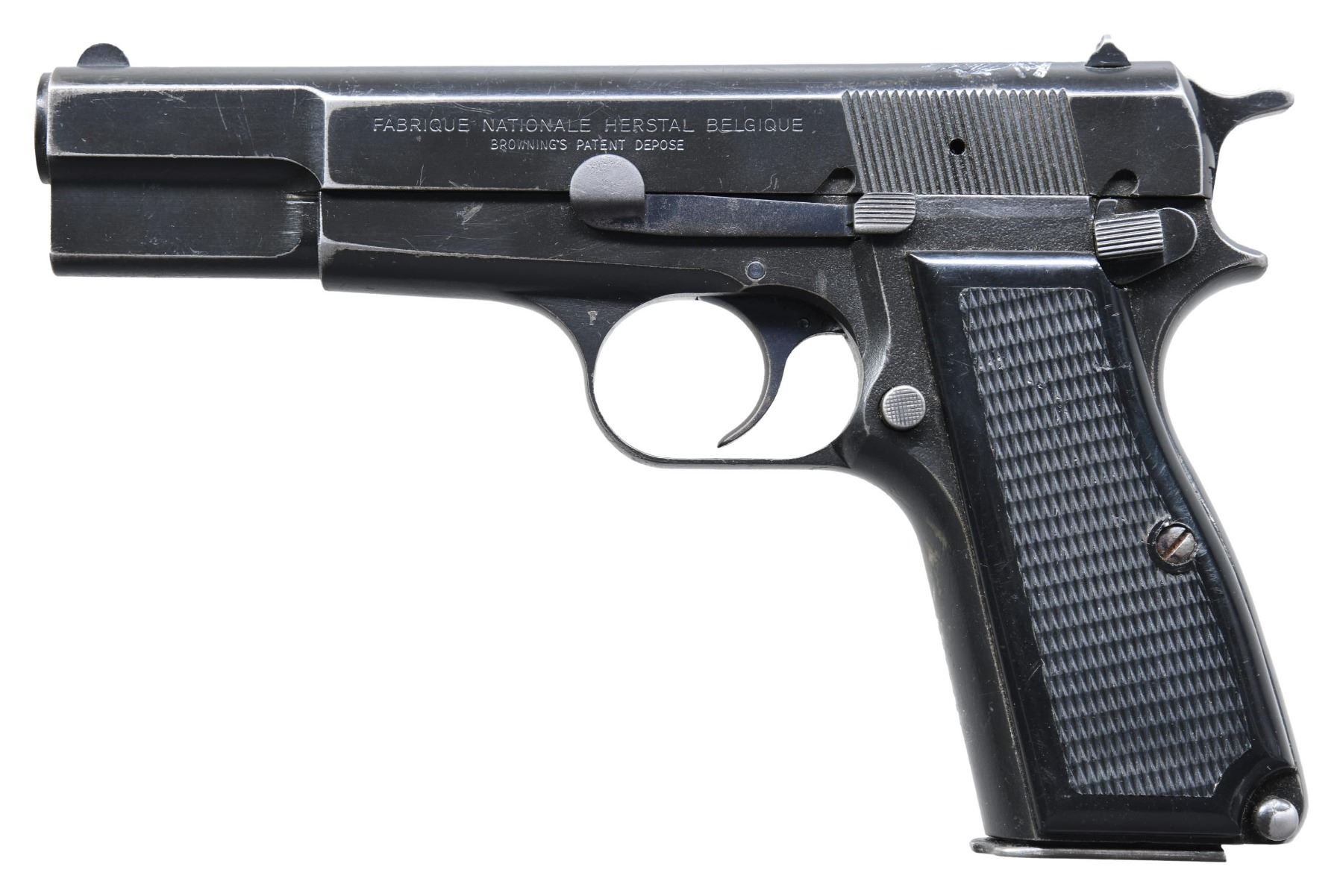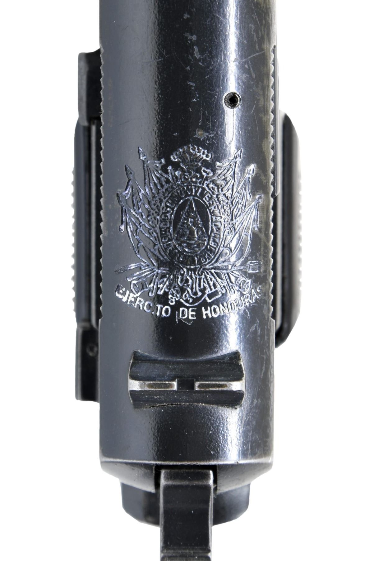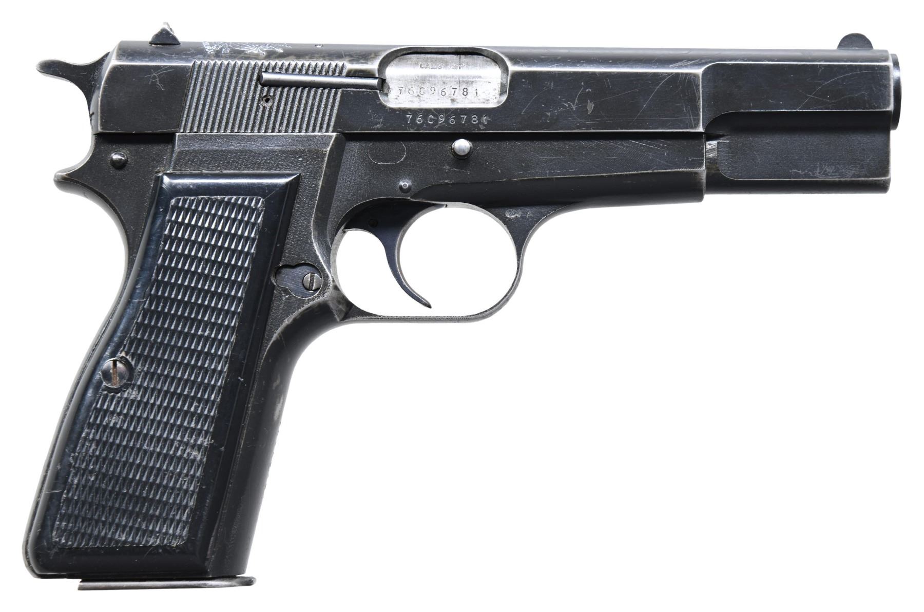 HIGH POWER SEMI-AUTOMATIC PISTOL. Cal. 9mm Luger. S# 76C96781. Bbl. 4 5/8". Possibly the only known High Power semi-automatic pistol mfg. by Fabrique Nationale under contract for the Honduran army in the U.S. The left side of the slide is marked "FABRIQUE NATIONALE HERSTAL BELGIQUE/ BROWNING'S PATENT DEPOSE", with the Honduran coat of arms above "EJERCITO DE HONDURAS" marked over the top, towards the rear sight. Metal components exhibit a black enamel type finish (applied over a phosphate finish) overall, save for on the 2-piece bbl., which is polished in-the-white. Trigger exhibits a blue finish. Frame is mounted with 2-piece checkered black synthetic grips, and features a lanyard stud (ring absent) on the left side. Slide features an external extractor, with a fixed half-moon blade front sight, and dovetailed square notch rear sight. All serialized parts are matching and include the frame, slide, and bbl. MAGS: 1 blued 13-rd. mag., with black enamel finished button type floorplate. UNATTACHED ACCESSORIES: notes from Charles Wagner. CONDITION: metal components retain the majority of their black enamel finish, exhibiting areas of wear and thinning (primarily on edges) that show through to gray patina, with scattered superficial handling marks and some spots of minor flaking present overall. Bore is bright, exhibiting scattered spots of moderate pitting, while retaining strong rifling throughout. Grips show scattered superficial marks from handling and storage, but otherwise remain sturdy and serviceable. PROVENANCE: The Estate Collection of Charles Wagner. (25-433/MLW). MODERN. $1,500-2,500.