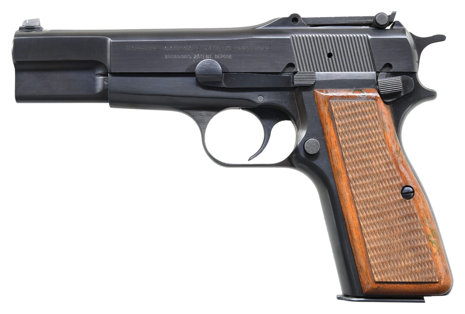NATIONALE "EL CAPITAN" HIGH POWER SEMI-AUTOMATIC PISTOL, WITH BROWNING SOFT CASE. Cal. 9mm Luger. S# 74C06333. Bbl. 4 5/8". One of very few "El Capitan" High Power semi-automatic pistols mfg. by Fabrique Nationale to incorporate the Post-1973 "FABRIQUE NATIONALE HERSTAL" name change on the slide legend, with most "El Capitan" pistols being built with earlier pattern marked slides, which included Browning's importer information. This example, mfg. by Fabrique Nationale in 1974, is marked "FABRIQUE NATIONALE HERSTAL BELGIQUE/ BROWNING'S PATENT DEPOSE" on the left side of the slide. Right side of the forward trigger guard web and 2-piece bbl. exhibit a Belgian commercial proof. Metal components exhibit a blue finish overall, save for on the bbl., which is polished in-the-white. Slotted frame is mounted with 2-piece varnished checkered wood grips, which feature red anti-moisture barrier paint on the interior of the panels. Slide features an external extractor, with a dovetailed blade front sight and tangent V-notch rear sight, graduated 50-500. All serialized parts are matching and include the frame, slide, and bbl. MAGS: 1 phosphate 13-rd. with blued button type floorplate. UNATTACHED ACCESSORIES: non-matching Browning black leather soft case. CONDITION: fine, with metal components retaining bountiful amounts of their original factory blue finish, exhibiting a few superficial handling marks, which are primarily present on the left side of the slide. Mirror bore, retaining a layer of grease, while retaining well defined rifling throughout. Grips are very good to excellent overall. Soft case shows some light wear, but otherwise remains sturdy and serviceable. An extremely rare example of a Fabrique Nationale Herstal marked "El Capitan" High Power pistol. PROVENANCE: The Estate Collection of Charles Wagner. (25-423/MLW). CURIO. $1,500-2,500.