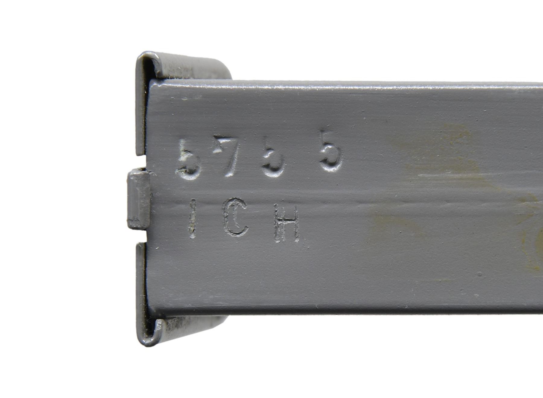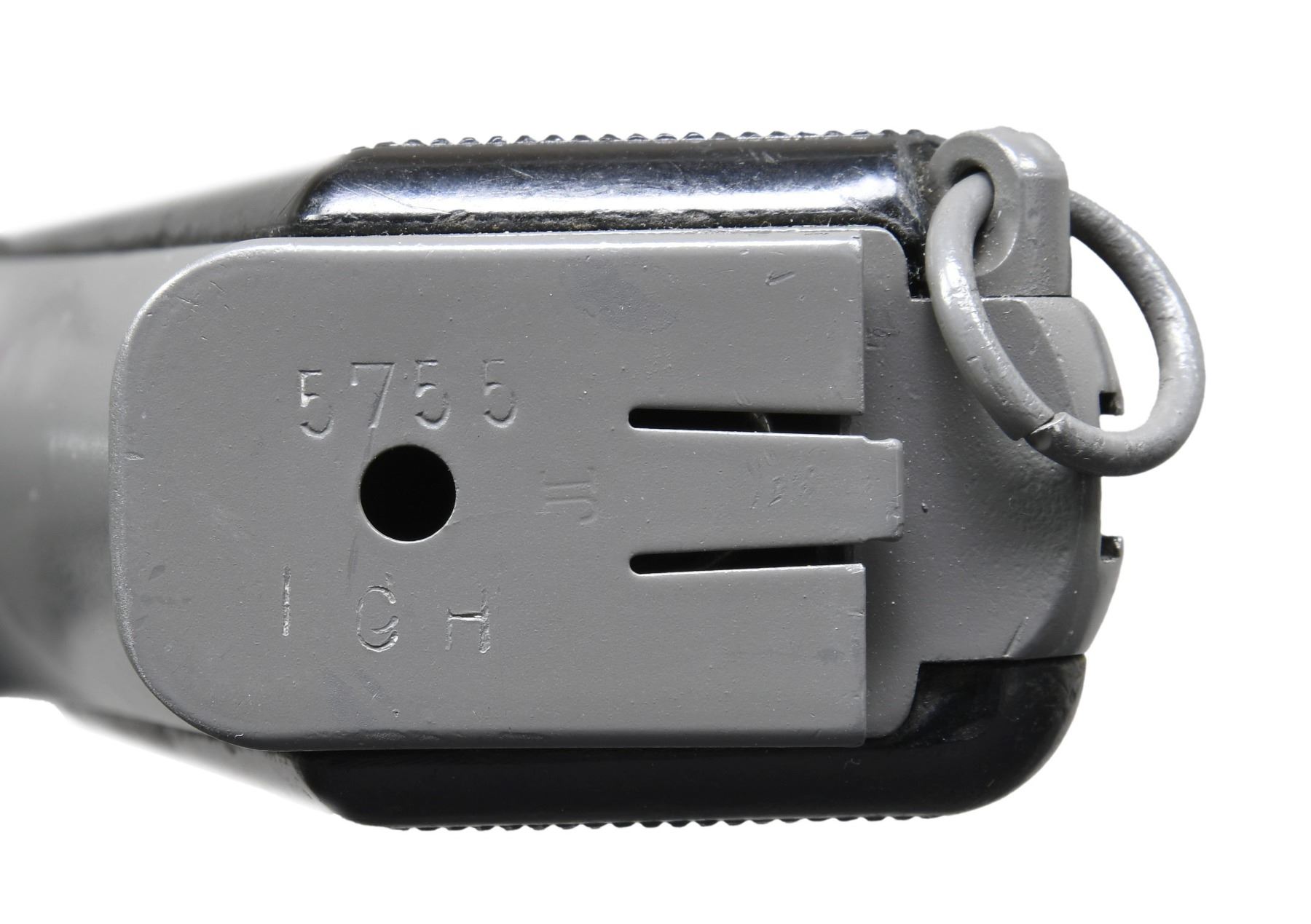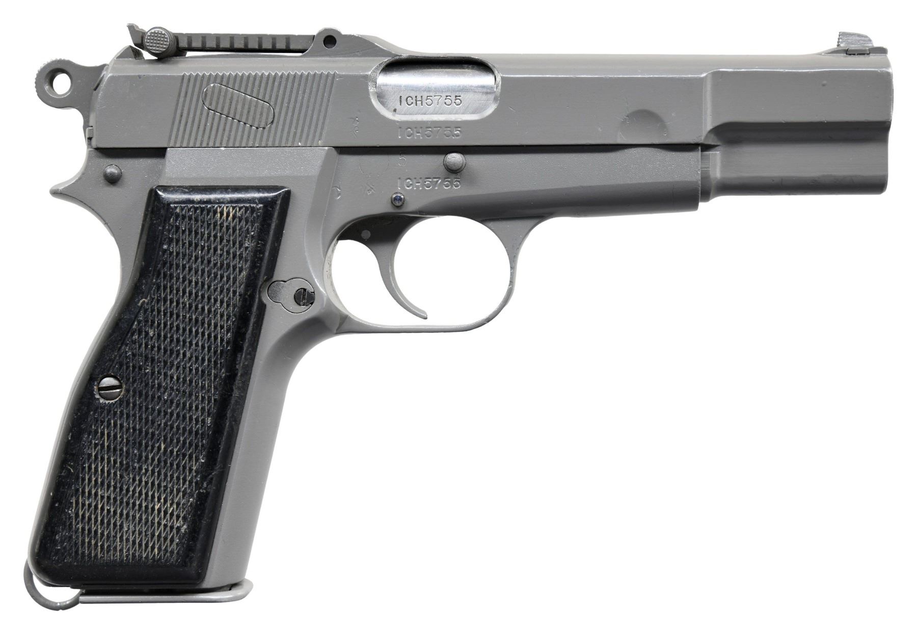 POWER SEMI-AUTOMATIC PISTOL. Cal. 9mm Luger. S# 1CH5755. Bbl. 4 5/8". 1 of approx. 1,578 Inglis MK.I* High Power pistols supplied to Belgium by Canada under the Defence Appropriation Act of 1950 for the Belgian army. This unusual variation is detailed on page 227 of "Inglis Diamond", by Clive M. Claw. Claw indicates that the Canadian army utilized this opportunity to offload a number of non-standard MK.I* pistols to Belgium, with many appearing to be originally from the Chinese contract. At the arsenal, these pistols received their distinctive Belgian gray Teflon finish, were subsequently withdrawn from military service, and were then issued to the Belgian Gendarmerie. The left side of the slide is marked "MK.I*" above "BROWNING-F.N.9MM HP" and "INGLIS CANADA". Right side of the frame, slide, and bbl. exhibit Canadian proofing, with the frame also exhibiting an added "5" above the S# (meaning unknown). Metal components exhibit a gray Teflon finish overall, save for on the bbl., which is polished in-the-white. Slotted frame is fitted with 2-piece checkered black synthetic grips, and features a lanyard stud and ring on the left. Thumbprint slide features a dovetailed blade front sight, with a tangent V-notch rear sight, graduated 50-500. All serialized parts are matching via the "stacked" fashion, and include the frame, slide, and bbl. MAGS: 1 gray teflon finished 13-rd. mag. with split tail floorplate. Mag. is marked with both "JI" and the S# on the body and floorplate. UNATTACHED ACCESSORIES: notes from Charles Wagner detailing this variation. CONDITION: extremely fine, with metal components retaining bountiful amounts of their Belgian Teflon finish, exhibiting some superficial handling marks overall. Mirror bore, exhibiting a few spots of what appears to be extremely light surface level pitting, while retaining well defined rifling throughout. Grips show light to mild smoothing, as well as some superficial marks from handling and storage, but otherwise remain sturdy and serviceable. An extremely rare and unusual MK.I* High Power variation, sent from Canada to the High Power's country of origin. PROVENANCE: The Estate Collection of Charles Wagner. (25-434/MLW). CURIO. $1,750-2,250.