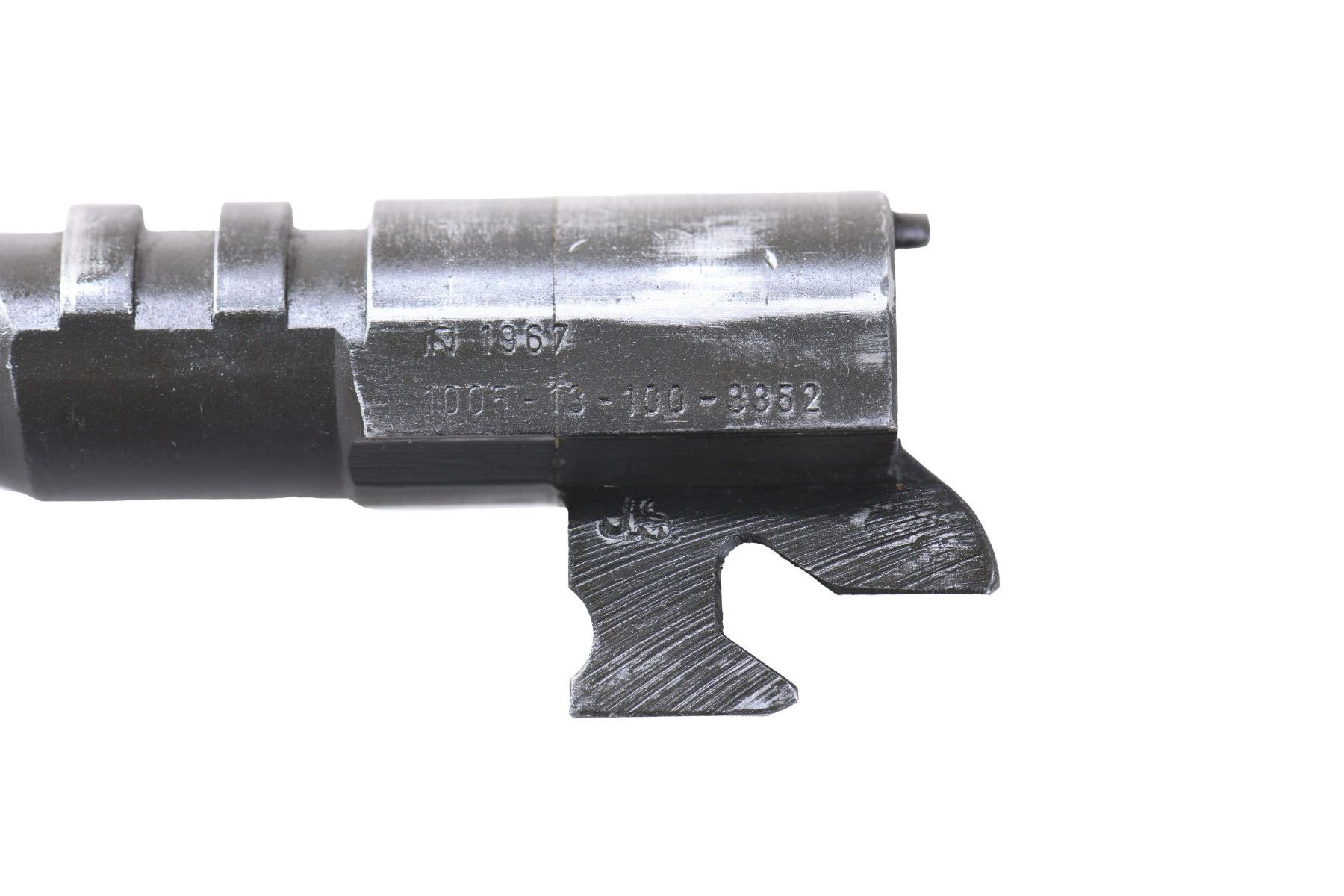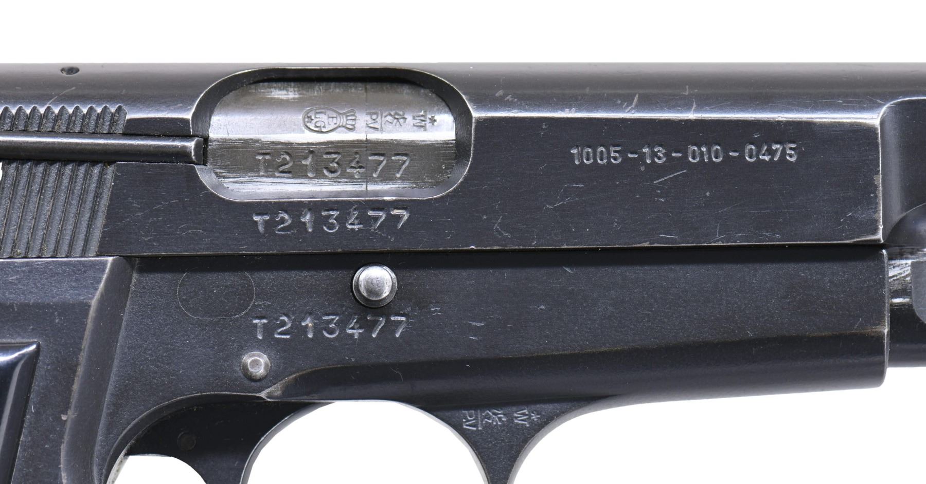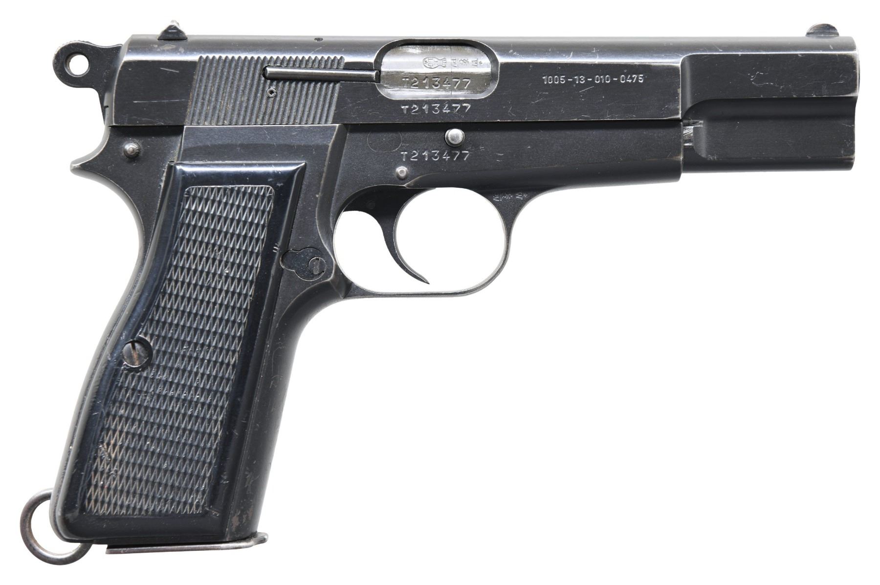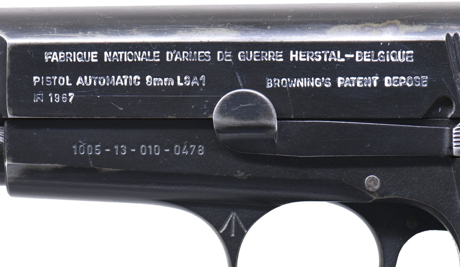 FABRIQUE NATIONALE "L9A1" HIGH POWER SEMI-AUTOMATIC PISTOL. Cal. 9mm Luger. S# T213477. Bbl. 4 5/8". L9A1 High Power semi-automatic pistol mfg. by Fabrique Nationale under contract for Britain in 1967. The left side of the slide is marked "FABRIQUE NATIONALE D'ARMES DE GUERRE HERSTAL - BELGIQUE" above "PISTOL AUTOMATIC 9mm L9A1", "BROWNING'S PATENT DEPOSE", as well the intertwined "FN" monogram, followed by "1967". Right side of the slide is marked with the NATO stock # "1005-13-010-0475". Left side of the frame is marked with "1005-13-010-0478", with a broad arrow proof marked on the left side of the forward trigger guard web. Right side of the forward trigger guard web and 2-piece bbl. exhibit Belgian commercial proofs. Left side of the bbl. is marked with the intertwined "FN" monogram, followed by "1967", above "1005-13-100-3352". Metal components exhibit a black enamel type finish (applied over a phosphate finish) overall, save for on the bbl., which exhibits a phosphate finish. Frame is mounted with 2-piece checkered black synthetic grips, and features a lanyard stud and ring on the left side. Slide features an external extractor, with a fixed half-moon blade front sight, and dovetailed U-notch rear sight. All serialized parts are matching via FN's factory S# in the "stacked" fashion, and include the frame, slide, and bbl. MAGS: 1 black enamel finish 13-rd. mag. with button type floorplate, marked "1005-13-010-0319" above the intertwined "FN" monogram and "1967". UNATTACHED ACCESSORIES: notes from Charles Wagner detailing this example. CONDITION: metal components retain the majority of their arsenal black enamel finish, exhibiting some areas of light to mild wear and thinning (primarily on and alongside edges), with scattered superficial handling marks and small spots of flaking present overall. Near mirror bore, exhibiting some light to mild pitting, while retaining well defined rifling throughout. Grips show superficial marks from handling and storage, as well as a few impressions and small gouges, but otherwise remain sturdy and serviceable. A highly desirable example of a British contract L9A1 High Power pistol. PROVENANCE: The Estate Collection of Charles Wagner. (25-435/MLW). CURIO. $2,000-3,000.