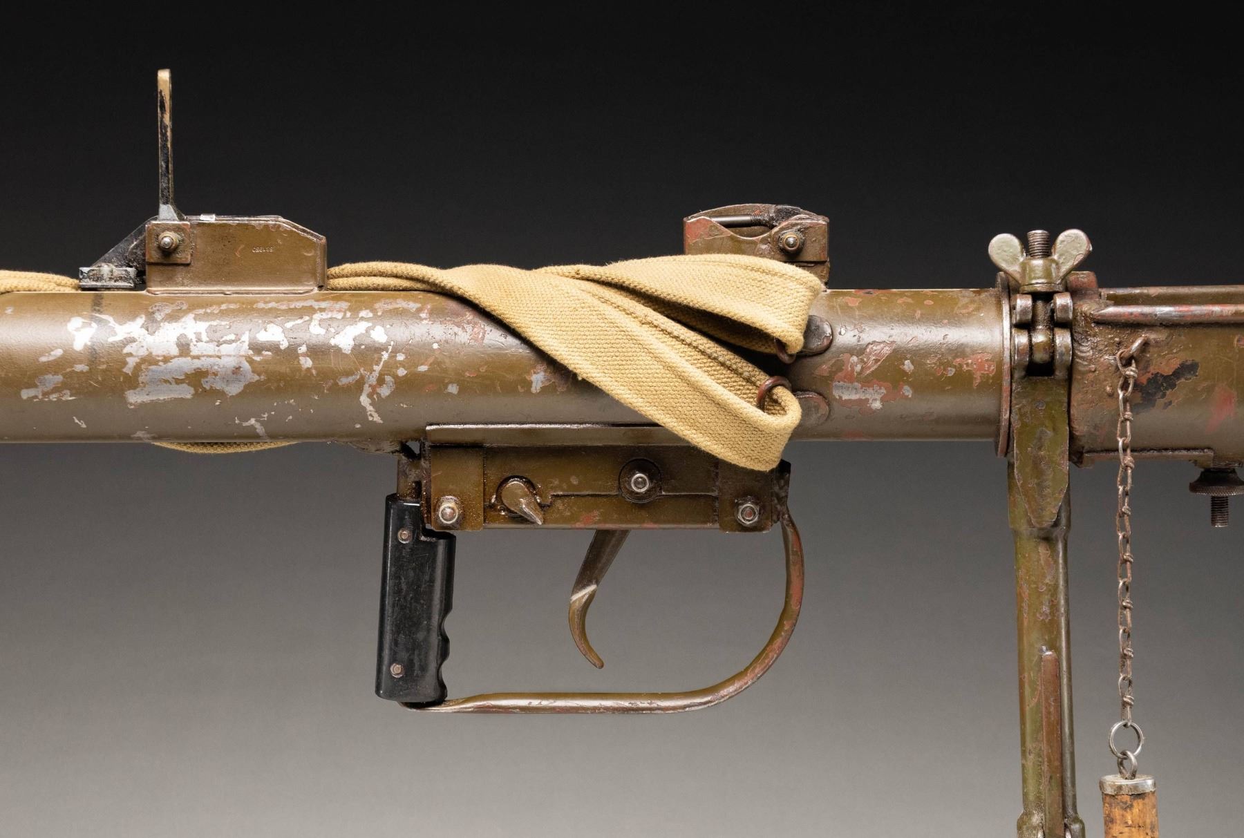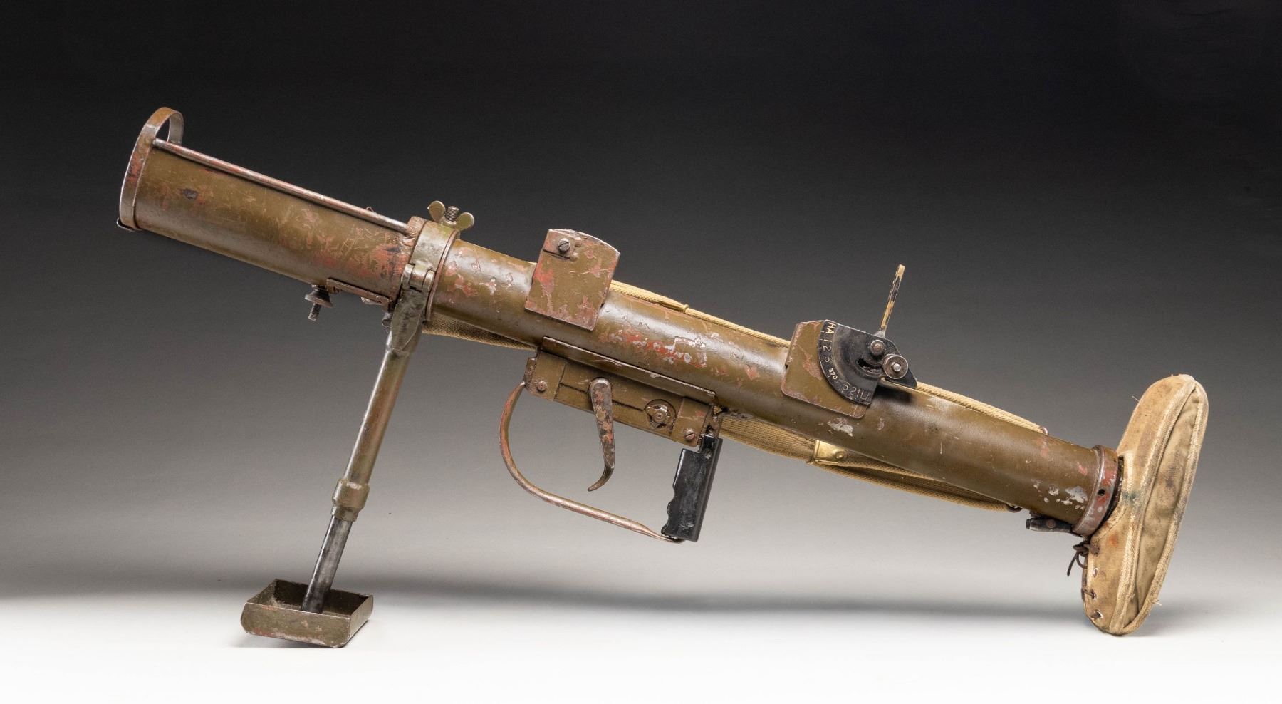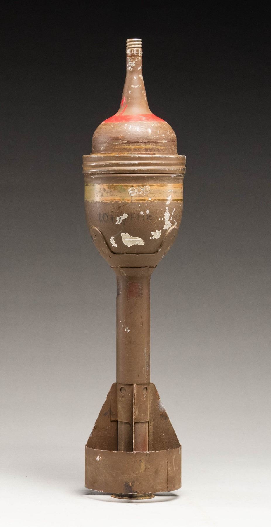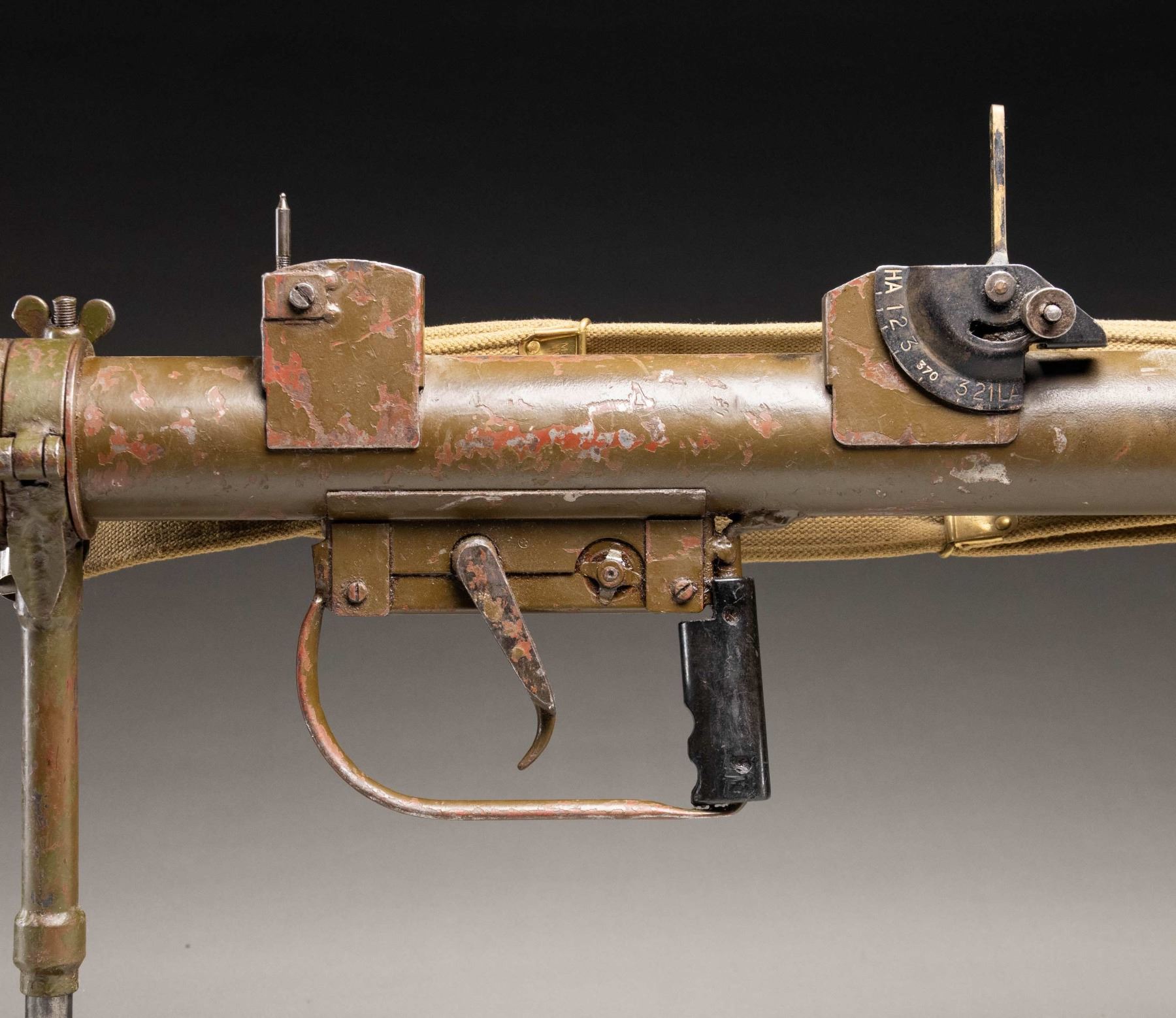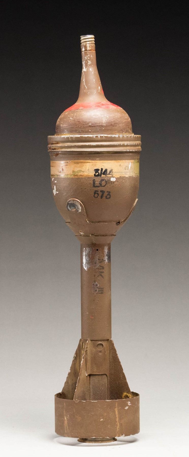 INERT PROJECTILE. PIAT (Projector, Infantry, Anti-Tank) anti-tank projector mfg. in Britain during WWII. Based off of the spigot mortar system, the PIAT was designed in 1942, entered service in early 1943, and saw use into the early 1950s, with a number of PIATs also being utilized by the Soviet Union (under the Lend-Lease program) as well as resistance groups throughout the remainder of the war. While the PIAT system had some advantages over contemporary anti-tank weaponry of the time, including its simple mfg., the lack of a back blast when firing, multi-role capability as a direct and indirect fire projector, and usage of HEAT (High Explosive Anti-Tank) munitions, its weight, strong recoil, and cumbersome method of cocking, ultimately led to further developments in infantry AT weaponry and its relatively limited use outside of WWII. This example is marked "IC / B28062" followed by a British proof on the top of the projectile support assembly. Metal components exhibit a green painted finish, with a single white painted line present across the top of the receiver tube. Plain rnd. brown synthetic grip. Flip-up post front sight and flip-up brass rear sight, with 3 apertures graduated at "50", "80", and "110". This example is complete with its cork guide tube stopper (on steel chain), monopod, "M.E. Co." marked khaki canvas web sling, as well as a leather laced khaki canvas shoulder pad cover. UNATTACHED ACCESSORIES: x1 83mm 1944 dated inert projectile. Projectile exhibits a green painted exterior and is marked "3/44" above "LOT/ 573" on the side of the body, with "MK III" on the tail tube. Projectile head is painted with a red band along the cone, with an apparent white or light brown band painted around the body. CONDITION: metal components retain large amounts of their green painted exterior, exhibiting superficial scratches and handling marks, as well as scattered spots and areas of flaking showing through to silvering and some spots of oxidation. Brass rear sight exhibits areas of flaking to its black enamel type finish. Trigger and safety lever actuate properly. Sling is very good to excellent overall. Shoulder pad shows general overall wear, with scattered spots of discoloration. Projectile retains the majority of its green painted finish, showing some light handling marks, with scattered spots and patches of flaking. The PIAT is not subject to the provisions of National Firearms Act, and is listed under section III of the BATFE's Curio & Relics list (2025 edition, page 22) as being removed from the provisions of the NFA. This is an excellent and desirable example of a British WWII PIAT projector that would make for a fantastic display piece. (25-5296/MLW). CURIO. $1,500-2,250.