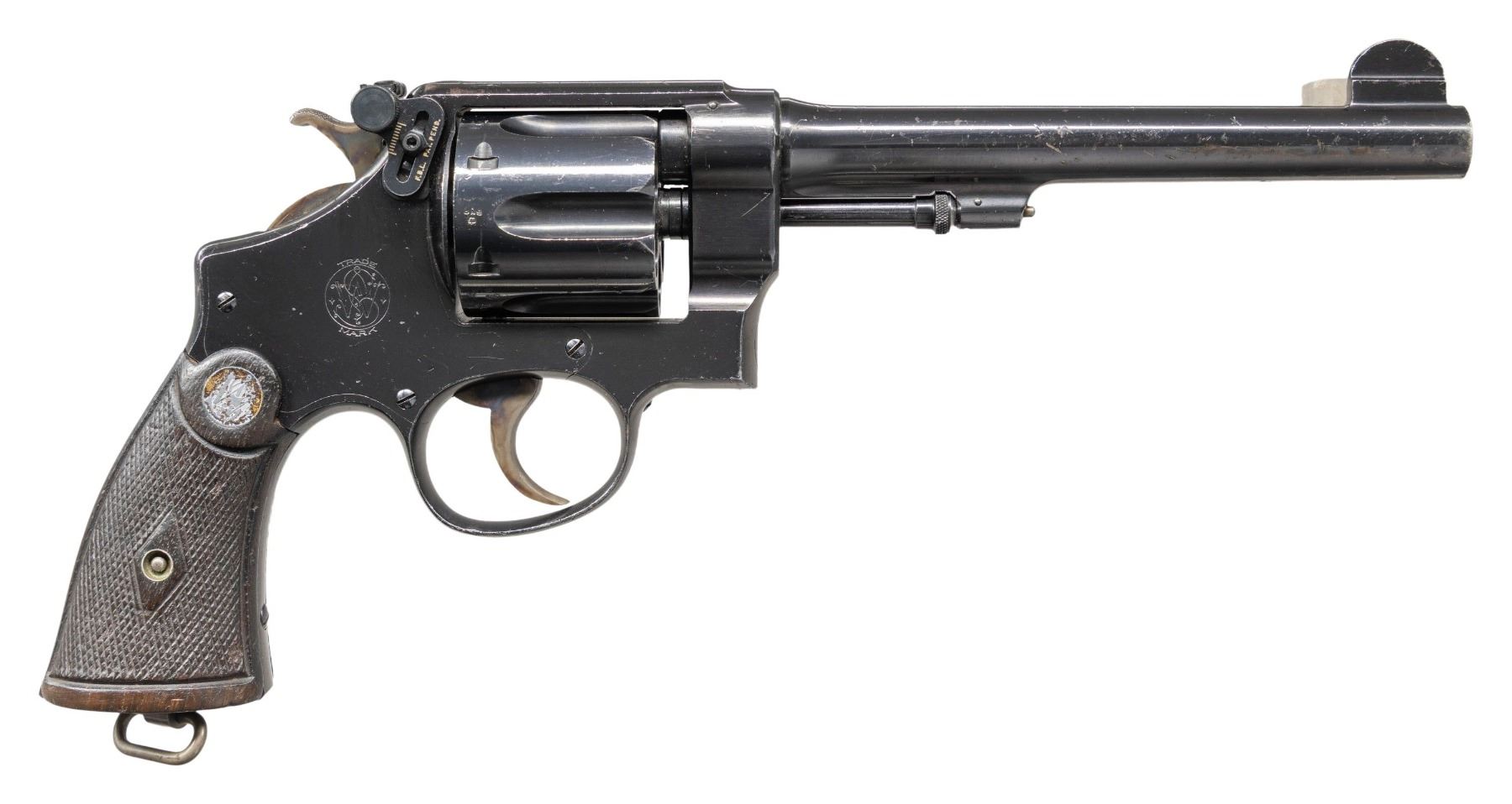 2ND MODEL DA REVOLVER. Cal. 455 Eley. S# 44355. Mfg. during WWI 1915-1917; approx. 14,500 mfg. for Canadian service. Matching 6.5" barrel has round blade front sight. Square butt, 5 screw frame with matching numbered 6 shot cyl. & extractor. Right side has added Evans Wondersight. left side of frame has Canadian crossed penants proofs, deaccession broad arrows proof, "arrow / 1 / 44 / E / II" proof; barrel has Birmingham Nitro proofs. Blued finish. Matching numbered 2 piece checkered walnut grips with S&W medallions. UNATTACHED ACCESSORIES: Evans manual, allen wrench & plate. CONDITION: good blue finish with numerous scratches & marks along with streaks of fading finish to brown patina on sides of barrel. Fair worn grips with crack on back side of left panel. Good rifling with dark spots & light pitting. PROVENANCE: From the Buckstix Collection. (25-6332/MD). CURIO. $800-1,200.