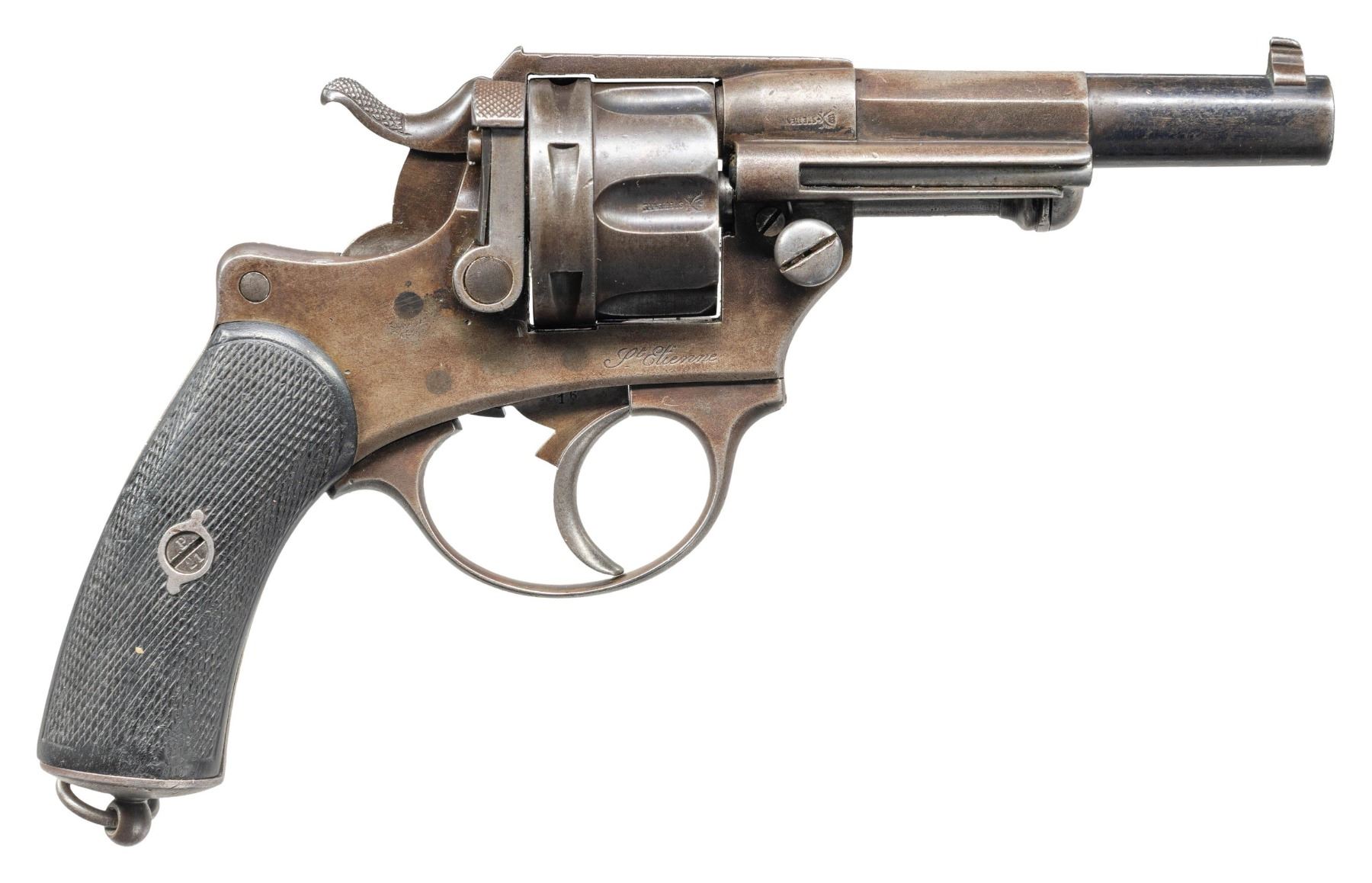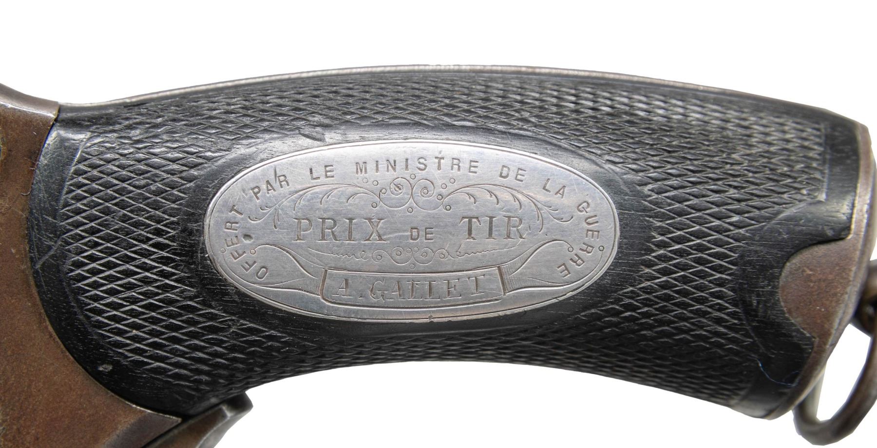 SHOOTING AWARD PRESENTATION PLAQUE. Cal. 11mm. S# 16. Bbl. 4 3/8". Mle 1874 double action revolver mfg. by St. Etienne. Right side of the frame is marked "St. Etienne" below the cyl., with an upside down "S Etienne", followed by the coat of Arms of the City of Saint-Etienne marked at the breech (also marked between 1 of the cyl. flutes). Front face of cyl. is stamped with an apparent "LA MURE GIDROL" and with an "LG" proof (rpeated on interior of frame) indicating mfg. by Lamure et Gidrol for Manufacture D'Armes de St. Etienne (later known as Manufrance). Metal components exhibit a blue finish. Frame is mounted with 2-piece checkered hard rubber grips, featuring a lanyard swivel and ring on the butt. Left grip panel is inlaid with a plaque indicating presentation to "A. GALLET", which reads "OFFERT PAR LE MINISTRE DE LA GUERRE/ PRIX DE TIR" (PRESENTED BY THE MINISTER OF WARFARE/ SHOOTING PRIZE" above "A. GALLET" within a banner. Dovetailed blade front sight with integral frame V-notch rear sight. Interior of frame retains its simple, but ingenious mainspring tension lever. Apparent S# or assembly # "16" is marked on the frame (interior), frame sideplate screw, mainspring tension lever, trigger, cyl., cyl. base pin, ejector rod head, as well as on the interior of the grip panels. CONDITION: metal components retain traces of their original blue finish in protected areas, with the balance having faded to a mottled gray patina and exhibiting scattered spots/areas of light of mild pitting and surface oxidation overall. Bright bore, exhibiting consistent light pitting, while retaining strong rifling throughout. Proper manual mechanics. Grips show smoothing, as well as scattered superficial marks and impressions from handling and storage, but otherwise remain sound. PROVENANCE: From the Buckstix Collection. (01-28597/MLW). ANTIQUE. $2,500-3,500.
