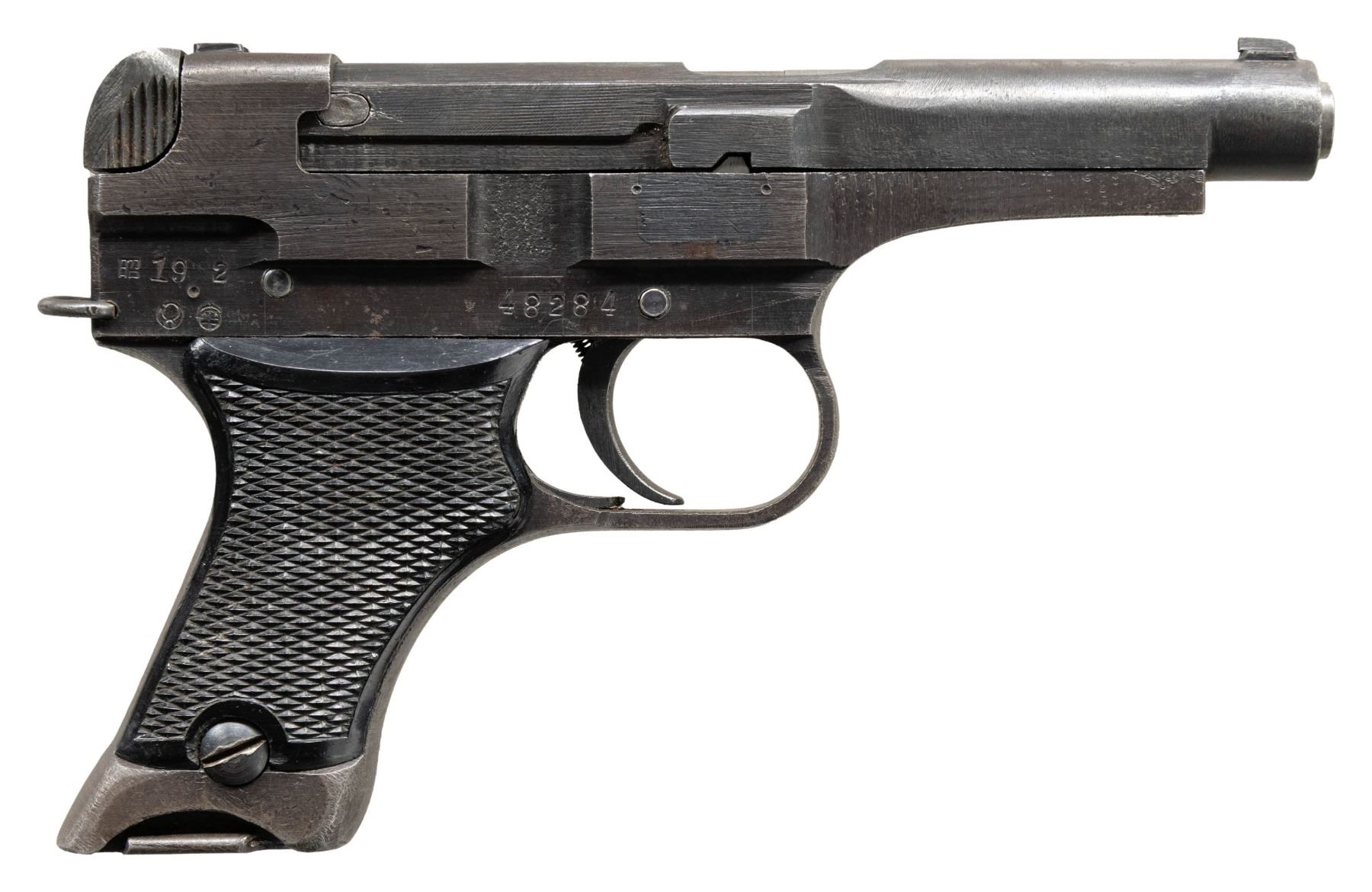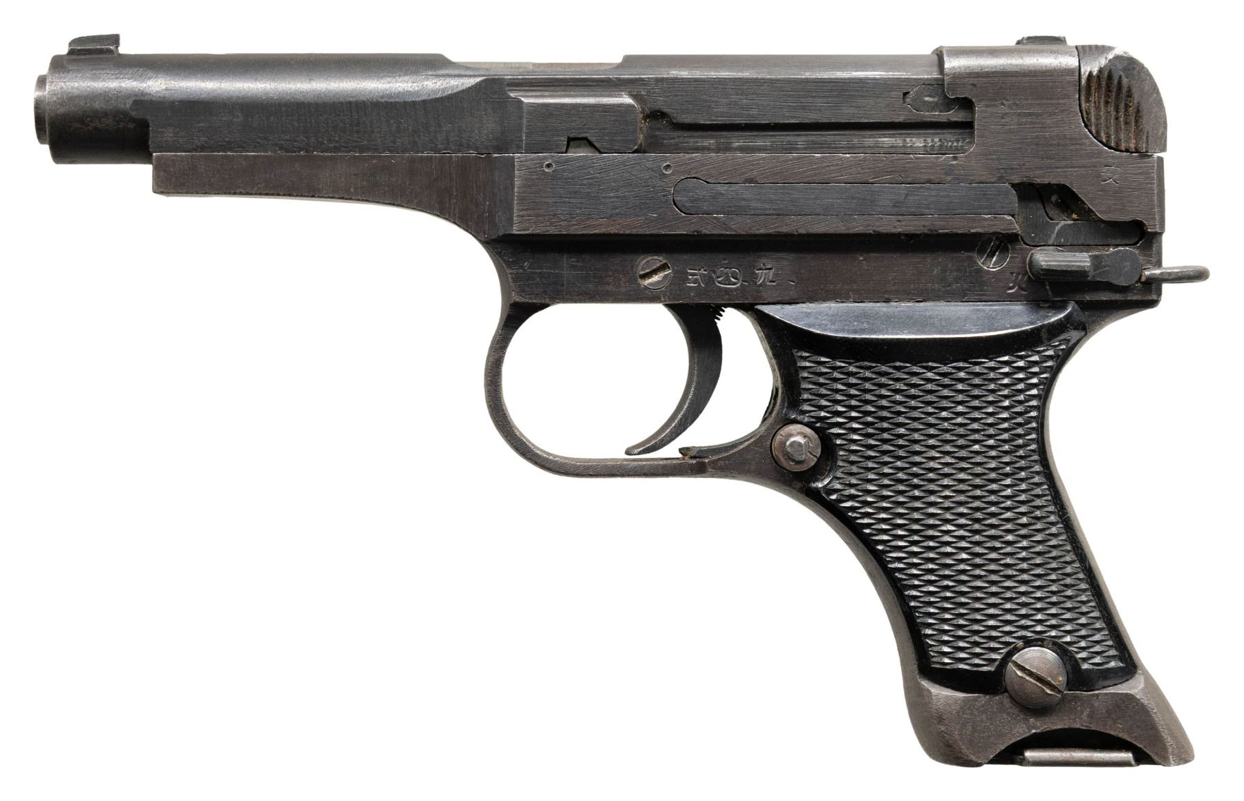 SEMI-AUTOMATIC PISTOL. Cal. 8mm Nambu. S# 48284. Bbl. 3 3/4". Type 94 Nambu semi-automatic pistol mfg. by Chuo Kogyo in 1944. Left side of the frame exhibits Kanji characters denoting the model designation, with the Showa date of mfg. "19.2" (February of 1944), Chuo Kogyo arsenal insignia, and S# marked on the right. Metal components exhibit a salt blue finish overall, save for on the bbl., locking block, firing pin, and recoil spring collar, which are polished in-the-white. Frame is mounted with 2-piece checkered black synthetic grips. Dovetailed blade front sight with integral square notch rear sight on frame. All serialized parts are matching and include the frame, slide, bbl., locking block, and breech bolt. MAGS: 1 blued matching 8-rd. CONDITION: metal components retain the majority of their original arsenal salt blue finish, showing some areas of mild wear and thinning, with scattered spots of light to mild surface oxidation. Grip straps exhibit areas of wear that are fading to gray patina. Very bright bore, exhibiting some mild pitting around the muzzle area, while retaining strong rifling throughout. Proper manual mechanics. Grips show some smoothing, as well as some superficial marks from handling and storage, but otherwise remain sound. (25-4553/MLW). CURIO. $600-800.