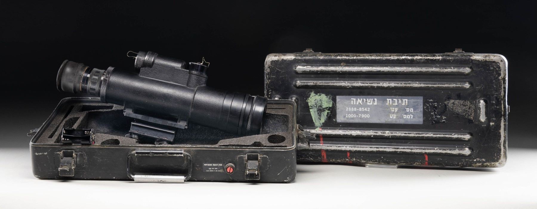 17" overall length with eyepiece and 8" tall including side scope mount that is compatible with M-16 and M-14 mounting system. This mount is quick detach and has integral windage and elevation adjustments. Light amplifying night vision scope with black painted finish overall and void of all markings and builders plates other than those added by Israel; shows only the numerical markings on the adjustable focus, and the reticle markings in Hebrew. Comes with airtight sealed case and AA battery adapter. Scope follows the basic design of the famed AN/PVS-2 "Starlight Scope" used successfully by American personnel during the Vietnam War and beyond. CONDITION: appears complete but fresh batteries did not illuminate the reticle. PVS-2 is very popular on the surplus market and it is very likely that it could be restored by a service provider Radiumbruce) listed on Etsy which would greatly enhance its value. One broken latch on case. (02-24594/NW). NON-GUN. $200-400.
