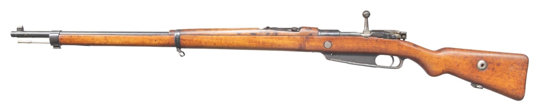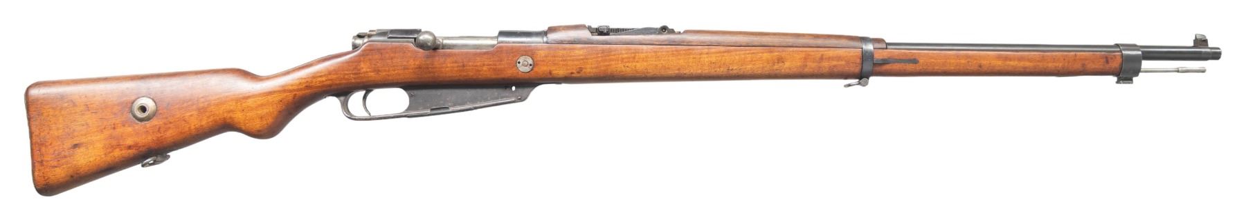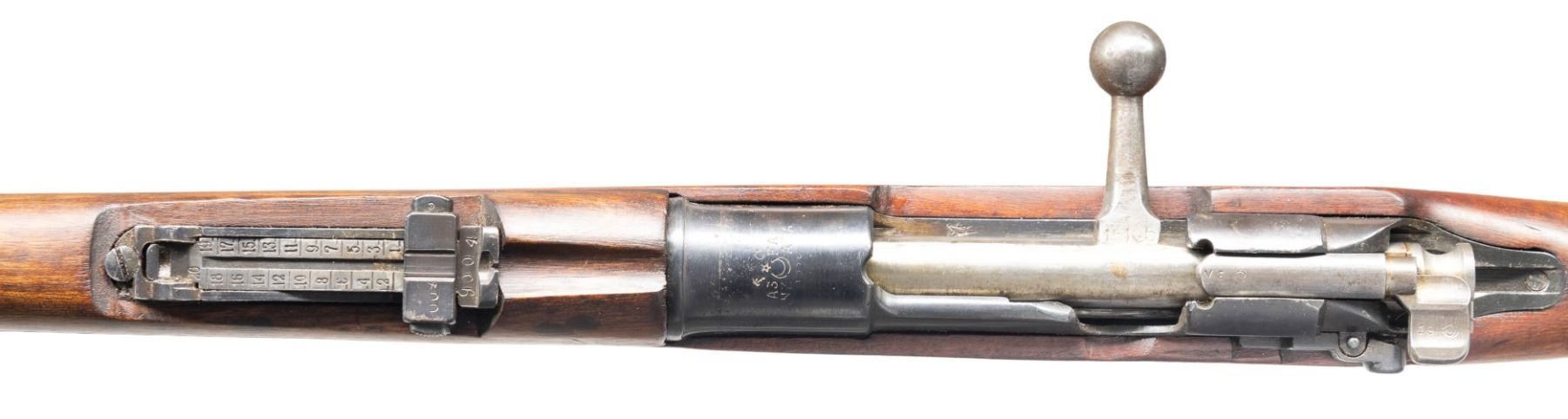 Cal. 8x57. S# 9004. Bbl. 29". Blade front sight. Tangent rear sight graduated to 2000m. Matching numbers on receiver & rear sight parts. Other parts mismatched or unnumbered. Interwar updated Turkish Gew 88 rifle. Receiver ring has faint Ankara marking with illegible date. Reblued finish. Pistol grip hardwood stock with bottom mounted sling swivels. Cleaning rod present. CONDITION: stock appears lightly sanded with some black staining, a couple light chips, some dings & handling marks. Metal retains 95% reblue with some blued over pitting, light oxidation, handling marks & edge wear. Action functions properly when hand cycled. Good bright bore with some light pitting & frosting but strong rifling. PROVENANCE: From the Buckstix Collection. (01-28712/MJC). ANTIQUE. $450-650.