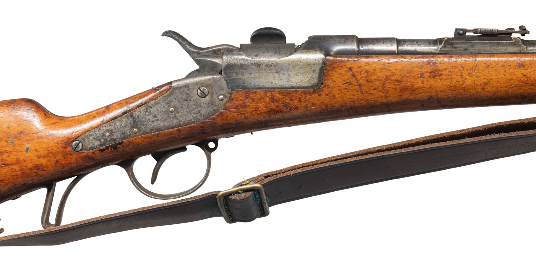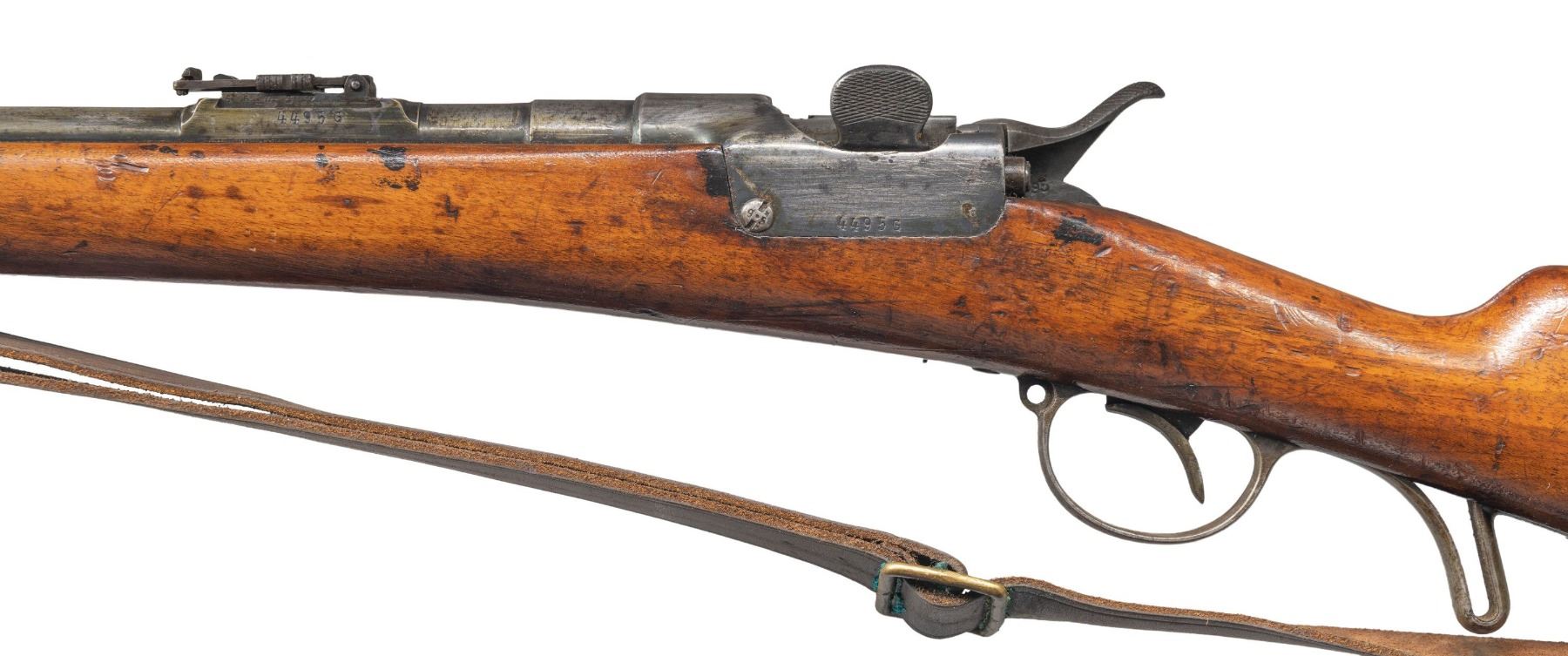 Cal. 11mm Werndl. S# 4495G. Bbl. 22 1/2". Blade front sight. Ladder rear sight graduated to 600 Schritt. Matching numbers on left side of action, hammer, breechblock & left side of rear sight base. Right side of lock has 1882 date. Bbl. rear has "Wn 84" acceptance stmap. Top of bbl. has "OEWG" Steyr stamp. Hardwood stock set with bottom mounted sling swivels & leather sling that appears more modern. Buttplate tang has unit marking that reads "6.C.A.R./68". Ramrod present that is matching numbered to rifle on tip. UNATTACHED ACCESSORIES: 1867 Extra Korps Socket bayonet that is numbered matching to gun with matching numbered leather scabbard. Bayonet appears to have been cleaned long ago with scattered oxidation & pitting. Scabbard shows scattered flaking, crazing & age related wear. CONDITION: stock has added finish with a thin small crack ahead of lock, scattered flaking, dings, handling marks & scratches. Metal has a cleaned gray appearance with scattered oxidation, scratches, light pitting, edge wear & some varnish overrun. Action functions properly when hand cycled. Bore shows a few notable patches of pitting but strong rifling. PROVENANCE: From the Buckstix Collection. (01-28654/MJC). ANTIQUE. $1,200-1,800.