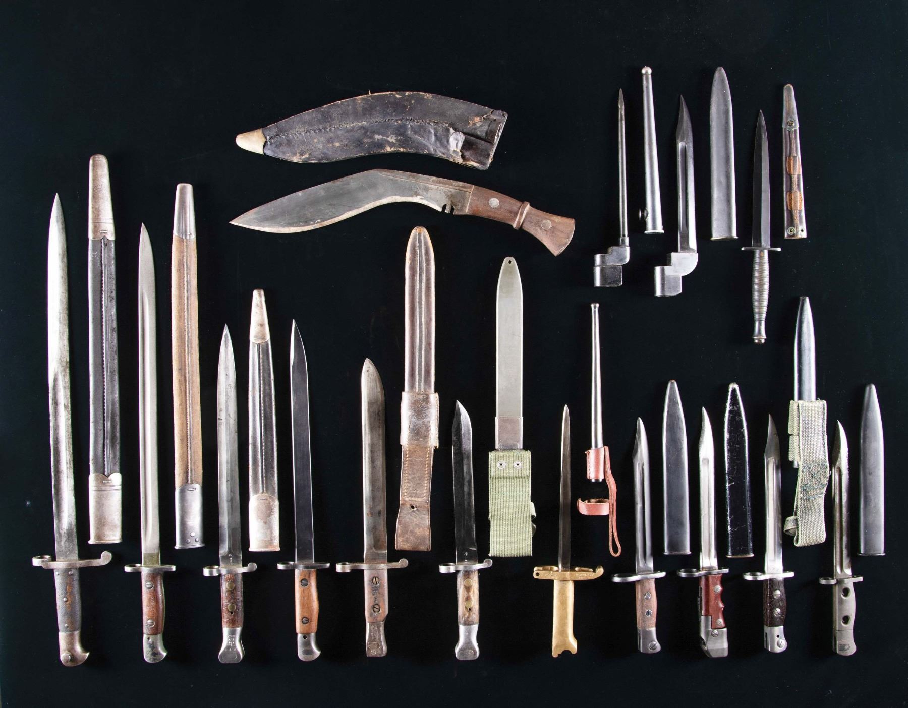 EMPIRE RELATED KNIVES AND BAYONETS. 1). British Fairbairn Commando Knife. 6 7/8" blued double-edged blade. 11 3/4" overall. Knife is marked "ENGLAND" on the handle side of the crossguard & has "broad arrow / 7" on front of the rib. Blackened brass handle. Brown leather sheath w/ blackened brass tip. Leather tabs on sheath have been trimmed close. CONDITION: blade has lightly worn original finish & has been very lightly sharpened. Brass handle has moderate wear, turned a pleasing patina. Scabbard has light wear & flexing. Stitching remains tight. Brass tip has notable thinning of its blackened finish. 2). Kukri. 11 3/4" bright blade w/ the iconic downswept edge. Blade is marked on right side w/ "arrow / INDIA". The blade also features the characteristic double notch. Grips appear to be teak, secured by two rivets. Black leather scabbard w/ brass tip. Scabbard has provision for two ceremonial knives which are not present. CONDITION: blade has been sharpened, has moderate wear w/ areas of light oxidation & patina throughout. Handle has wear & handling marks over its sanded hand-fitted finish. Scabbard has areas of missing material, loose stitching & notable scuffing throughout. 3). Replica WWI British Prichard Revolver Bayonet for the Webley Pistol. "T" profile 8" blade. 12 1/2" overall. Originals were made from French Gras bayonets. Blade is unmarked. Crossguard is marked on right side w/ Greener elephant logo. Additionally marked "ALENT" & "NO17143/16". Latch is present & functional. Steel scabbard w/ leather frog, both unmarked. CONDITION: blade has traces of blue finish w/ thinning & wear. Brass handle has beginnings of patina w/ numerous small dents, scratches & handling marks. Scabbard & frog appear unissued in very good condition. 4). Pattern 1887 MkIV Martini Henry Bayonet. 18 1/4" bright fullered blade. 23 5/8" overall. Blade has worn markings. Visible on left ricasso "/86 / C91". Right ricasso has view marks as the opposed arrow sold out of service mark. Crossguard w/ muzzle ring. Leather grips secured by four rivets. Pommel carries serial number. Black leather scabbard w/ metal tip & throat. CONDITION: bayonet has been lightly sharpened. Metal turning gray & patina w/ small areas of oxidation & fine pitting. Grips are well-worn w/ scuffed appearance. Scabbard fittings have turned overall gray & patina. Leather has wear & scuffing, but stitching remains tight. 5). Pattern 1888 MkI Lee-Metford Bayonet. 12" bright double-edged blade. 16 3/4" overall. Blade is marked on left ricasso "crown / VR / 8 95 / ANDERSON SHEFFIELD". Right ricasso has "broad arrow" & "WD". View marks & sold out of service marking. Pommel is marked on the right side "181 / I.Y D.L.O". Smooth walnut grips secured by two brass rivets. Grips also have faint view marks. Black leather scabbard w/ metal throat & tip. CONDITION: metal, including blade, has been polished. Returning to gray w/ spots of peppery oxidation. Grips are worn w/ added finish. Scabbard has wear & scuffing. Metal turning gray & patina. 6). Pattern 1888 Modified to Trench Knife. 8" blade has been ground to a Bowie tip. 12 3/4" overall. Left ricasso markings include "crown / VF / 8 91". Right ricasso has sold out of service marking. Both sides contain numerous view marks. Smooth walnut grips retained by two brass rivets. Modern replacement green plastic scabbard w/ web frog. CONDITION: knife has been cleaned over moderate wear, oxidation & pitting, returning to gray & patina. Blade has been sharpened. Grips have wear & chipping issues, showing loss of wood in inletted areas. Scabbard has damage at tip by lanyard hole, but is otherwise serviceable. 7). Pattern 1907 MkI SMLE Bayonet. 17" fullered blade. 21 3/4" overall. Blade is dated "1907". Contains view marks & sold out of service mark. Straight crossguard w/ muzzle ring. Smooth walnut grips secured by two screws. Right grip is marked "AUSTRALIA". Leather scabbard w/ metal throat & tip. CONDITION: blade has a gray sand-blasted appearance. Balance of metal, including marking area, has thinning worn green paint. Grips are worn & have small cracks. Scabbard has had black finish removed, leaving a worn scuffed appearance. Metal tips have turned overall gray & patina. 8). U.S. Marked Ross Rifle Bayonet. 10" bright blade. Crossguard w/ muzzle ring. Smooth walnut grips have "U.S. / flaming bomb" on right grip. Grips retained by two screws. Right side of pommel is marked "ROSS RIFLE CO. / QUEBEC / PATENTED 1907". Left side of pommel has encircled "arrow / 11-09 / 08". Leather scabbard w/ metal throat & tip. Scabbard is marked on front w/ "flaming bomb / U.S.". CONDITION: blade turning overall gray & patina w/ light oxidation. Blade has been sharpened w/ numerous grinding marks. Balance of metal is worn w/ gray & patina. Grips have wear & staining. Scabbard has wear & scuffing. Stitching remains tight. 9). India Pattern No.1 Mk2 Bayonet. 12" blade w/ 2" false edge. 16 3/4" overall. Blade is marked on left ricasso "MKII / 7 43 / UU". Right ricasso has view marks. Smooth walnut grips retained by two screws. Scabbard is not present. CONDITION: metal has added cold blue finish w/ wear & oxidation. Grips show light wear & staining. 10). Number 5 MkII Jungle Carbine. 8" fullered blade. 12" overall. Left ricasso marked "S / 2 94 / W.S.C.". Right ricasso has sold out of service mark. Crossguard w/ large muzzle ring. Smooth walnut grips retained by two screws. Blued steel scabbard w/ green web frog. CONDITION: bright metal has light wear & peppery oxidation. Grips have light wear & handling marks. Scabbard has been given an arsenal rework finish. 11). Number 5 MkII Bayonet. 7 3/4" fullered blade. 11 5/8" overall. Bayonet w/ its arsenal rework black finish appears unmarked. Replacement grips have light wear w/ some sanding marks. Blackened steel scabbard w/ brass throat. CONDITION: bayonet has moderate wear & handling marks. Scabbard retains most of its black finish w/ several scratches. 12). Number 7 MkI Bayonet. 