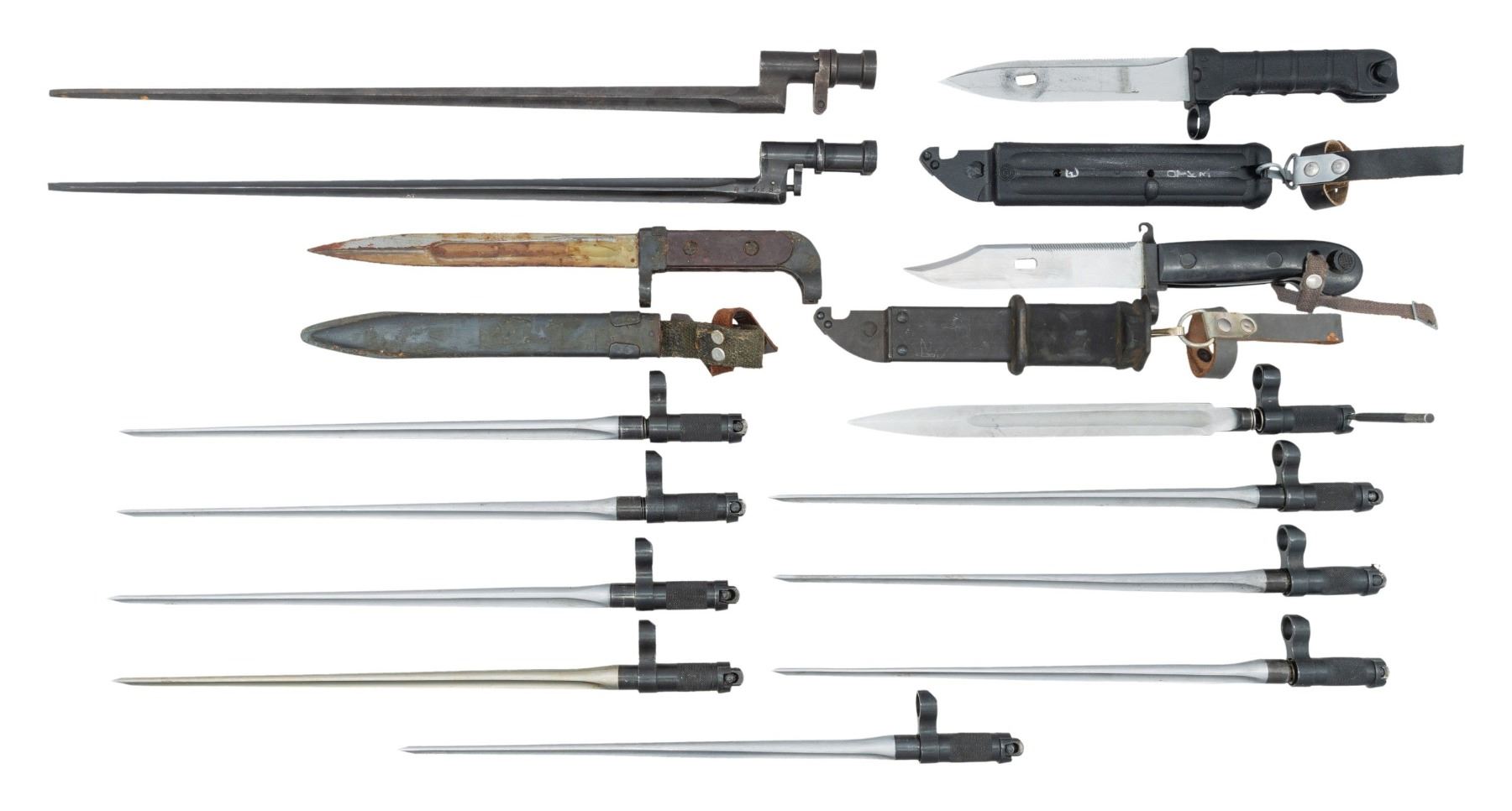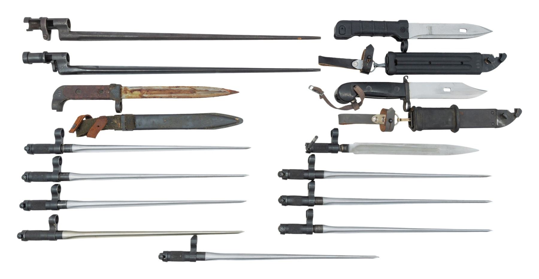 BAYONETS. Lot of assorted AK, SKS, and M91/30 Mosin Nagant bayonets, including: 1) Bulgarian AK-47 Type I blade bayonet. Blade exhibits a dull gray finish, with guard and pommel exhibiting a blue finish. Left side of pommel is marked "1174". 2-piece mottled brown synthetic grip scales. Complete with blued steel scabbard (with drain hole at tip) and green canvas web & leather belt hanger. CONDITION: bayonet exhibits a thick layer of dried grease overall, appearing to retain the vast majority of its original factory finishes. Grips appear very good overall. Scabbard is very good. 2) East German AKM Type I bayonet. Left side of blade is lightly marked "MFG. GERMANY". Blade is polished in-the-white. 2-piece black synthetic grip. Complete with steel scabbard with black rubber insulator and integral wire cutter. CONDITION: very good, with some scattered superficial handling marks overall. Scabbard is very good, with some superficial handling marks. 3) Bulgarian 6X5 pattern AK-74 bayonet. Left side of grip is marked with a Bulgarian Arsenal encircled "10" insignia, with "2108" marked on the right. Blade exhibits a matte gray finish. 1-piece textured black synthetic handle. Complete with black synthetic scabbard with integral wire cutter. CONDITION: blade is good, showing scattered spots of discoloration. Grip and scabbard are very good overall. 4) x8 SKS spike pattern bayonets. Blades exhibit a gray finish with blued steel mounting hardware. CONDITION: bayonets are very good, with some scattered handling marks and light wear. 5) SKS blade type bayonet. Blade exhibits a gray finish, with mounting hardware exhibiting a blue finish. CONDITION: very good overall, with some superficial handling marks. 6) Early pattern M1891 Mosin Nagant bayonet with locking ring. Blue finish overall. CONDITION: bayonet exhibits consistent mild to moderate pitting, while retaining good amounts of bluing overall. 7) M91/30 Mosin Nagant bayonet. Blue finish overall. CONDITION: very good, with some light wear and handling marks. (02-24627-5/MLW). NON-GUN. $300-600.
