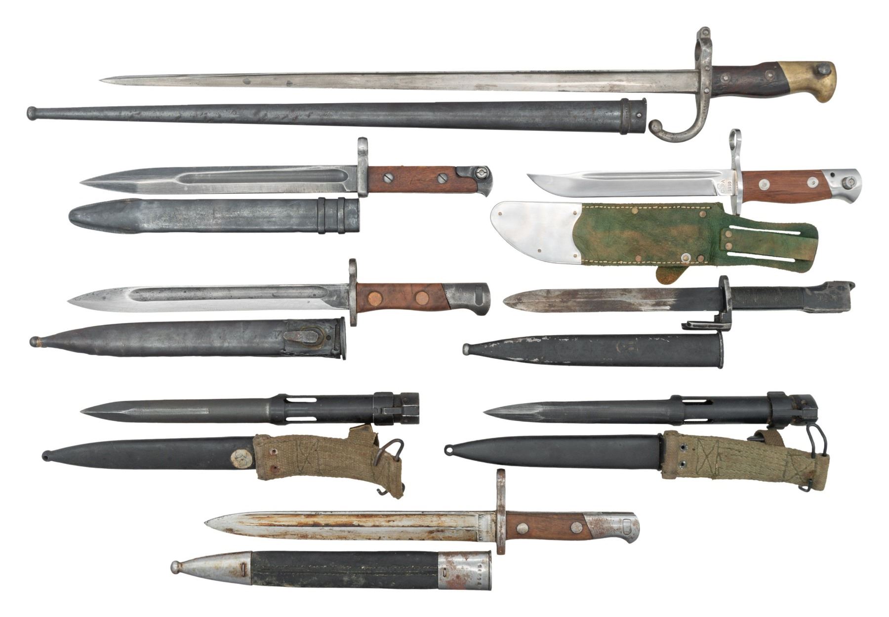 Lot consists of 8 foreign military rifle bayonets, including: 1) M1874 Gras blade bayonet mfg. by St. Etienne in 1877. Right side of ricasso is marked with 2 French inspector proofs, with St. Etienne's mfg. information and "april 1877" engraved on the spine. Left side of hooked quillon is marked with 3 French inspector proofs and the S#. 2-piece plain wood grip scales with brass pommel. Complete with non-matching blued steel scabbard. CONDITION: blade retains a mostly bright appearance, exhibiting scattered spots of age related discoloration, as well as scattered spots/patches of light to mild surface oxidation. Quillon has faded to a gray patina, with the brass pommel exhibiting a mild mellow patina. Grips show scattered handling marks, but otherwise remain sound. Scabbard is good, with superficial handling marks, scratches, small impressions, and spots of light surface oxidation. 2) Soviet Russian M1940 SVT-40 blade bayonet. Sides of ricasso are marked with Soviet proofs. Metal components exhibit a blue finish. 2-piece plain wood grip scales. Complete with blued steel scabbard. CONDITION: metal components retain fair to good amounts of blue, exhibiting areas of wear fading to gray patina. Blade edge shows a few nicks. Grips show some superficial handling marks and minor chipping. Scabbard is very good overall. 3) Reproduction Finnish M39 blade bayonet mfg. by GSA. Left side of ricasso is marked "GSA" above "1999", with "SK.Y" marked on the right. Top of crossguard is stamped with the S# "0151", with "-S-" marked on the left side. Metal components exhibit a brightly polished finish. 1-piece plain wood grip scale. Complete with green leather sheath. CONDITION: excellent, with some light superficial handling marks overall. Sheath shows mild wear and some discoloration, but otherwise remains sound. 4) Siamese/Thai Type 45 (1903) blade bayonet. Right side of ricasso and underside of pommel are marked with Thai characters. Apparent replacement 2-piece plain wood grips. Complete with blued steel scabbard, featuring crudely welded frog hanger and brass brazed ball drag. CONDITION: blade exhibits a gray patina with scattered spots of age related discoloration and light pitting, as well as sharpening marks on and around blade edge. Crossguard and pommel exhibit a dark gray patina and light pitting. Grips are very good overall. Scabbard shows scattered handling marks and light surface oxidation. 5) Spanish M1893 blade bayonet mfg. in 1902. Left side of ricasso is marked with a mostly illegible mfg. mark above "1902", with "P.R.8/ 2119" marked on the right. 2-piece plain wood grip scales. Complete with black leather scabbard with steel fittings. CONDITION: blade appears good, with areas of heavy dried grease. Crossguard and pommel exhibit spots/patches of light to mild surface oxidation. Grips are very good, with a small crack on the left panel stemming from the bottom screw/rivet. Scabbard remains malleable, with fittings being cleaned in-the-white and exhibiting dried grease. 6) Argentine FAL Type A blade bayonet. Sides of ricasso are etched with apparent names. Majority of blade is in-the-white, with remaining metal components exhibiting a black enamel type finish. Grooved 2-piece black synthetic grips. Complete with non-matching black enamel finished steel scabbard. CONDITION: blade exhibits consistent light to mild pitting and areas of age related discoloration. Metal components (including scabbard) exhibit areas of flaking through through to gray patina. Grip scales show scattered handling marks, but otherwise remain sound. 7) FAL Type C socket bayonet of unknown origin (likely Imbel of Brazil) with M1963 pattern spring catch. Bayonet exhibits a black enamel finish is marked "230718" at the rear. Complete with Brazilian black synthetic scabbard with canvas web hanger. CONDITION: metal components show areas of wear, thinning, and flaking that are fading to gray patina, with light surface oxidation overall. Scabbard shows moderate wear, but otherwise remains serviceable. 8) FN FAL Type C socket bayonet of unknown origin (likely Imbel of Brazil) with M1965 pattern spring catch. Metal components exhibit a black enamel finish. Complete with Brazilian black synthetic scabbard and canvas web hanger. CONDITION: good, with scattered superficial handling marks and spots of flaking. Scabbard exhibits mild to moderate wear, but otherwise remains serviceable. (02-24627-8/MLW). NON-GUN. $400-600.