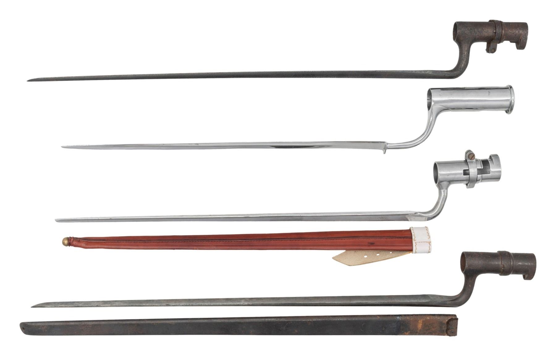 Lot of 4 assorted Socket bayonets, including: 1) U.S. socket bayonet. Top flat is marked "US". Blade measures 18 1/2" from the point to the rear of the elbow, with an overall length of 21". Complete with steel scabbard. CONDITION: bayonet exhibits a mottled gray patina and light pitting, with moderate pitting present on the socket ring. Scabbard exhibits moderate oxidation along the underside and around the rear. 2) U.S. socket bayonet. Top flat is marked with a partially discernible "US". Blade measures 18 3/8" from the point to the rear of the elbow with an overall length of 20 3/4". CONDITION: blade exhibits consistent moderate pitting overall. 3) Unmarked reproduction triangular socket bayonet. Blade measures 13 1/2" with an overall length of 18 7/8". CONDITION: bayonet retains a bright polished appearance, with some scattered spots and patches of light surface oxidation. 4) Unmarked socket bayonet. Blade measures 16 3/8" from the point to the rear of the elbow with an overall length of 18 5/8". Locking ring is a reproduction. Complete with a reproduction brown leather scabbard. CONDITION: bayonet exhibits a bright polished appearance, with consistent light pitting and spots of oxidation present overall. Scabbard remains malleable, with some scattered handling marks. (02-24627-6/MLW). NON-GUN. $200-300.