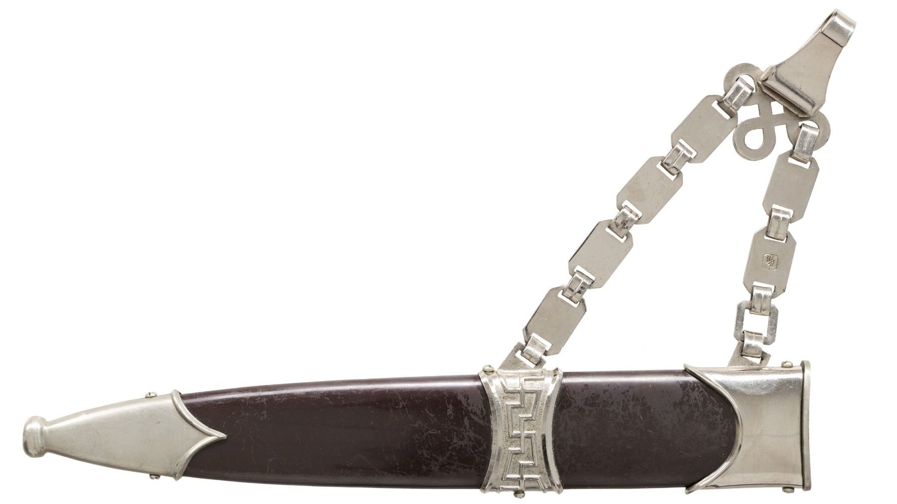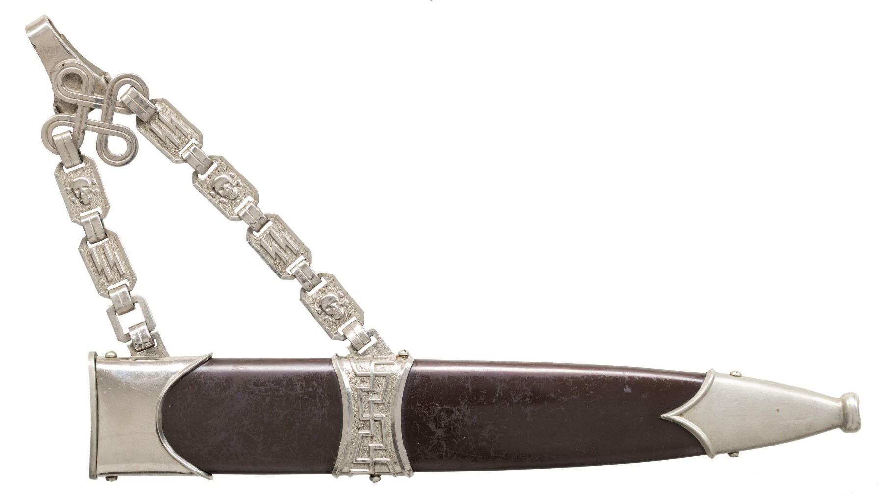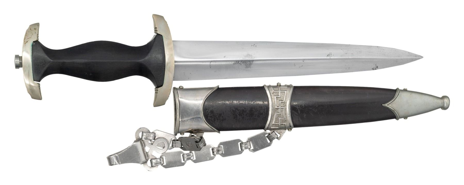 A very fine and scarce WWII German SS officer's chained dagger with an overall length: 14 3/4". Blade is etched "Meine Ehre Heisst Treue". The blade has no maker's mark, as is normally seen on the chained SS dagger. Nickel silver crossguard and pommel guard with blackened wood grip. Grip has an inset eagle and black enameled SS button near the top. Scabbard shows a black anodized finish with plated mounts. The plated chain is magnetic featuring alternate links bearing SS runes and the death's head insignia. The rune link nearest the throat has the SS runic proof inside a square with chamfered corners on the reverse. CONDITION: blade shows scabbard wear mixed with original factory finish and sporadic very light staining. Mounts retain nearly all of their original finish and the ball at the base of the scabbard has a minor dent at the extreme base. Scabbard shows light overall wear with some finish loss. (02-24998/BF). NON-GUN. $4,000-6000.