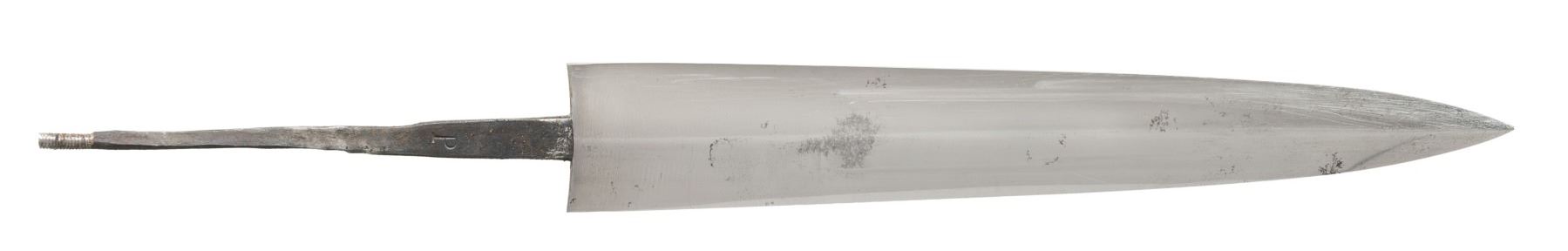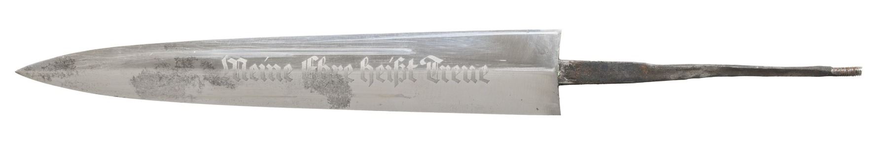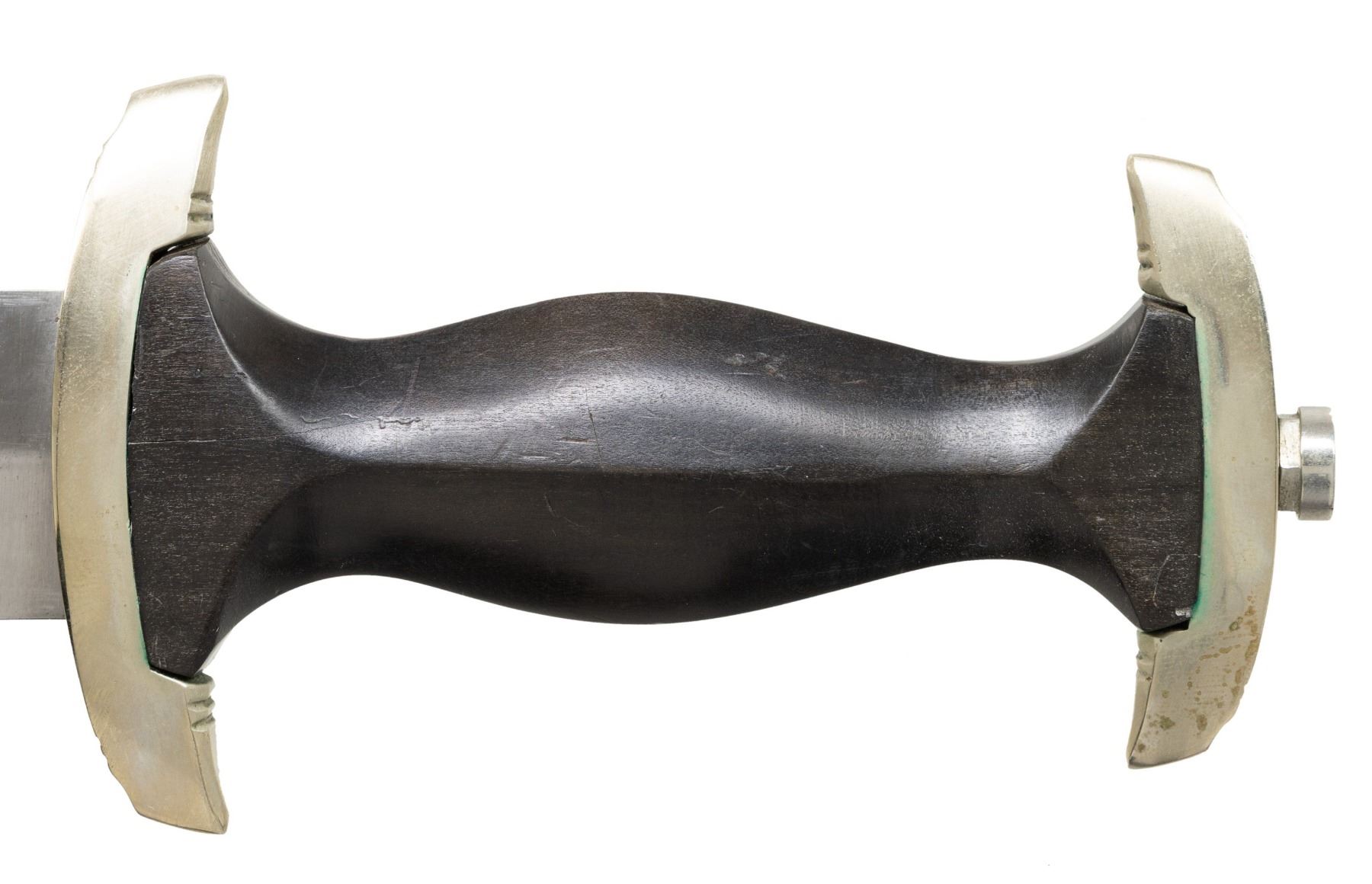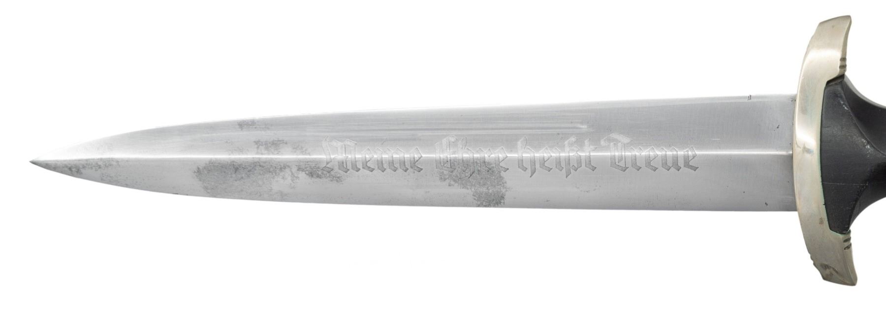 A very fine and scarce WWII German SS officer's chained dagger with an overall length: 14 3/4". Blade is etched "Meine Ehre Heisst Treue". The blade has no maker's mark, as is normally seen on the chained SS dagger. Nickel silver crossguard and pommel guard with blackened wood grip. Grip has an inset eagle and black enameled SS button near the top. Scabbard shows a black anodized finish with plated mounts. The plated chain is magnetic featuring alternate links bearing SS runes and the death's head insignia. The rune link nearest the throat has the SS runic proof inside a square with chamfered corners on the reverse. CONDITION: blade shows scabbard wear mixed with original factory finish and sporadic very light staining. Mounts retain nearly all of their original finish and the ball at the base of the scabbard has a minor dent at the extreme base. Scabbard shows light overall wear with some finish loss. (02-24998/BF). NON-GUN. $4,000-6000.