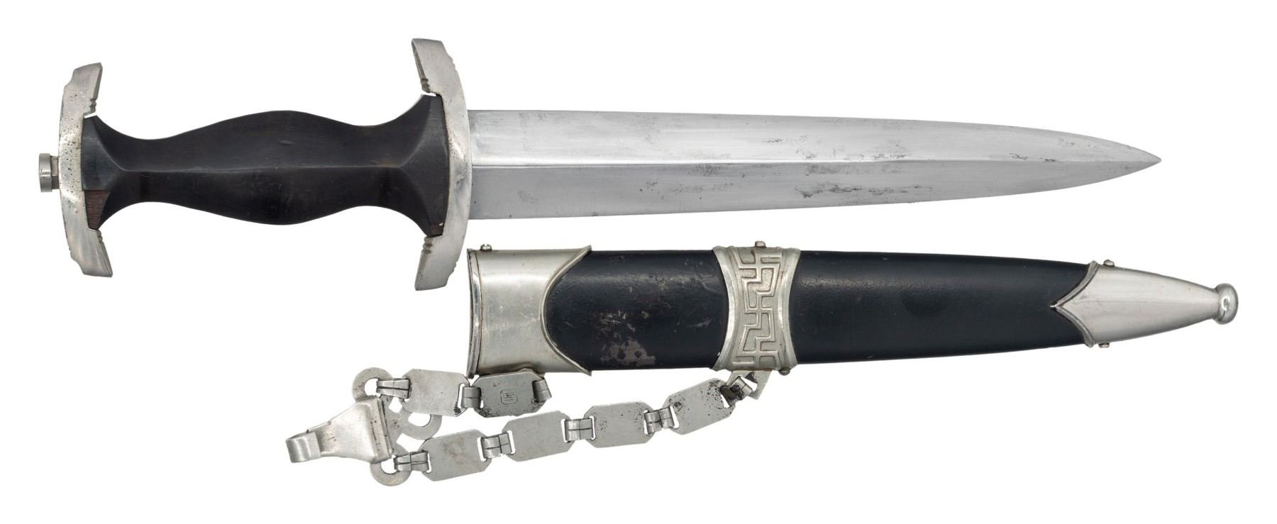 A very fine and scarce WWII German SS officer's chained dagger with an overall length: 14 7/8". Blade is etched "Meine Ehre Heisst Treue". The blade has no maker's mark, as is normally seen on the chained SS dagger. Plated crossguard and pommel guard with blackened wood grip. Grip has an inset eagle and black enameled SS button near the top. Scabbard shows a black enameled finish with plated mounts. The nickel silver chain is non-magnetic featuring alternate links bearing SS runes and the death's head insignia. The rune link nearest the throat has the SS runic proof inside a square with chamfered corners on the reverse. CONDITION: blade shows scabbard wear mixed with the remaining original factory finish. Mounts retain nearly all of their original finish. Scabbard shows light overall wear with some minor finish loss. The clip at the top of the chain is missing its spring. (02-24999/BF). NON-GUN. $4,000-6,000.